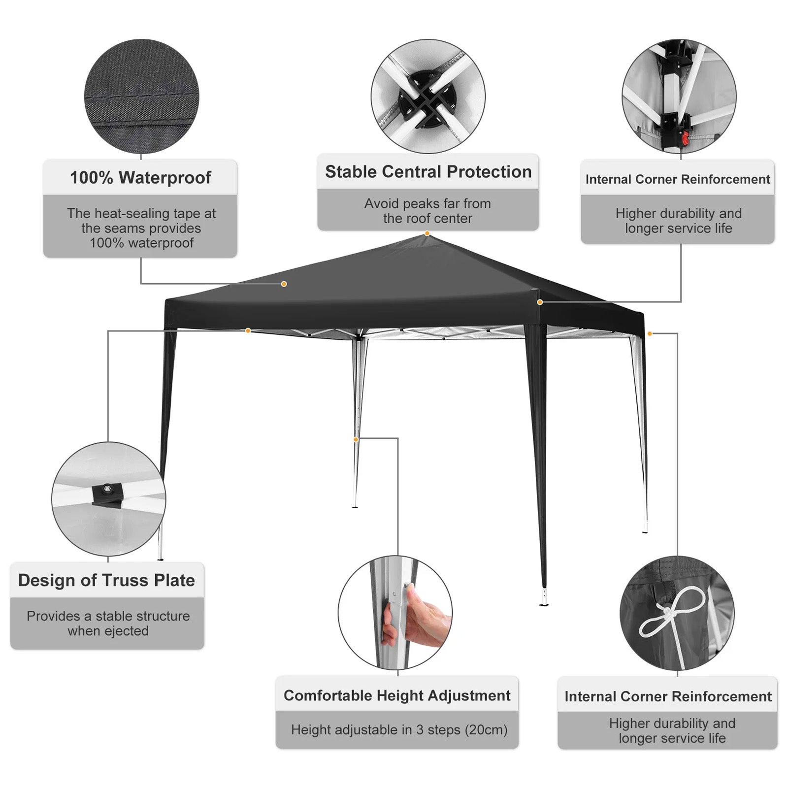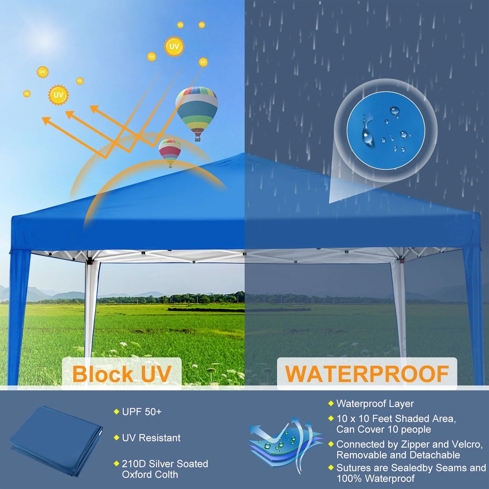 - ãWaterproof & Anti-UVãThe 10x10 outdoor party tent features a roof made of 210D oxford cloth with silver & PU(2000) coating, providing 99% UV protection and complete waterproofing. The seams are sewn with high density stitching and treated with waterproof material under high temperatures and pressure.10x10 ez up canopy tent offers excellent coverage and shade.