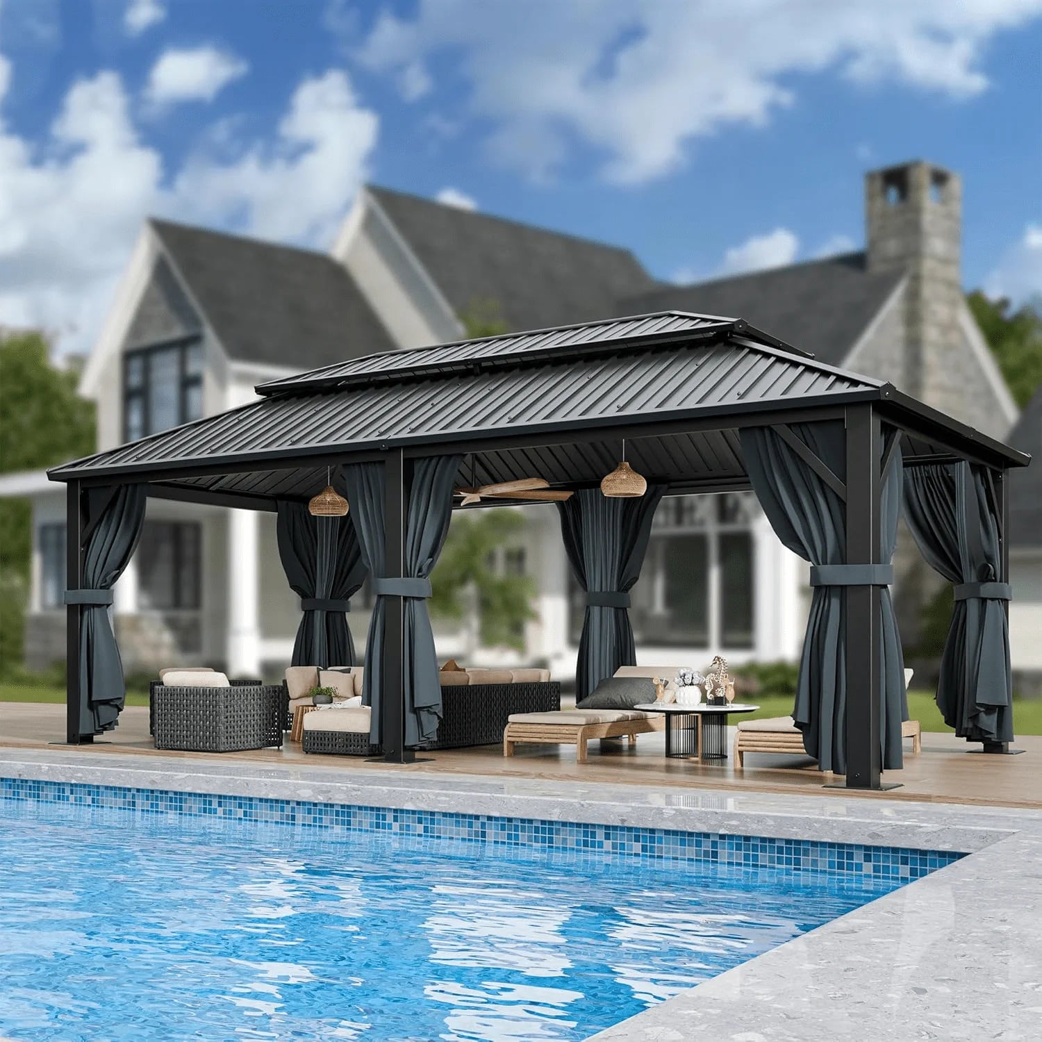 【HUMAN-CENTERED DESIGN】The hardtop gazebo features a double-track system for smooth sliding. The CPAI-84 flame-resistant curtains provide excellent privacy and protection against fire, tear, UV rays and rain. The sidewall mosquito netting with two-side zippers and top netting allow for proper ventilation against pests. Equipped with two hooks on the top, hard top gazebo can be used to hang the lights or fans to enrich the gazebo for patios.