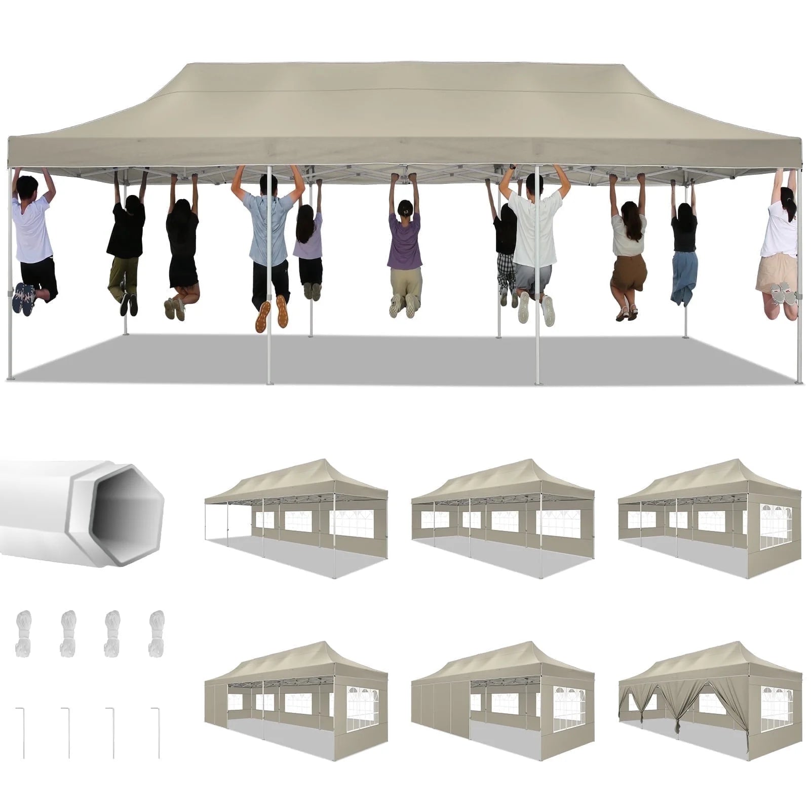 - 1 x 10'x30' Heavy Duty Canopy Frame 1 x 10'x30' 420D Oxford Fabric Top Cover 3 x Sidewalls with Zipper Door +5 x Sidewalls with Windows 4 x Ground Nails 4 x Ropes 1 x User Manual