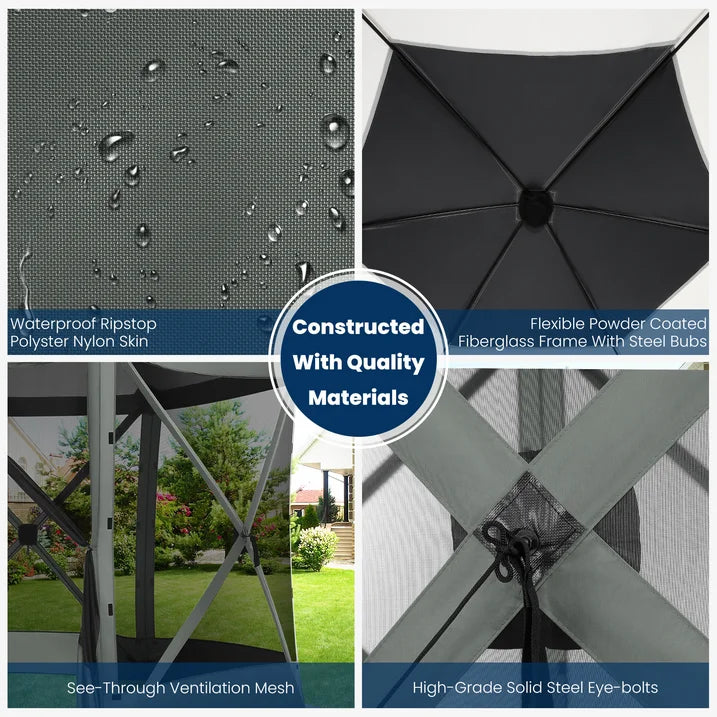 Reinforced Corners: Each corner of the pop-up screen tent is reinforced with an extra layer of fabric and high-strength pole pockets. All these help to extend the life of the gazebo for a longer time.