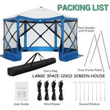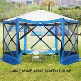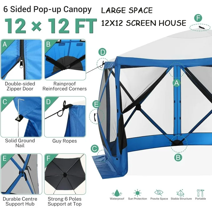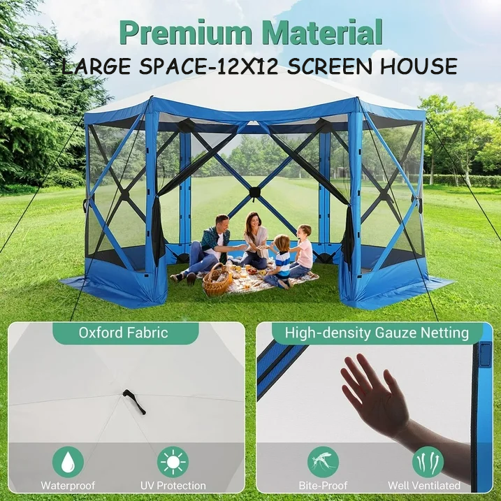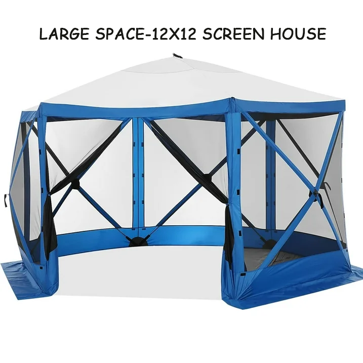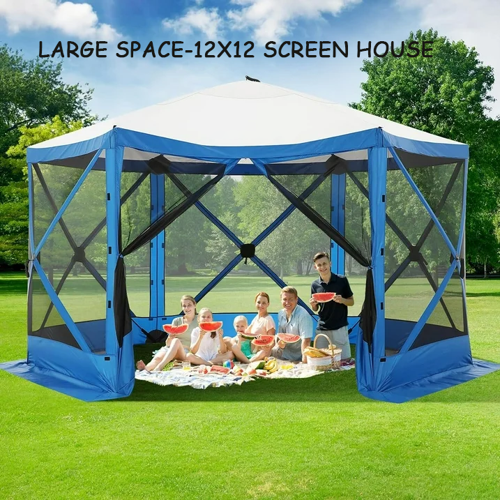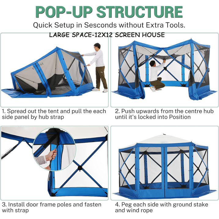 Spacious and Comfortable -- This 12 x 12-foot screen tent for camping has plenty of room for up to  10 people and furniture, with a high ceiling that provides ample headroom. This screened in canopy with hub design Pop-up structure frame, very easy to set up and take down in  40 seconds.