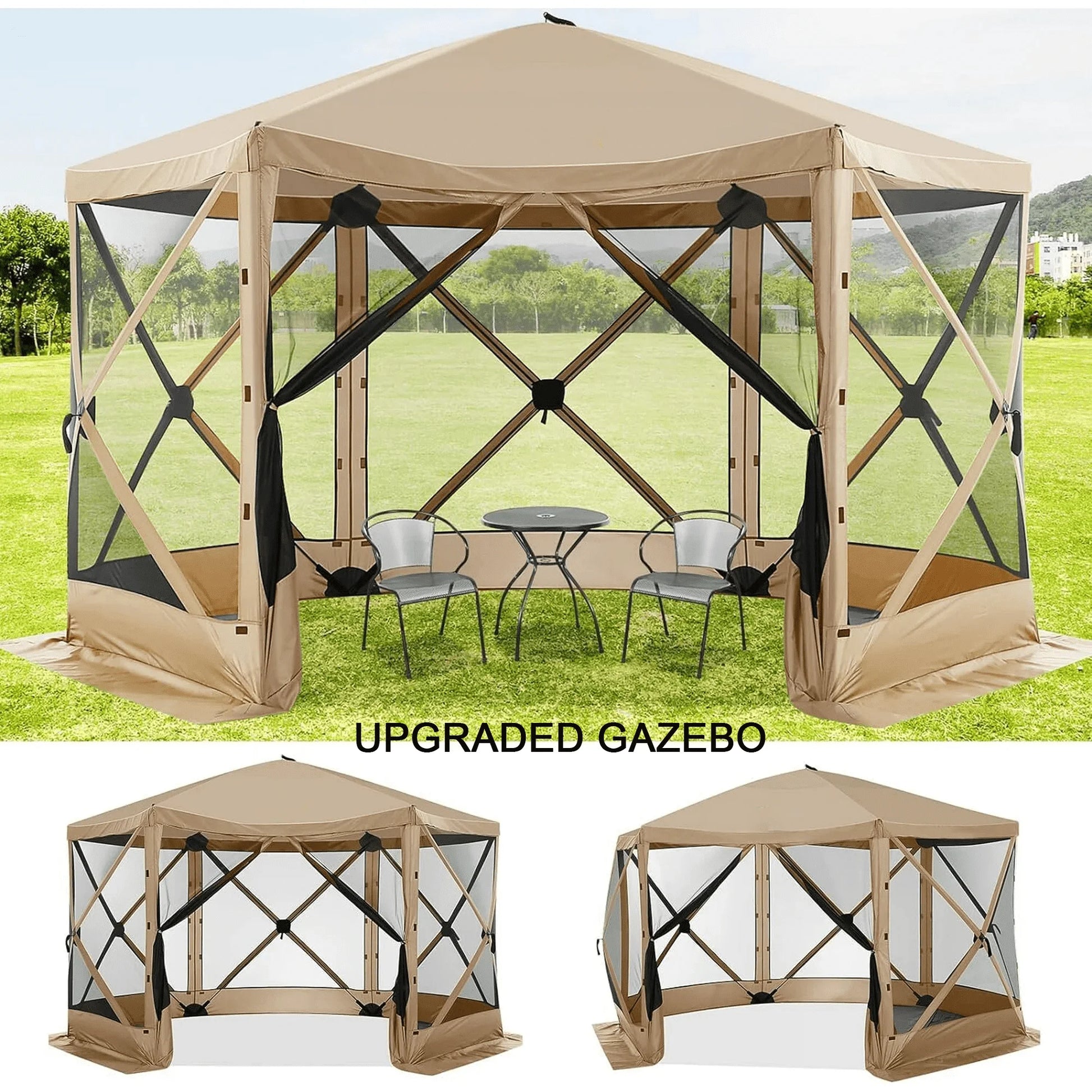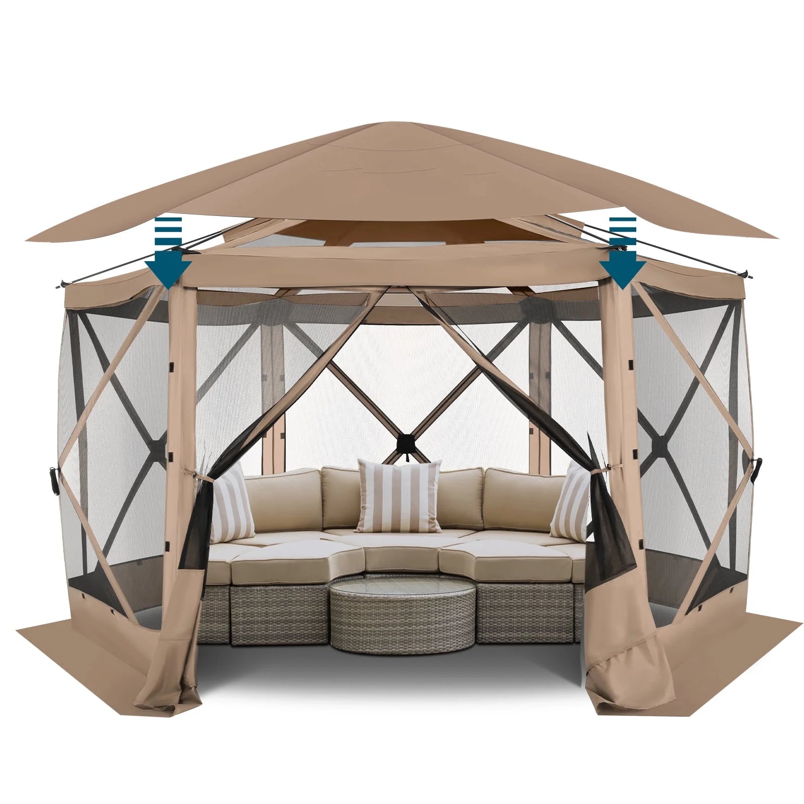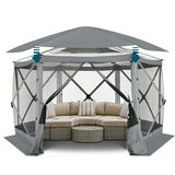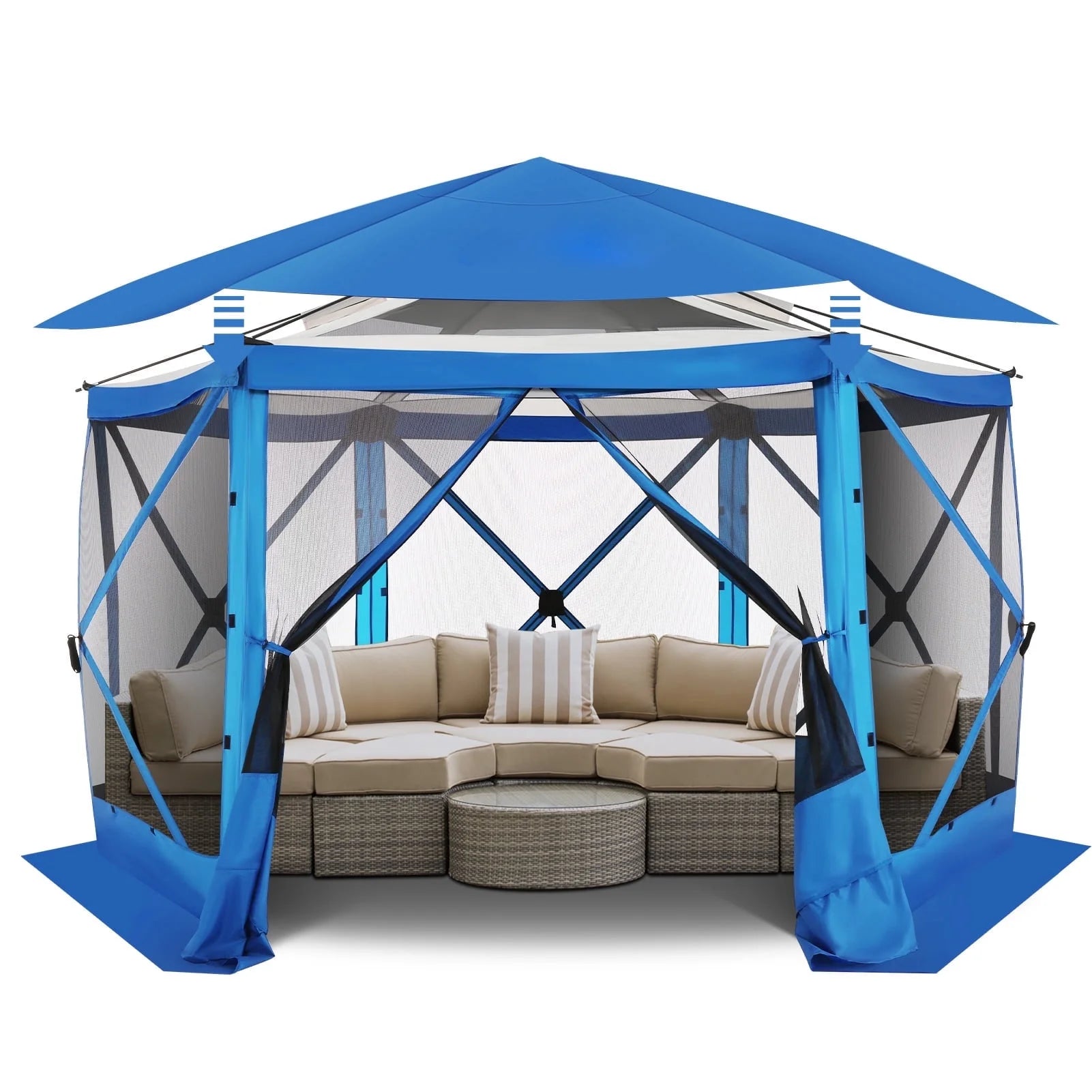Mesh Screened -- The  hexagonal pop up tent is screened to keep unwanted elements away and let fresh air & light in. With aprons and gazebo skirts on all sides, it offers bug-free protection.