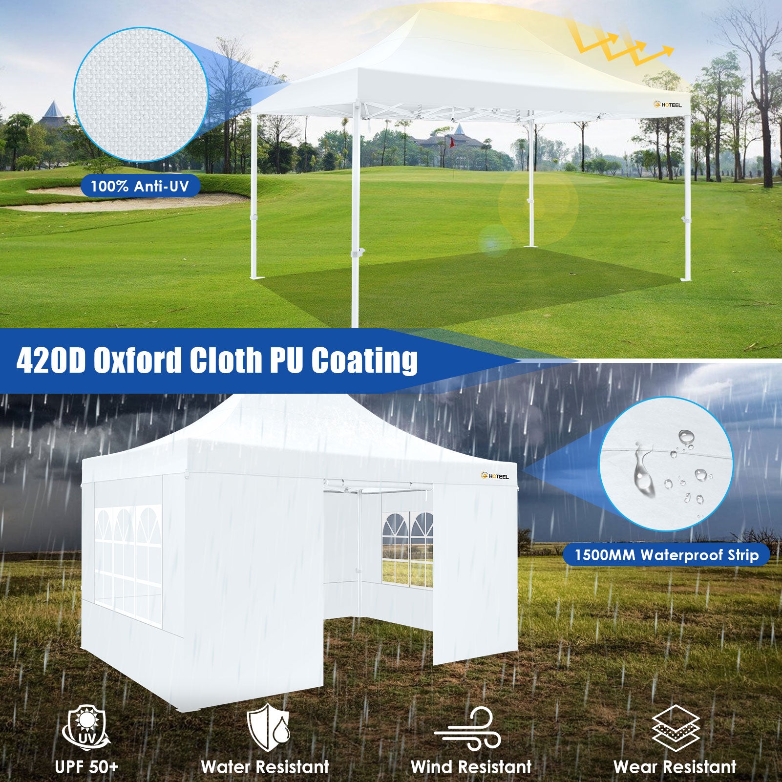 - 【Premium Fabric 100% Waterproof & UPF 50+ & 5 Level Windproof】 HOTEEL Canopy Tent 10x15 is made of 420D oxford fabric with waterproof strip. Waterproof pressure 2.1Psi. The waterproof level reaches 2000mm! Most tents only 1500mm. UPF 50+, blocks 99% of the sun's rays. The PU coating is more light-transmitting, which can keep the light. Level 5 winds. 4 pieces of 210D PA coated removable sidewalls are attached by the whole Velcro strip to provide protection for outdoor events.