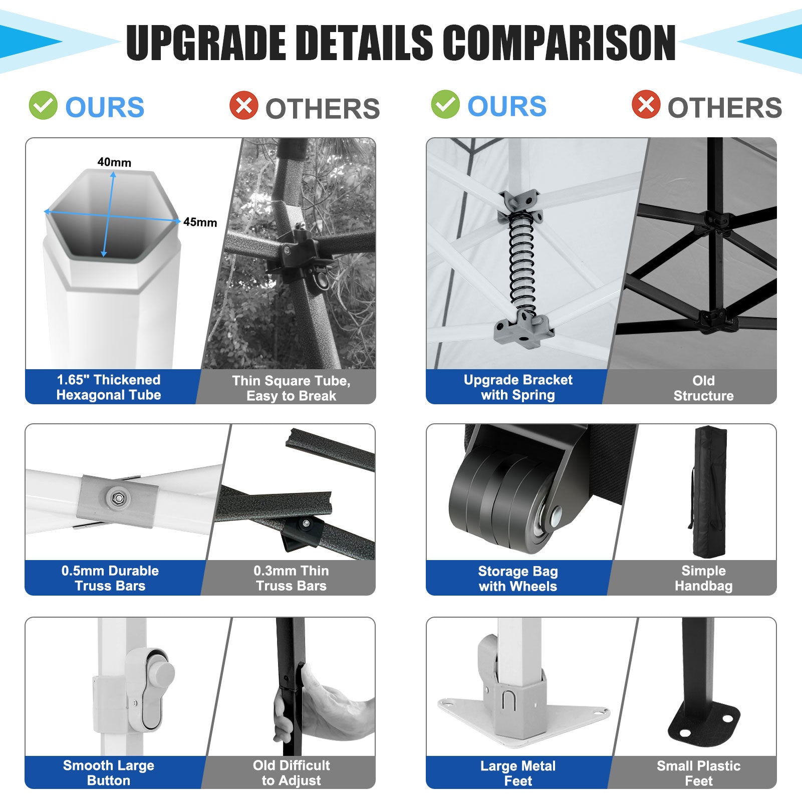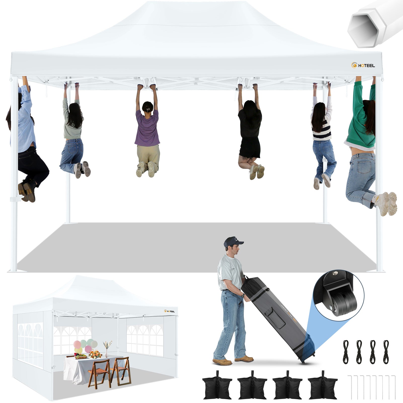 - 【Upgrade Heavy Duty Canopy Frame】 HOTEEL 10x15 Heavy Duty Pop Up Canopy Tent with Sidewalls is made of a commercial-grade full truss structure, durable and rustproof. Upgrade the Spring Design of the top bracket, which can tighten the top cloth and effectively reduce the problem of water accumulation. Upgrade thickened hexagonal tube, which diameter is 1.77''(45mm) and the tube thickness is 0.03''/0.7mm, while most party tent are only 0.98'' in pipe diameter and only 0.02'' tube thickness.
