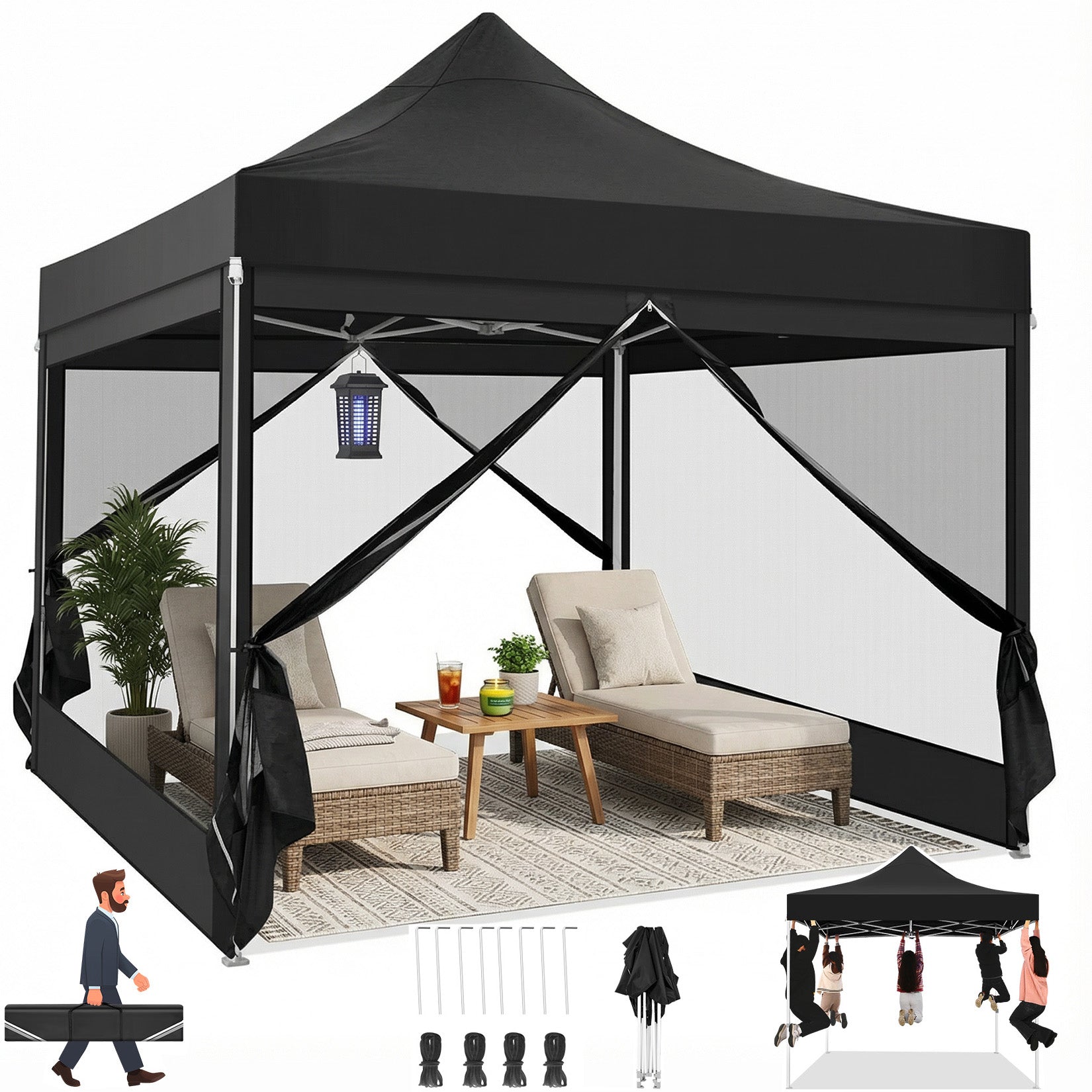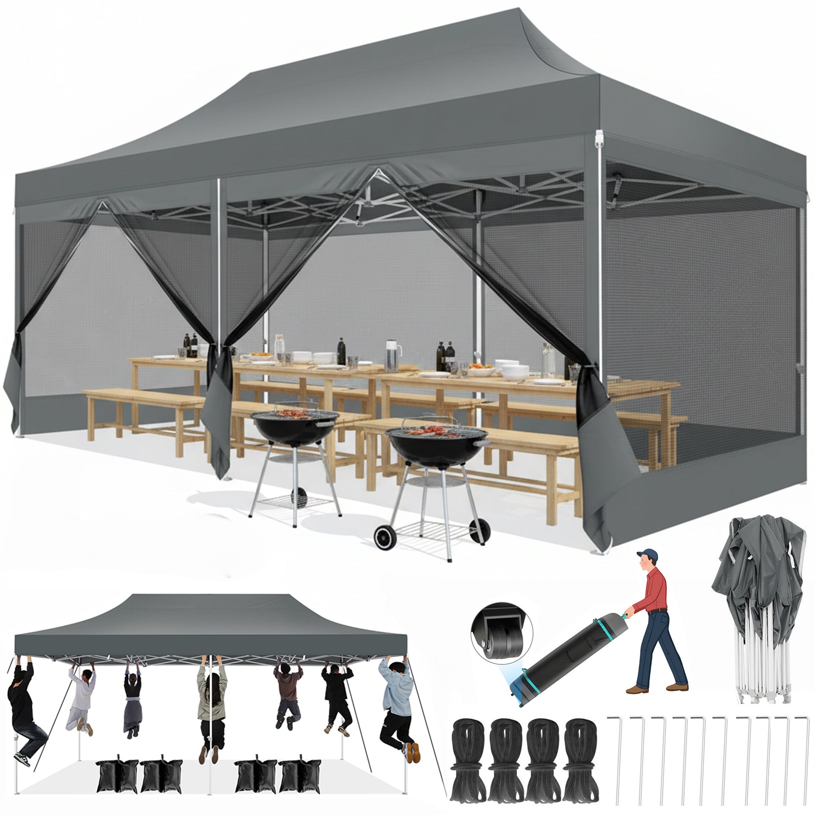 - 【Multifunctional & Removable Netting Sidewalls】The Netting sidewalls of this pop up gazebo allow you to breathe in the fresh air, feel the cool breeze, enjoy the view and fully experience nature while being free from mosquitoes. This 10x15 canopy with sidewalls is for you who love outdoor life!