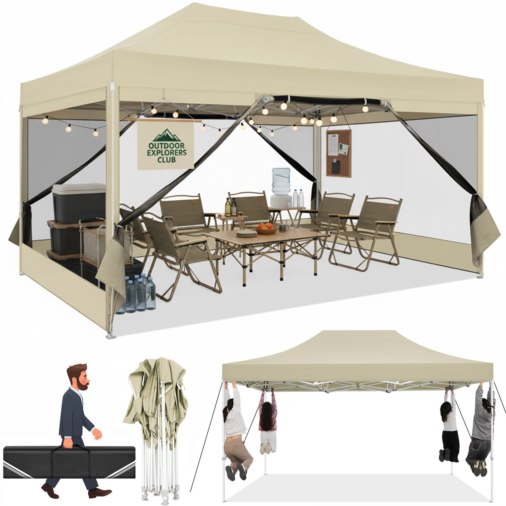 - 【Easy up Canopy Tent】This carpas para patio is easy and quick to set up and put down, 2-4 people can quickly set up this outdoor canopy 10x15 in minutes without tools and fold it up when not in use, which greatly saves your precious time and energy.