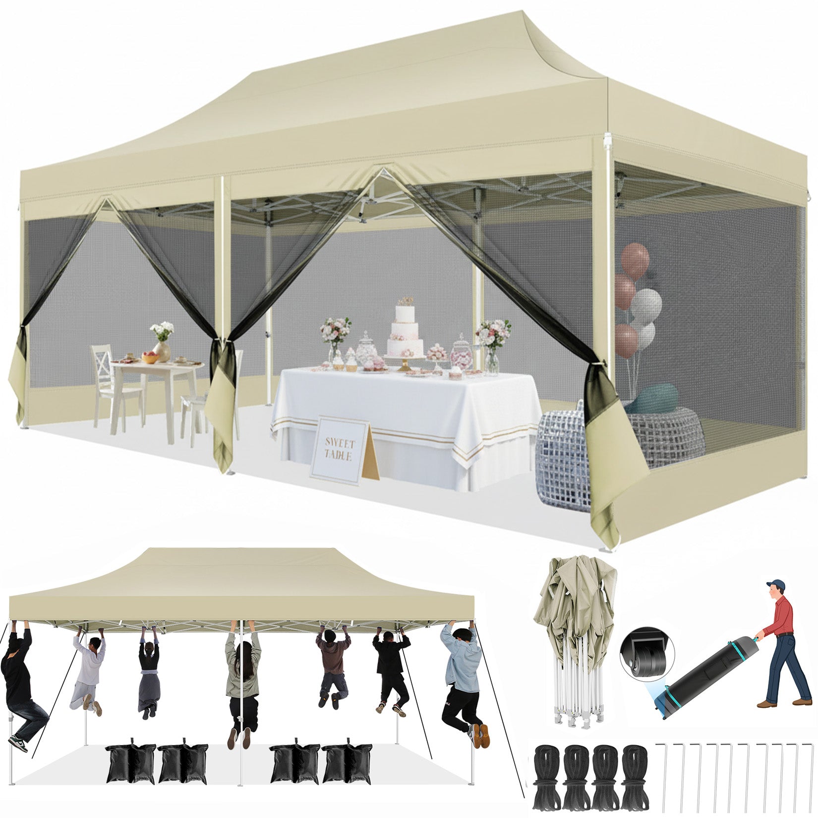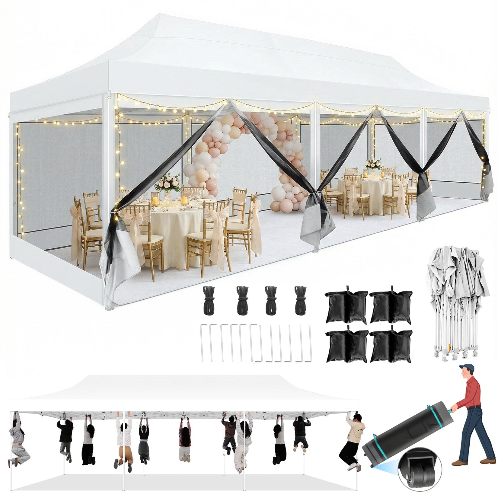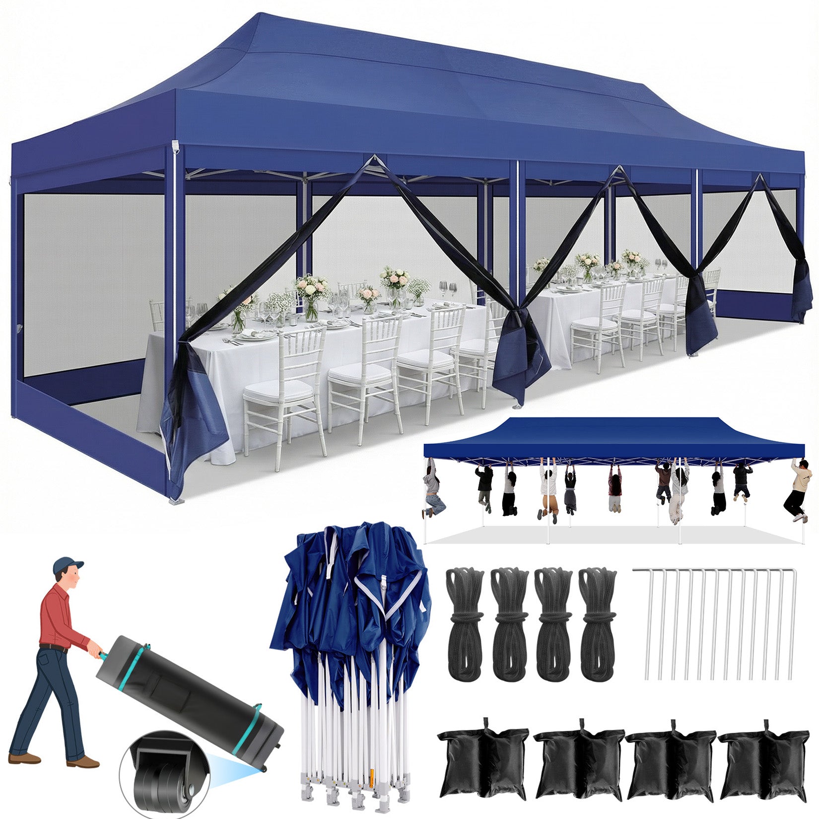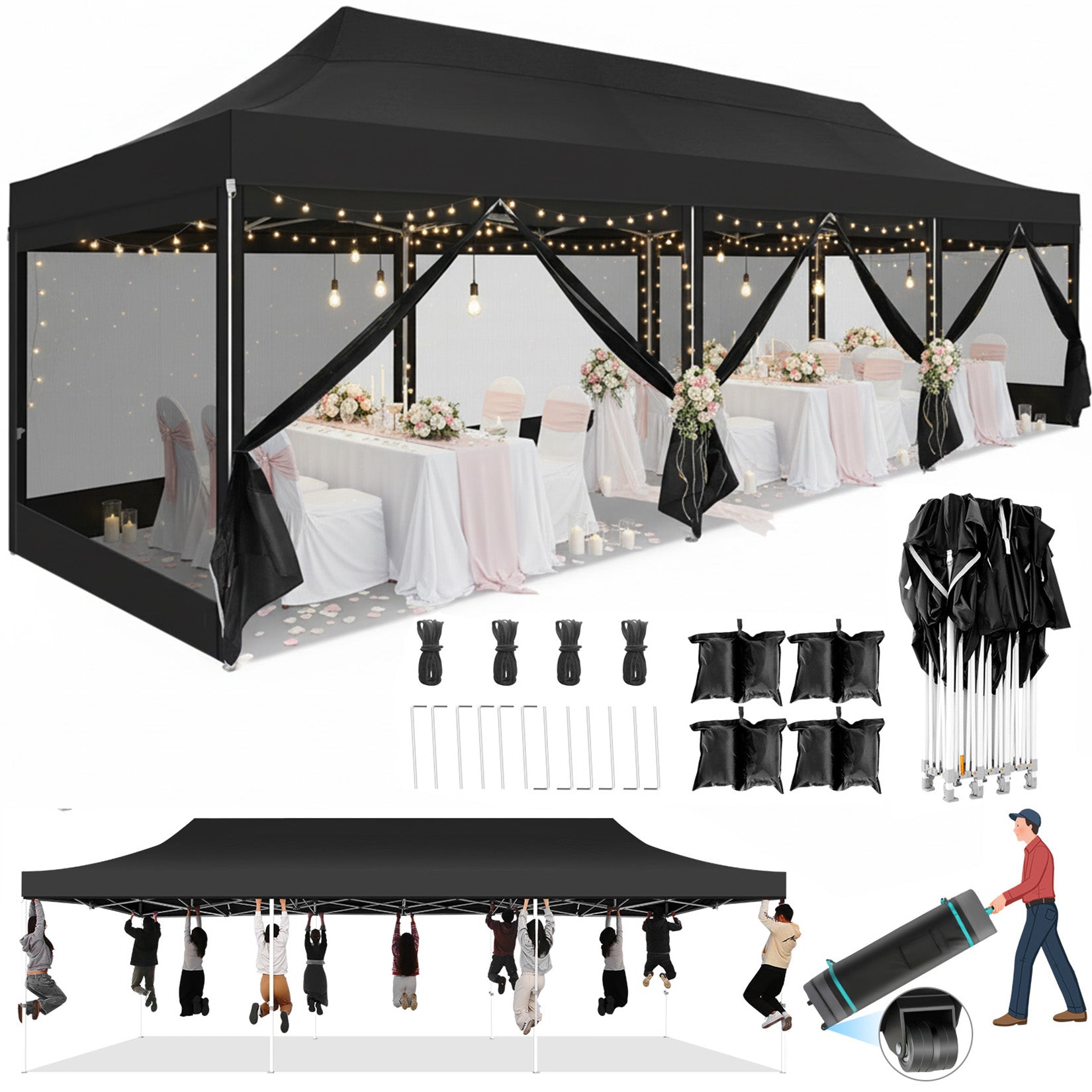 The COBIZI 10x50 pop-up Canopy Heavy Duty Tent is a Portable Waterproof Canopy suitable for various activities such as backyard gatherings,weddings,birthday parties,and barbecues.The easy up tent's mesh cover design ensures ventilation while effectively preventing insect intrusion. It also features waterproof and anti-uv properties,providing a comfortable shelter whether it's sunny or rainy. The design with sidewalls offers additional protection and privacy. Moreover,the pop-up design makes the tent's installation and disassembly quick and convenient. 10x50 size,its design makes it easy to carry and store.