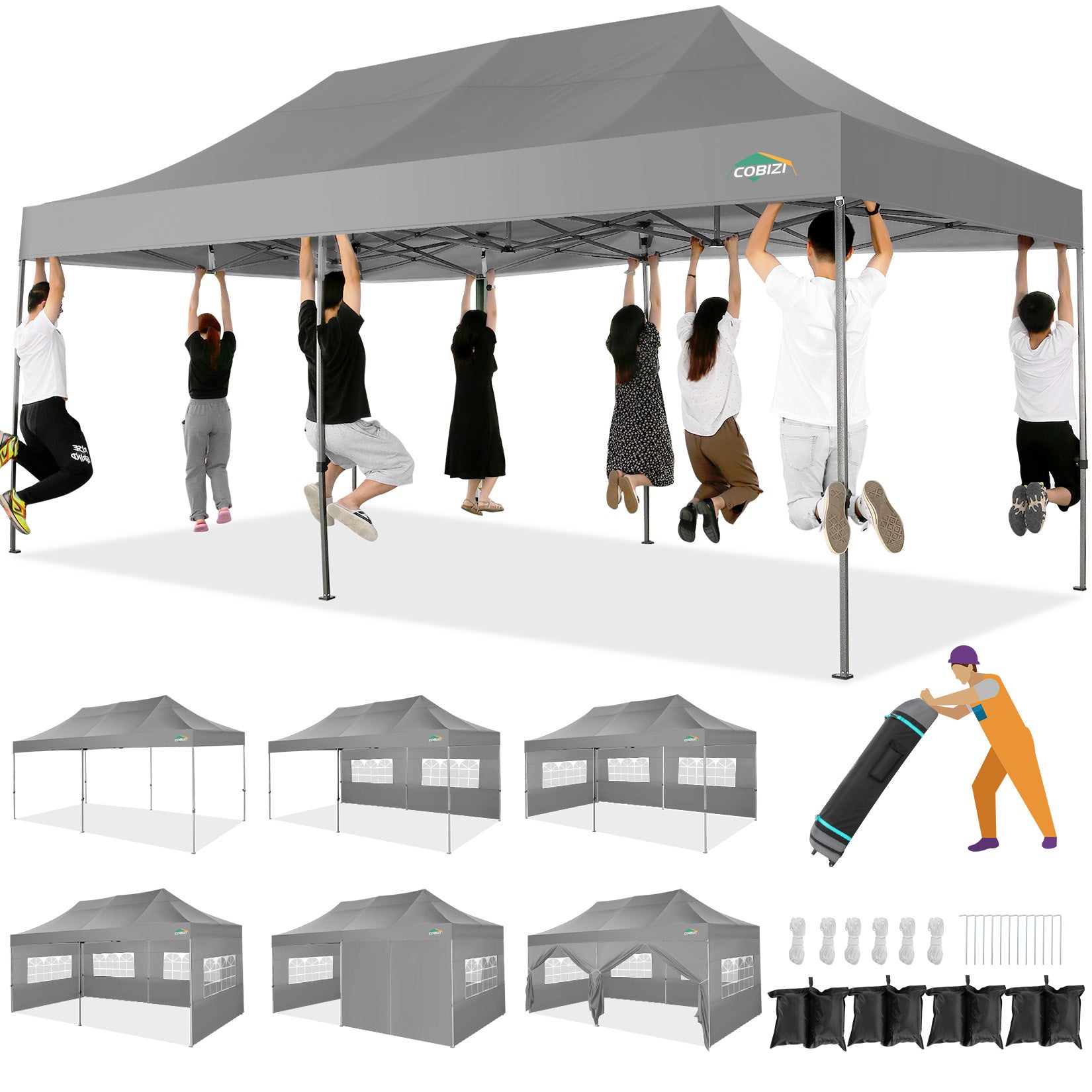 COBIZI 10x20 Heavy Duty Pop up Canopy Tent with 6 sidewalls Easy Up Commercial Outdoor Canopy Wedding Party Tents for Parties All Season Wind & Waterproof Gazebo with Roller Bag,Gray(Frame Thickened)