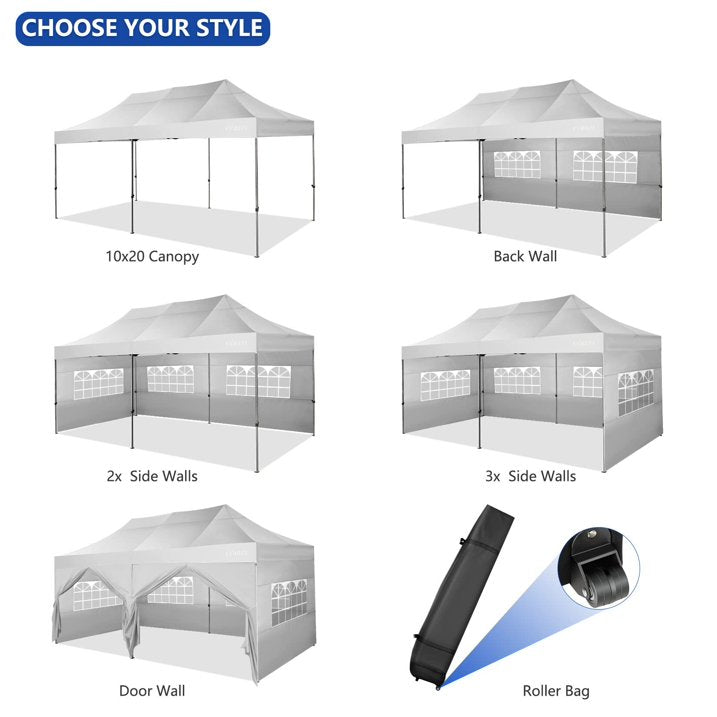 10x20 commercial canopy frame is full truss construction with powder coated, durable and rustproof. Party tent is made of 420D high quality Oxford with two layers of PU coating, UPF 50+, blocks 99% of the sun's rays. Seams are fully sealed to prevent water leakage, 100% waterproof. 6 PU coated removable sidewalls are connected by a whole strip of Velcro and zipper for tying frame top and legs. You can install different number of sidewalls according to your needs. Upgraded strong wheels and reinforced handle, easy to move and transport.