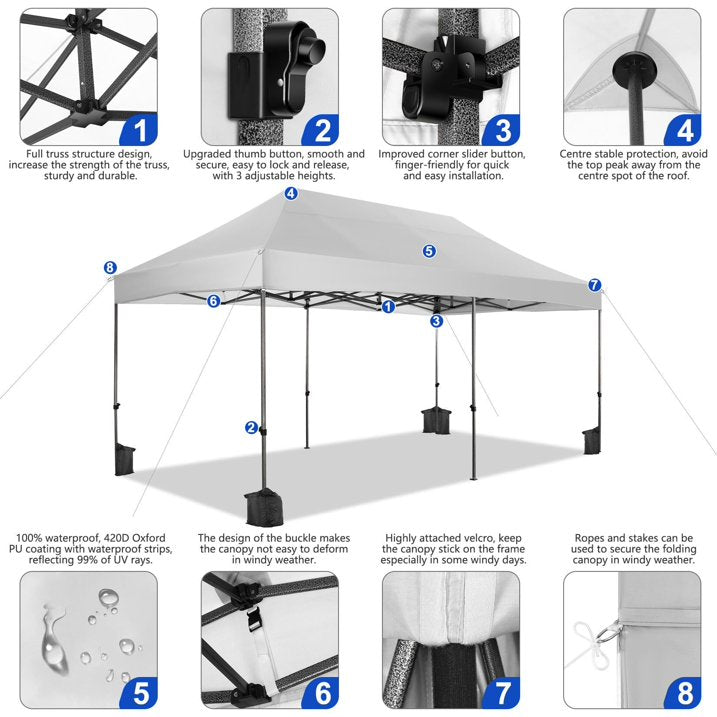 ☃️【Quick & Easy Setup, 3 Heights】10x20 Pop up tent can be quickly installed and dismantled by 2-3 people in minutes without tools, easily accommodates 15-20 people. You can adjust heavy duty canopy in 3 different heights (86", 90", 94") according to your needs with thumb button.