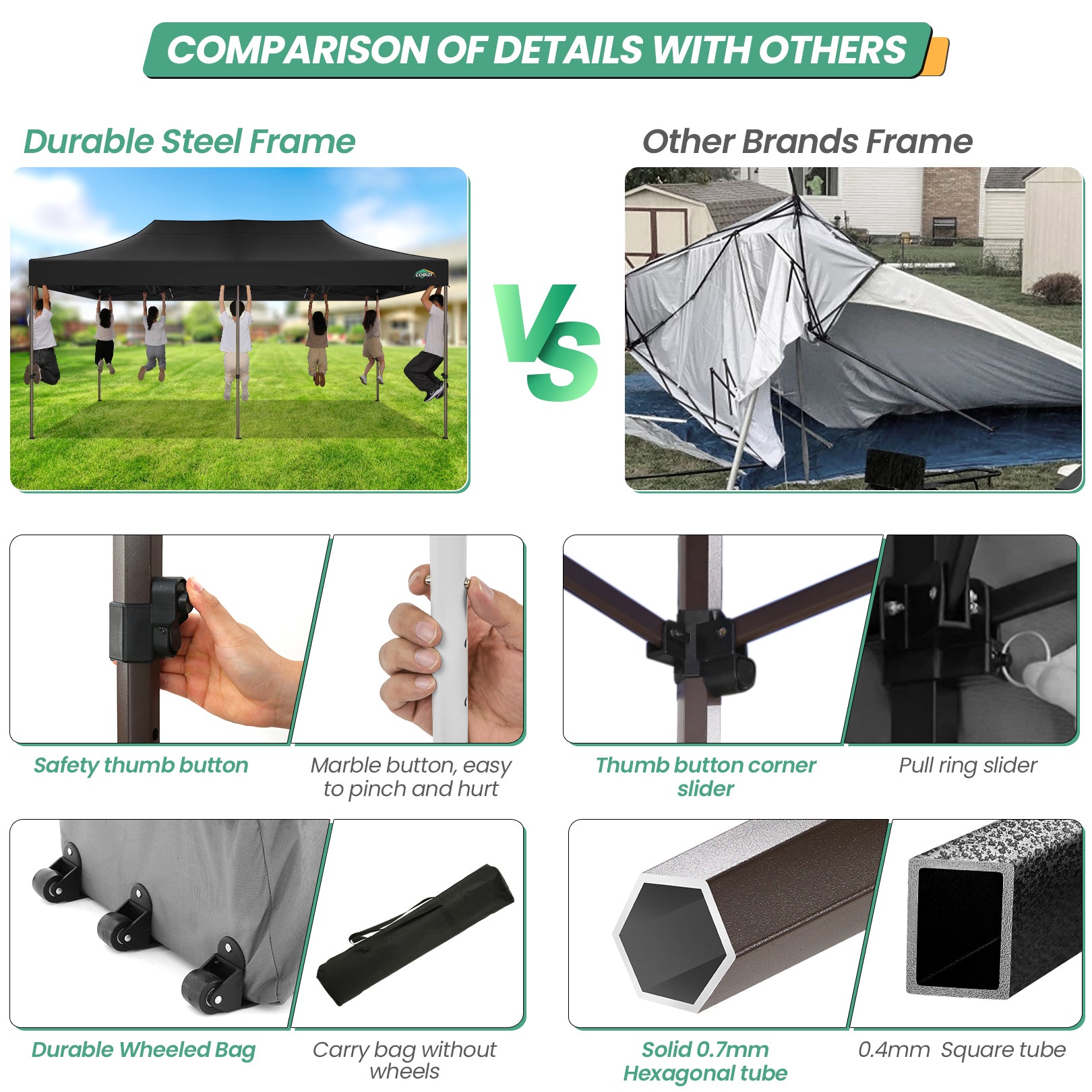 🐱🏍【Upgrade Heavy Duty Canopy】 The COBIZI 10x20 Heavy Duty Canopy features a commercial-grade full truss structure constructed from durable powder-coated stainless steel. The thickness of the 1.77 inch (45mm) hexagonal legs has been increased to 0.7mm/0.03 inches, providing superior stability and durability. Full truss design ensures exceptional sturdiness and rust resistance, capable of withstanding wind speeds of up to 30mph when properly secured with an number of sandbags, ropes, and stakes.