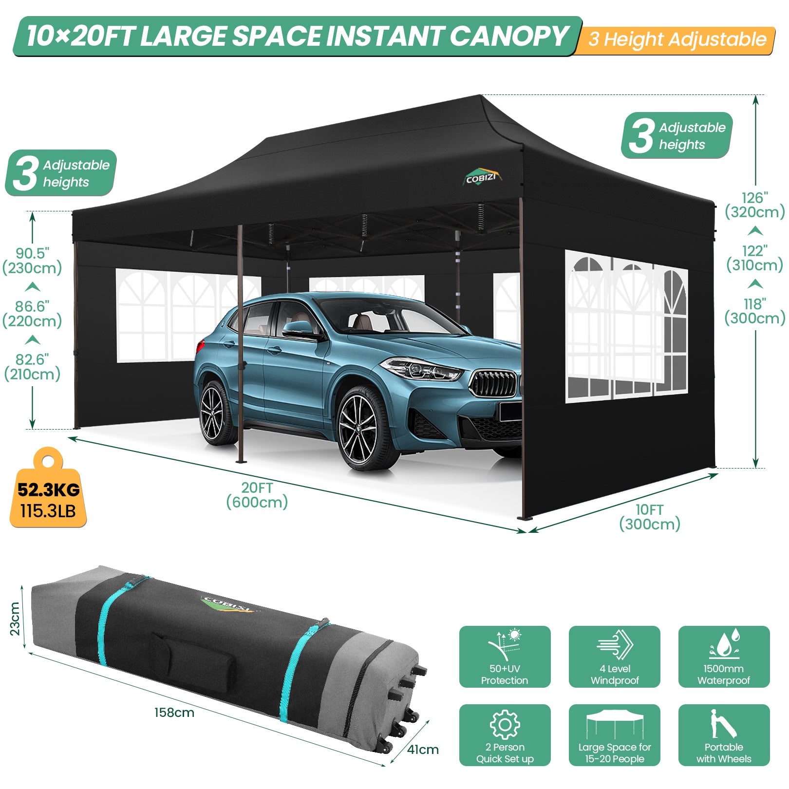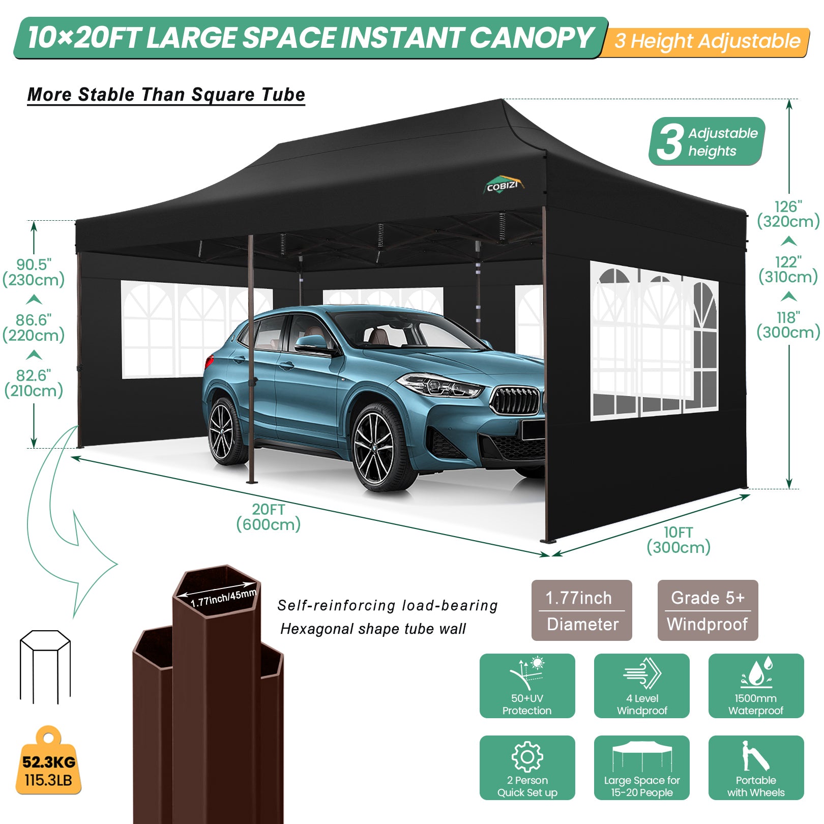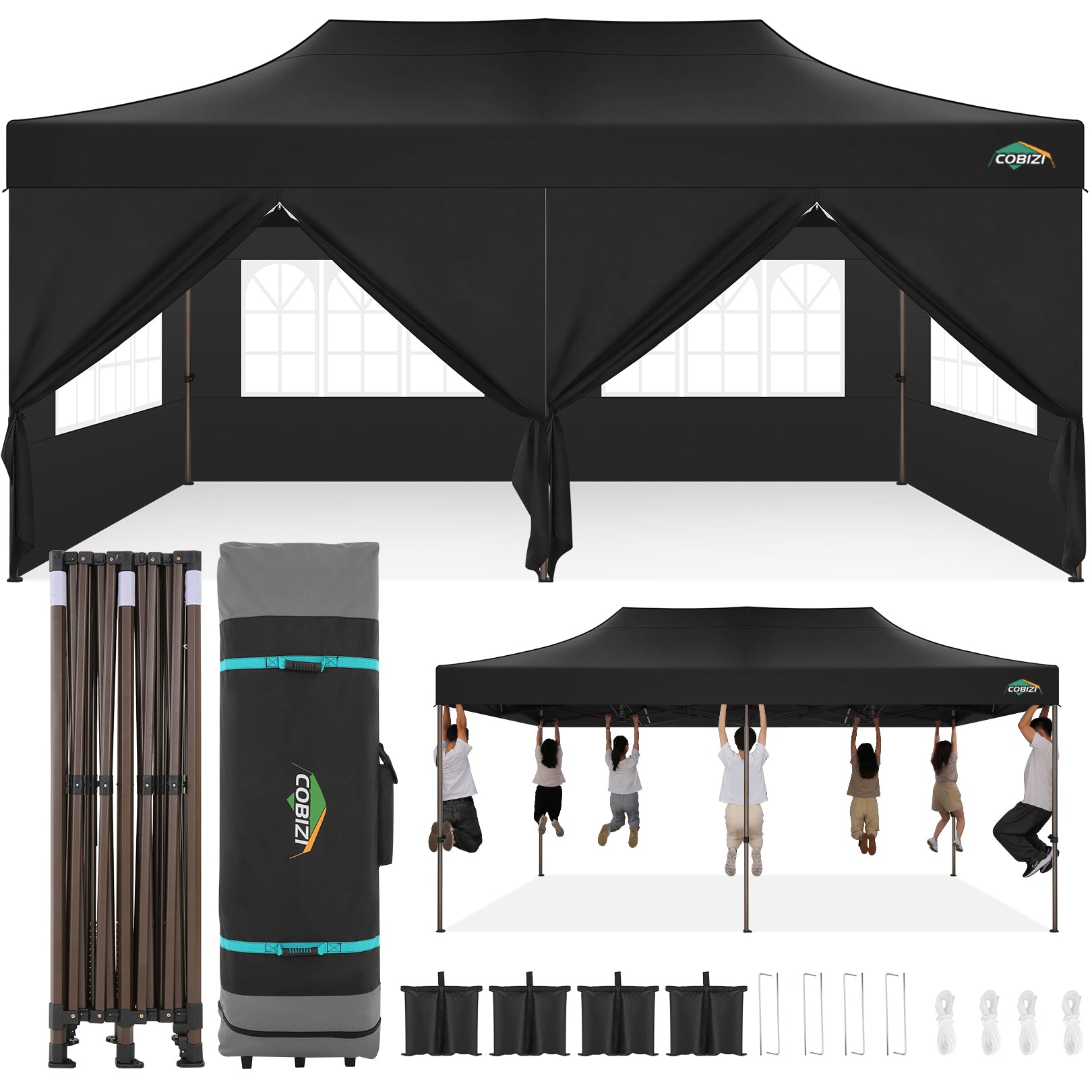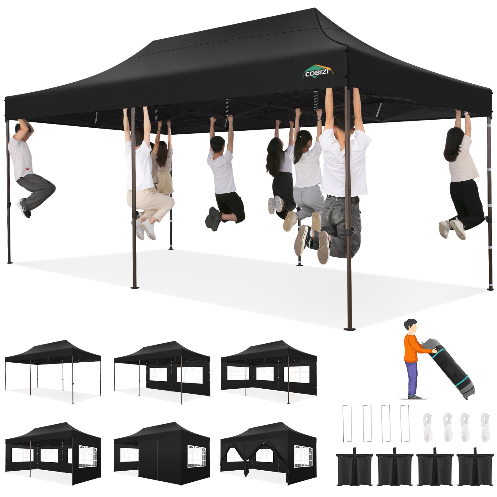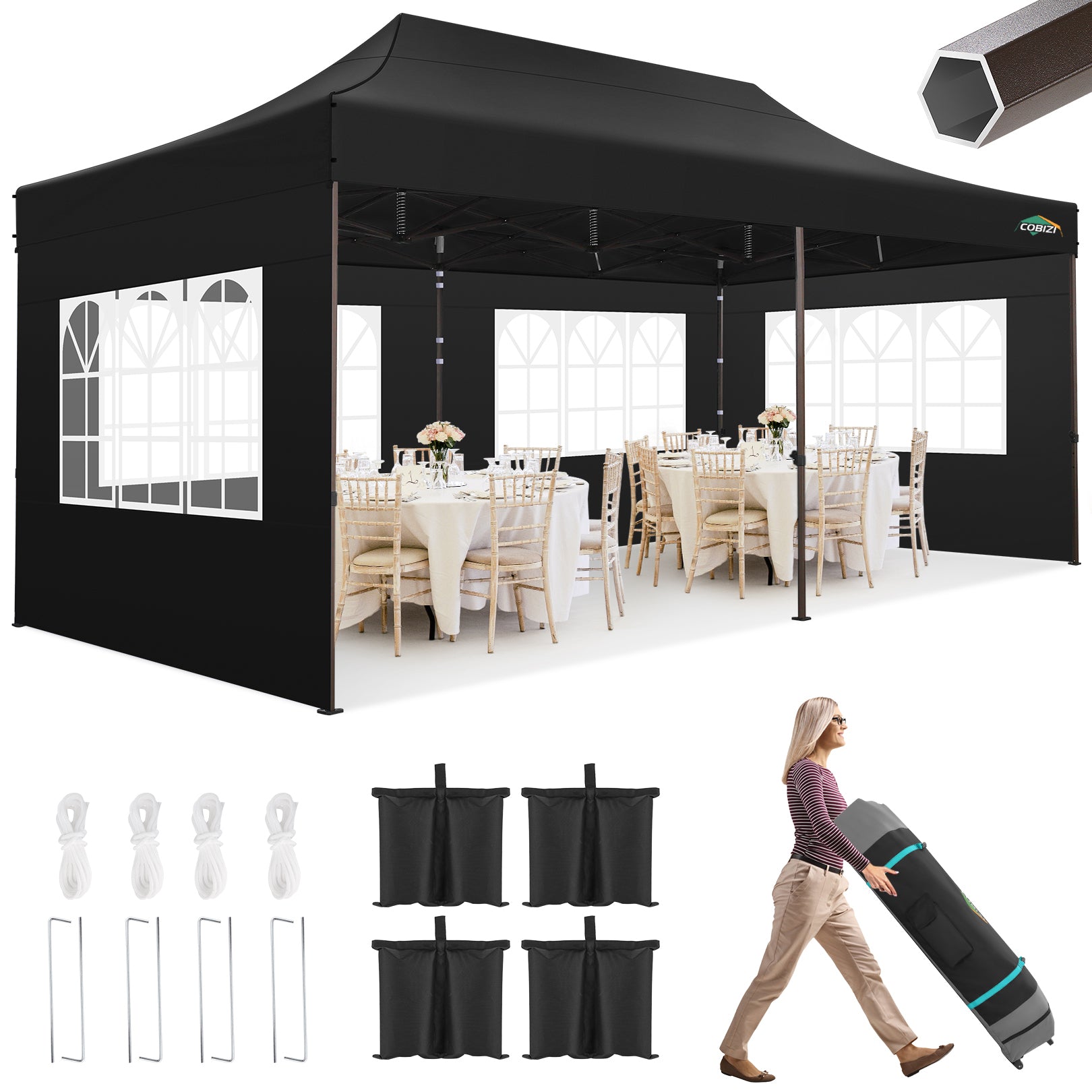 COBIZI 10x20 Pop Up Canopy Tent Heavy Duty with 6 Removable Sidewalls, Commercial Heavy Duty Pop Up Tent for Parties All Weather Waterproof and UV 50+ Wedding Tent with Roller Bag(Black)