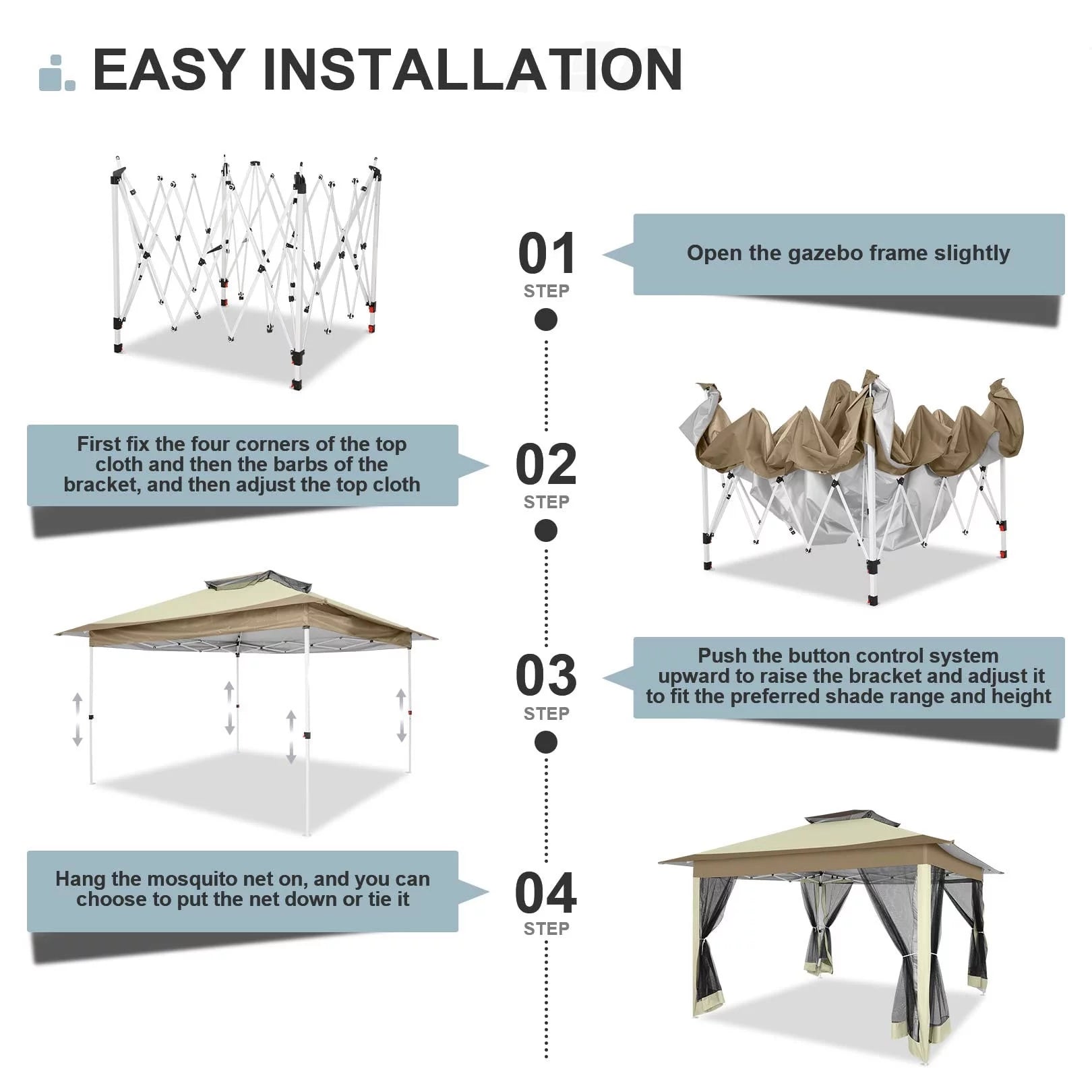 🐱‍🏍【Quick&Easy Set up】 All the parts of the installed frame are already assembled, you can install the outdoor canopy in 1 minute without any tools. When the patio gazebo is raised, the eaves extend automatically, no additional installation required. The 3 adjustable heights(6.2ft/6.5ft/6.8ft) can meet your different needs.