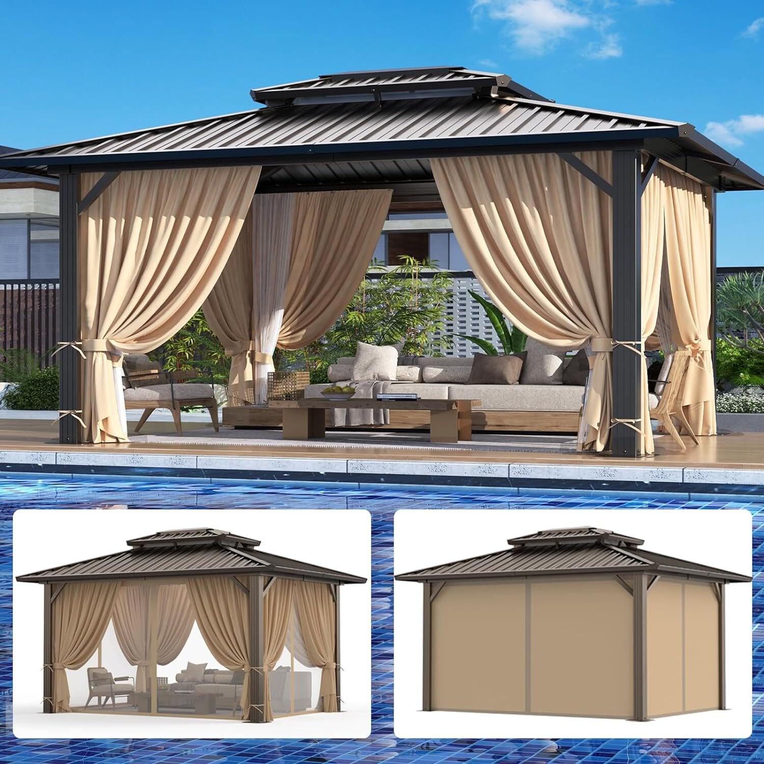 【HUMAN-CENTERED DESIGN】The hardtop gazebo features a double-track system for smooth sliding. The CPAI-84 flame-resistant curtains provide excellent privacy and protection against fire, tear, UV rays and rain. The sidewall mosquito netting with two-side zippers and top netting allow for proper ventilation against pests. Equipped with two hooks on the top, hard top gazebo can be used to hang the lights or fans to enrich the gazebo for patios.