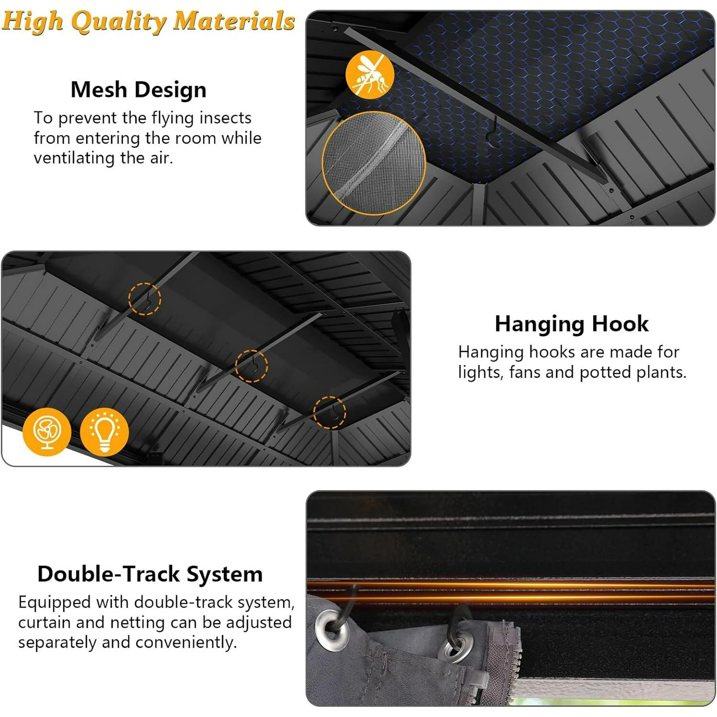 [Premium All-Season Privacy & Protection] Features a dual-track sliding system with CPAI-84 flame-retardant curtains for enhanced safety and privacy. The breathable netting with double-sided zippers keeps pests out while maintaining airflow. Two built-in ceiling hooks let you add lights or fans to create a cozy outdoor haven.