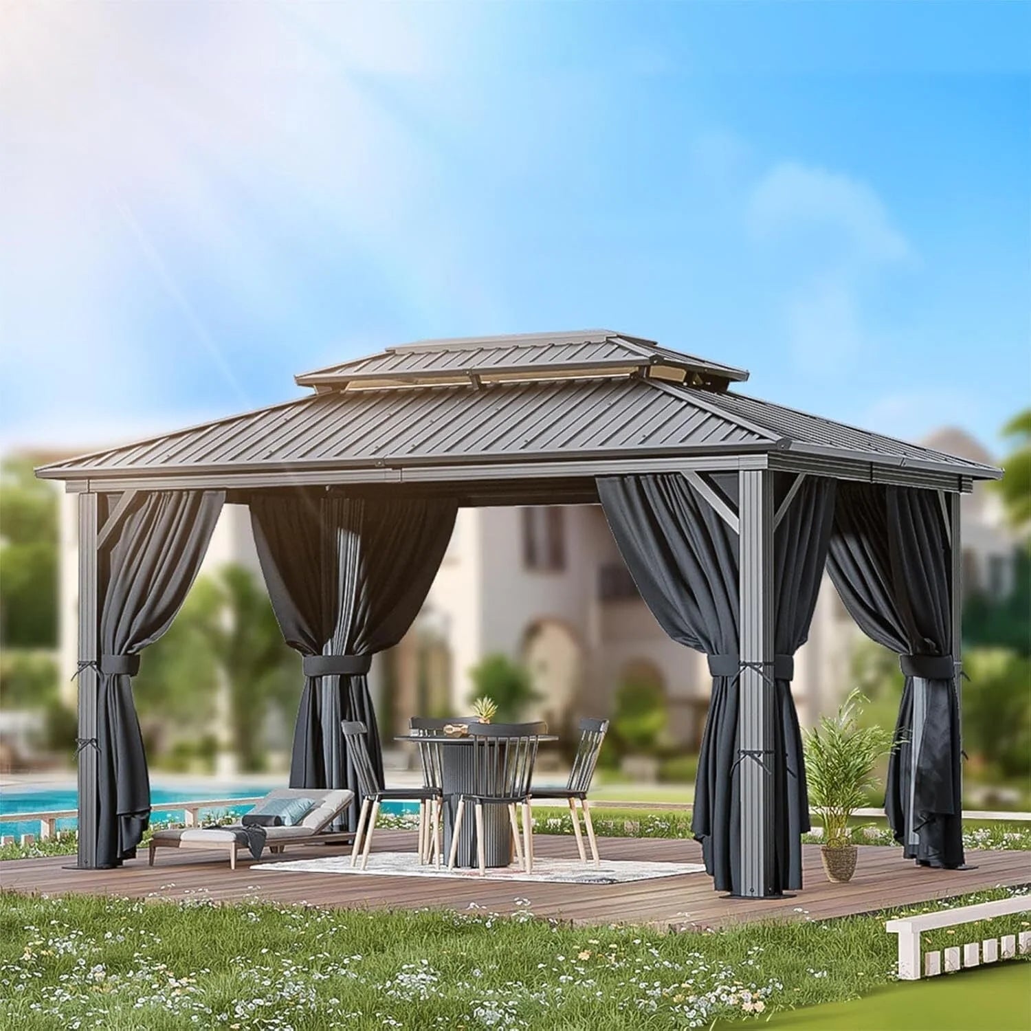 【Ventilated Double Roof】This upgraded gazebo 12x20 features a heavy-duty galvanized steel roof that provides better protection from harmful UV rays and promotes air circulation and wind resistance. You can even sunbathe under this hardtop gazebo without worrying about getting sunburned.