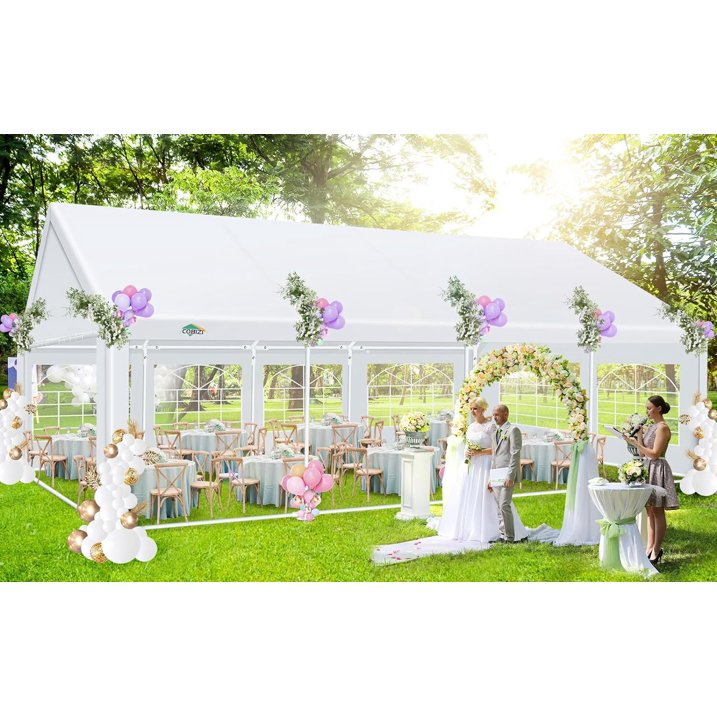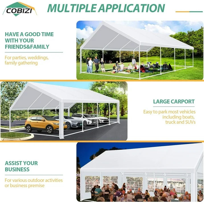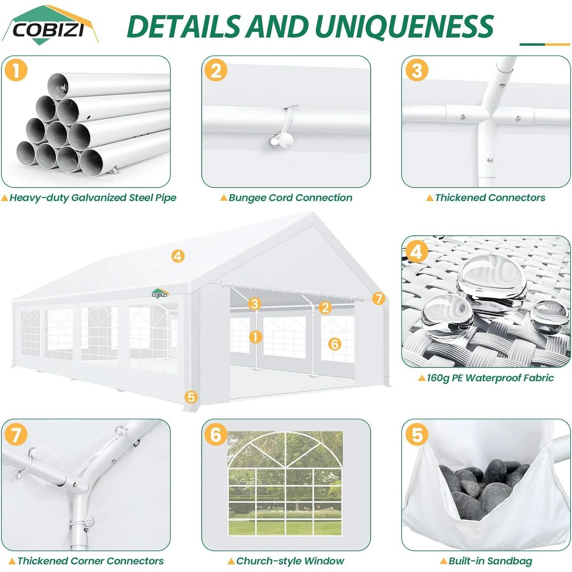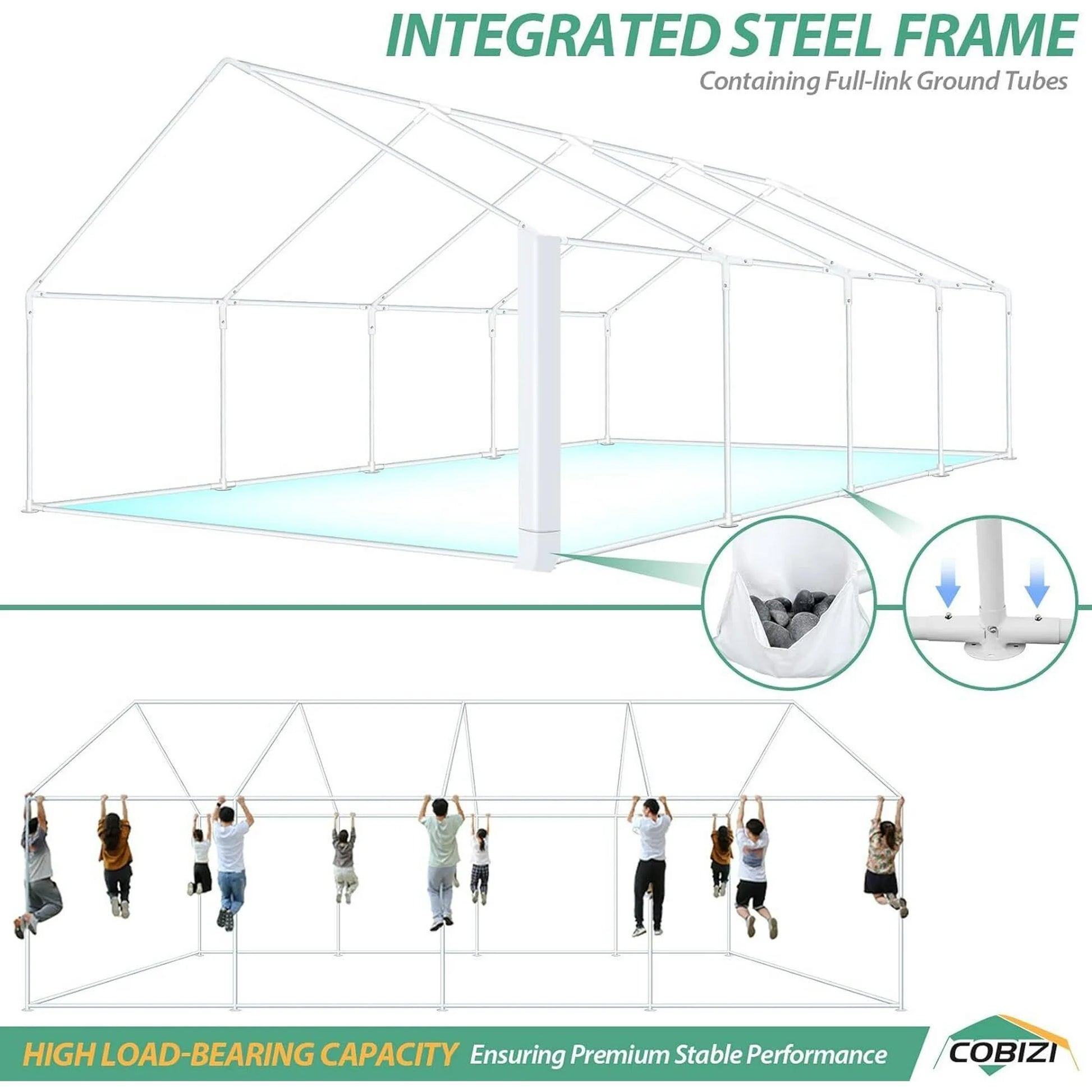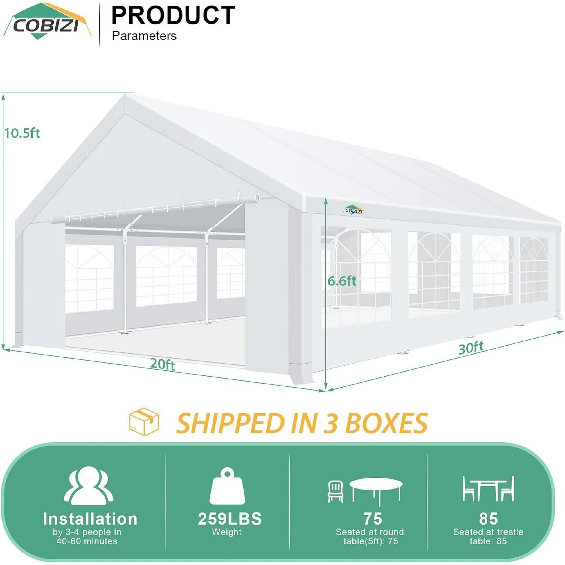 Key Features:【Multifunctional Usage】Explore the versatile usage of our 20x30ft tent. It is ideal for commercial and recreational uses. You can use it for weddings, family gathering, graduation ceremonies, parties, backyard events or any events you can think of. This tent can accommodates 6 tables and is able to accommodate up to 90 people. Have an unforgettable time with COBIZI party tent series! 【Heavy Duty Structure】The integrated frame support beams form a stable structure, the whole 20x20 party tent is stable and solid while the extra fully attached ground poles make the tent more stable and more wind resistant. Please take precautions to protect your tent when wind speeds reach 25 mph or higher, using pegs and sandbags on grass or expansion screws on concrete floors. 【Upgraded Coated Frame】Our 20x30 wedding tent features an upgraded frame made of high quality, heavy duty galvanized steel. The steel tubes are 1.5 inches (38 mm) in diameter and the metal joints are 1.66 inches (42 mm) in diameter, providing strong support and stability. 【Premium Construction Material】Top cover of our white tent is made of 160g imported PE fabric, providing waterproof and UV protection.Our 20x30 Heavy Duty Canopy Tent is designed with 4 removable sidewalls and 2 zippered doors with chapel-designed windows that provide excellent cross ventilation and airflow, ensuring you have a cool and comfortable experience. Removable sidewalls also help you make special conditions for different 【Shipping and Warranty】The party tent is shipped in 3 boxes. With local warehouses, we can send tents to your home/firm as fast as next day. Our commercial tent comes with a lifetime replacement service on connectors, ground rods, ropes and elastic cords, and a 2-year warranty on tent covers and poles. We are 100% happy to resolve any issues you may have, please contact us. 【Use the tent properly】Please keep your tent away from any sources of ignition. It's advised not to use the tent during periods of heavy wind or rain, as this could potentially cause damages. Is it also for short-term use only, please do not set it up outdoors for extended periods. Please store this product in a dry environment.