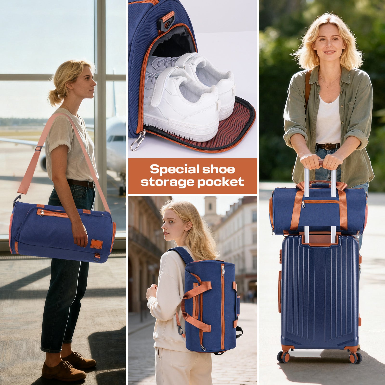• Convertible Gym Bag Set: Multi-carry gym bag switches between backpack, crossbody, and handheld.