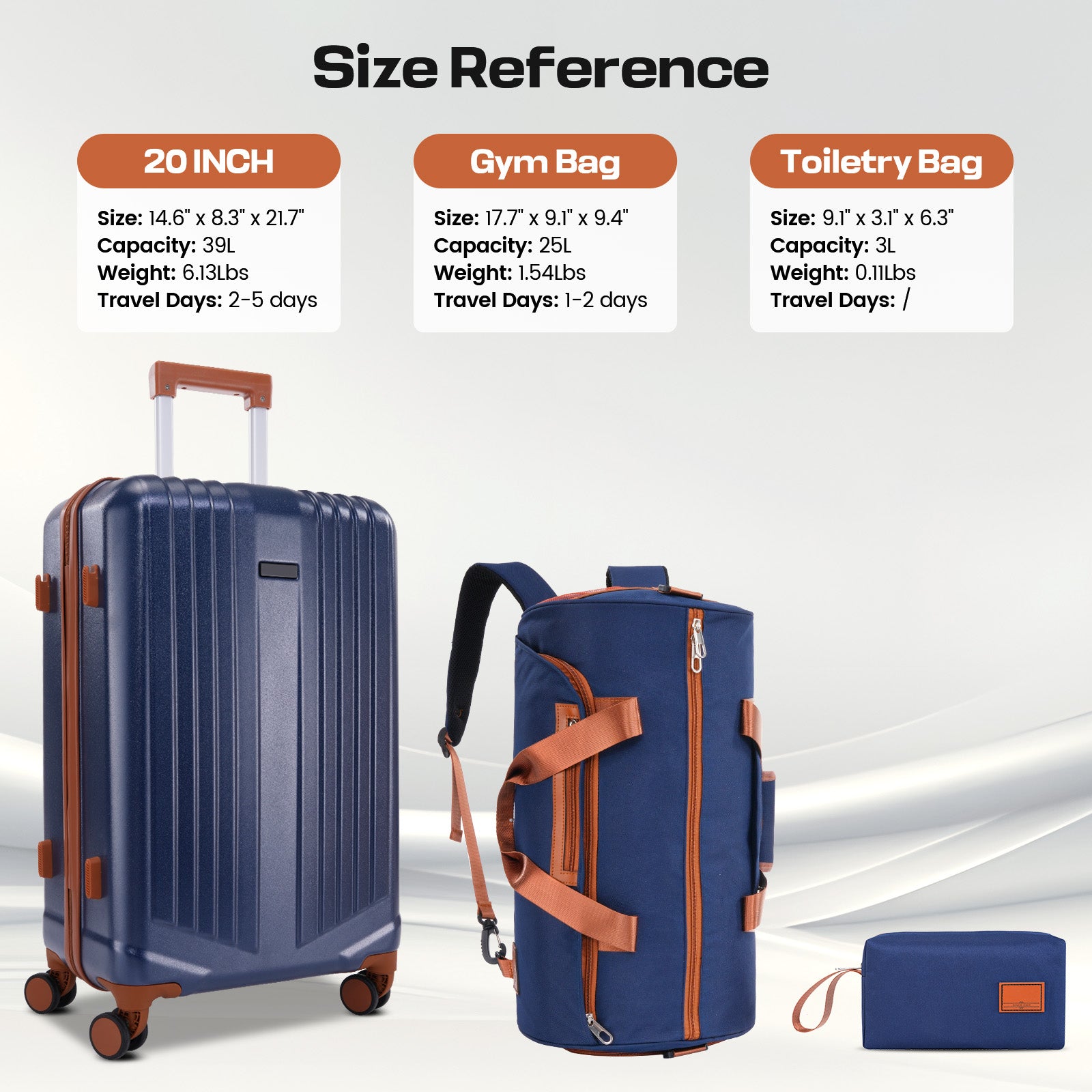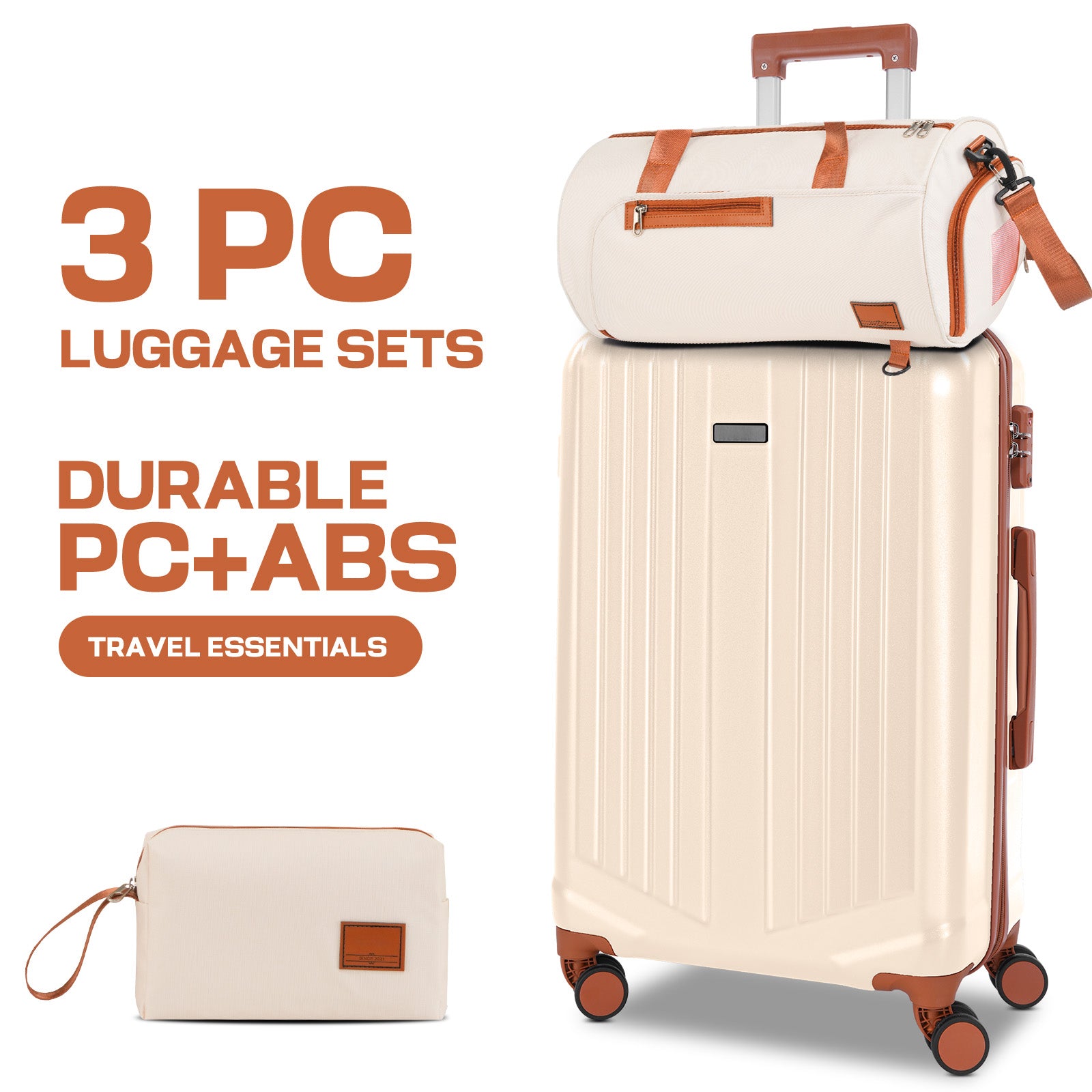 3-Piece Set (20" Carry-On + Convertible Gym Bag + Toiletry Bag): Travel light with a durable ABS+PC hardshell, TSA-approved lock, and smooth 360° spinner wheels. The interior uses a simple U-shaped mesh pocket, while the gym bag converts from backpack to crossbody to handheld and slides over the suitcase handle for hands-free moves.