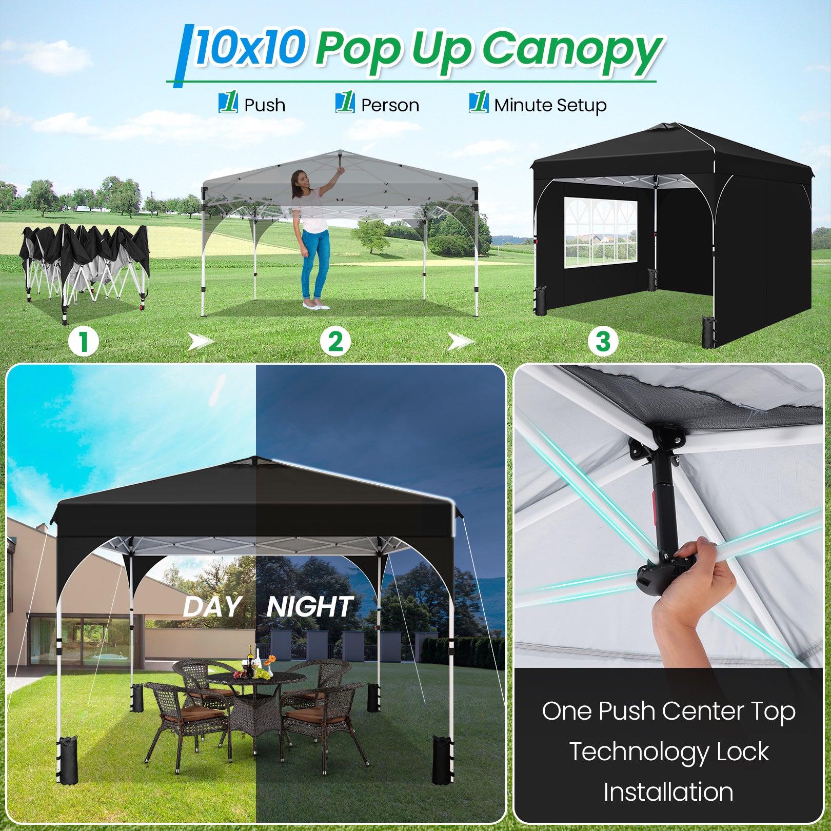 🔍1-Person Setup: This canopy tent features a central lock function that allows for quick setup and takedown with a single push. It can be easily installed by one person in just 5 minute, saving you time,Great convenience for your activities and parties.