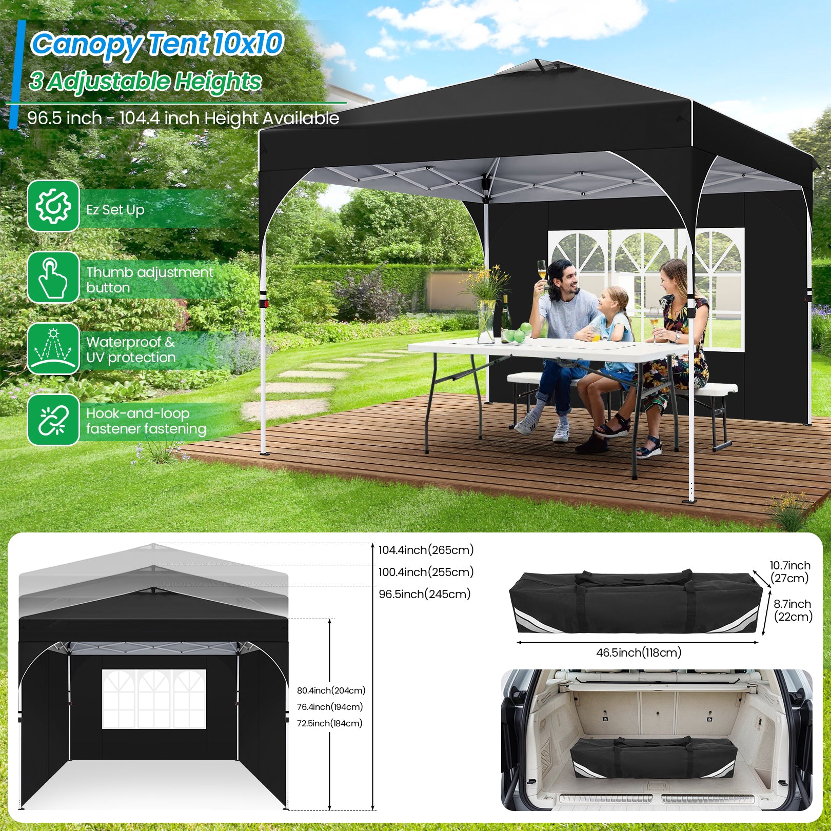 The 10x10 pop-up canopy tent features a convenient central lock function for quick setup and takedown with a single push, allowing one person to install pop up tent in just 5 minute. The unique ventilated top and removable sidewalls offer sun protection and ventilation, making it ideal for outdoor camping, parties, and beaches. Designed with reflective strips, canopy tent enhances visibility and safety in the dark while adding aesthetic appeal. Offering 100 square feet of shaded space with three adjustable height settings, beach canopy is spacious yet compact, measuring 44.5 x 7.5 x 7.9 inches when packed for easy transport.