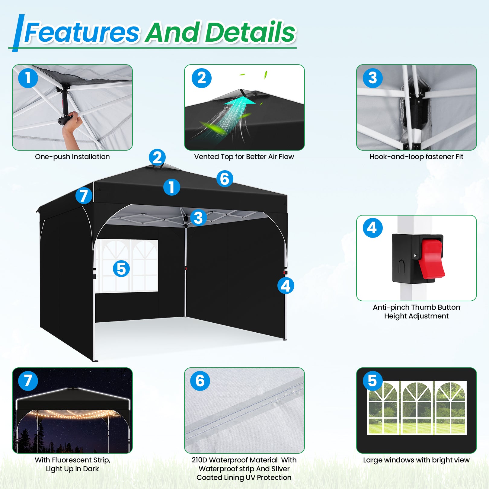 🔍Visible and Safe: Designed with reflective strips, this 10x10 canopy is more visible and safer in the dark, while also enhancing its appearance.