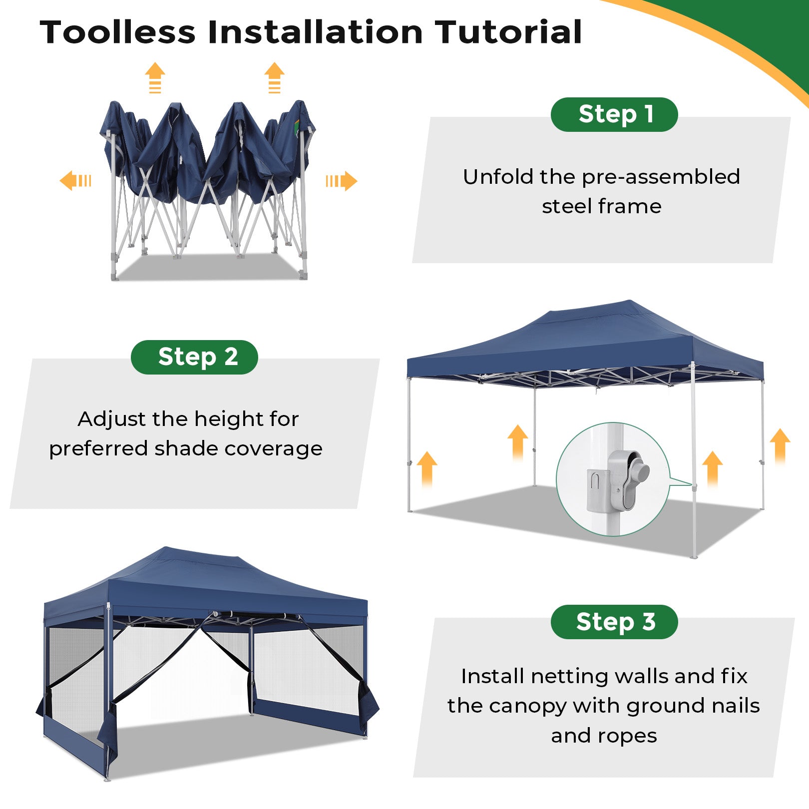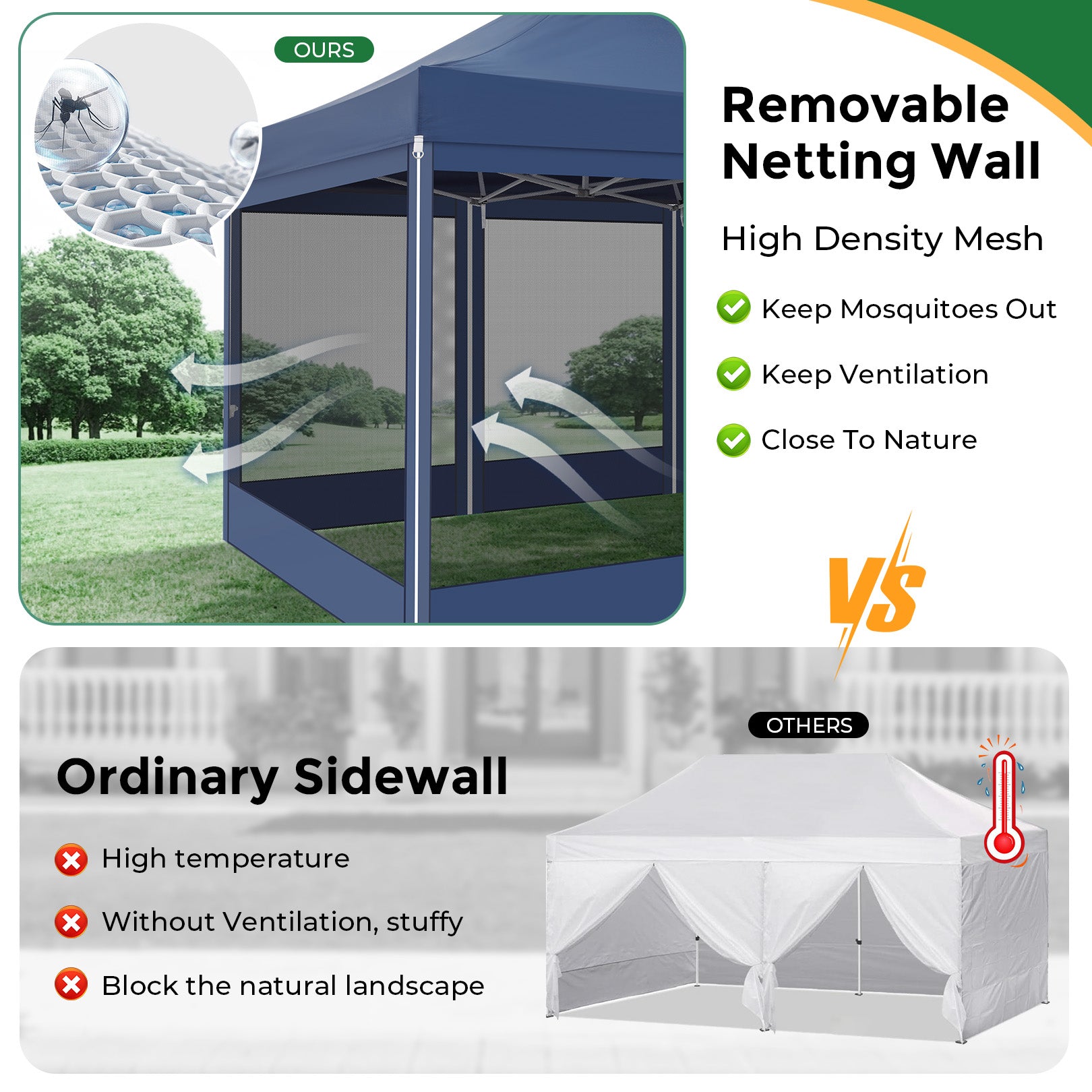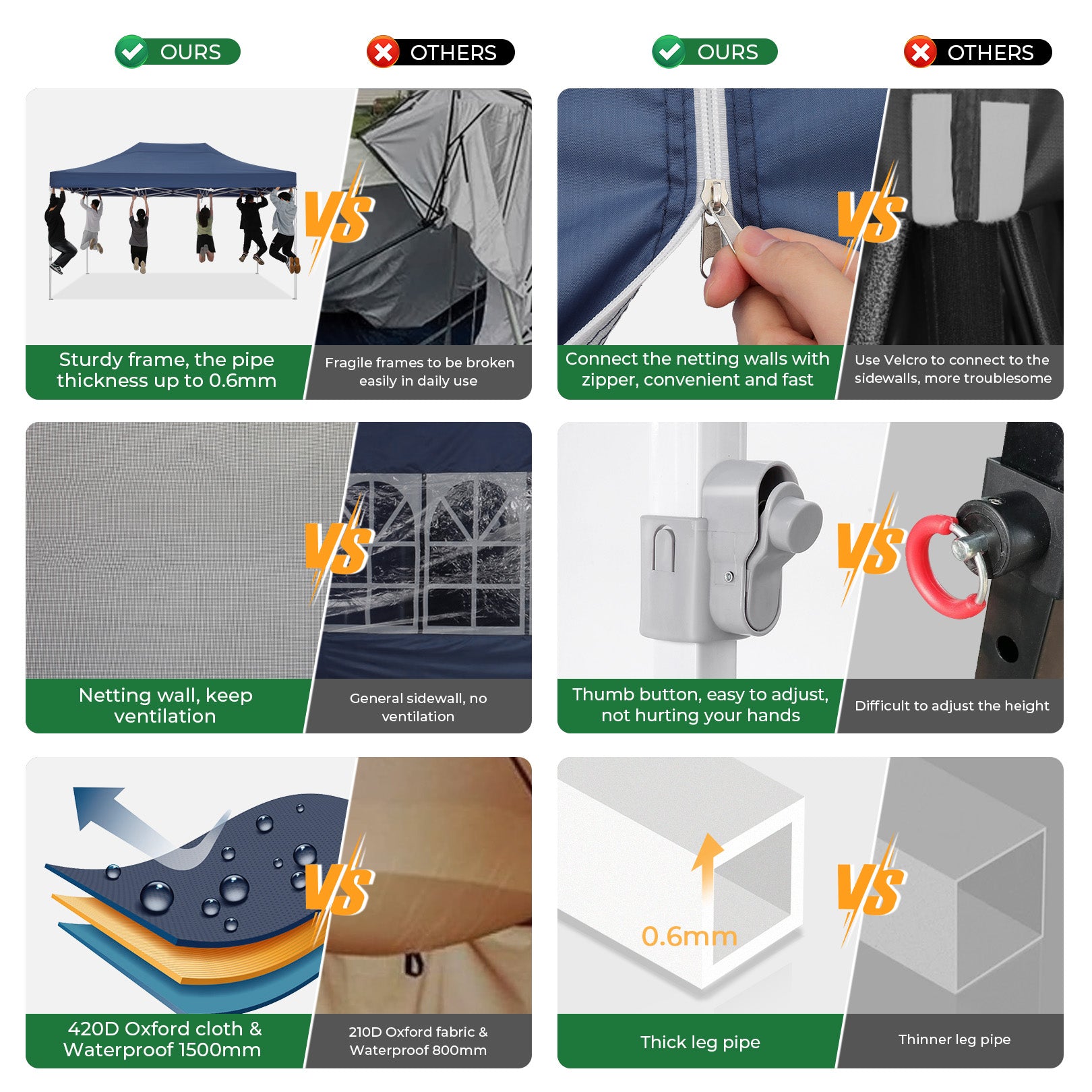 • 🐾【UV & Waterproof & Mosquito Nettings】 10x15 outdoor pop up gazebo is made from reliable 420D Oxford Fabric, flame retardant, UPF 50+, waterproof and blocks 99% of UV rays; Our pop up tent features 4 mesh side walls that provide clear visibility, plenty of light and ventilation. The 360° Velcro are 100% sealed, keep bugs out.The double-head zipper on each side of the commercial canopy tent mesh can be pulled inside and outside, which is convenient for entering and exiting outdoor gazebo.