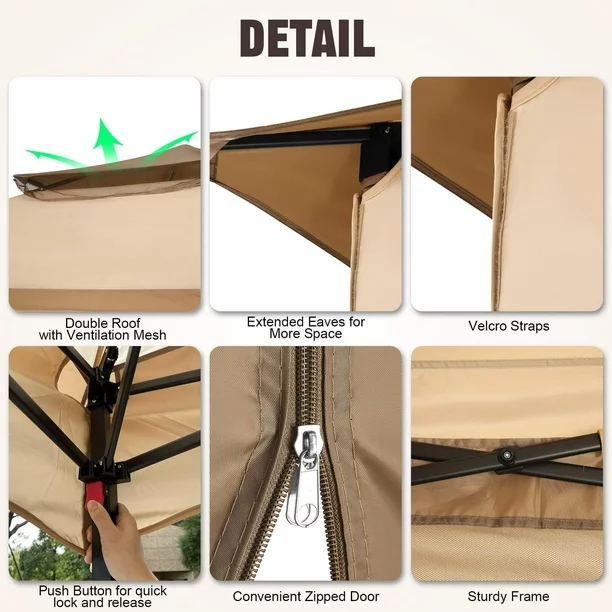 【Vented Top & Removable Mesh Wall】Super 2 tiered waterproof and UPF 50+ canopy top with drainage, promotes wind ventilation and increase stability for this gazebo tent in windy conditions. Zippered mesh wall services as a barrier to against small things, and provide air circulation and more privacy.