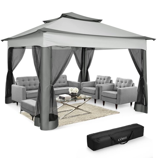COBIZI Outdoor Canopy Gazebo 11x11 Pop Up Gazebo Patio Gazebo with Mosquito Netting Outdoor Canopy Shelter with 121 Square Feet of Shade for Outdoor Lawn, Garden, Party, Backyard and Deck, Brown