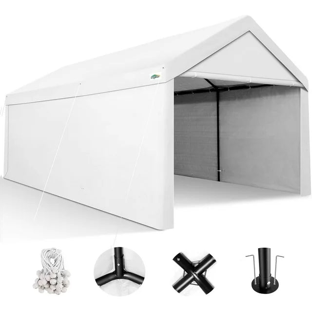 👍 Waterproof Roof-The 10x20 carport material is made of three layers of rip stop polyethylene fabric that is waterproof, UV resistant, fade resistant, and scratch resistant to protect your car or boat from all weather elements such as sun, wind, rain, dust and hail all year round.