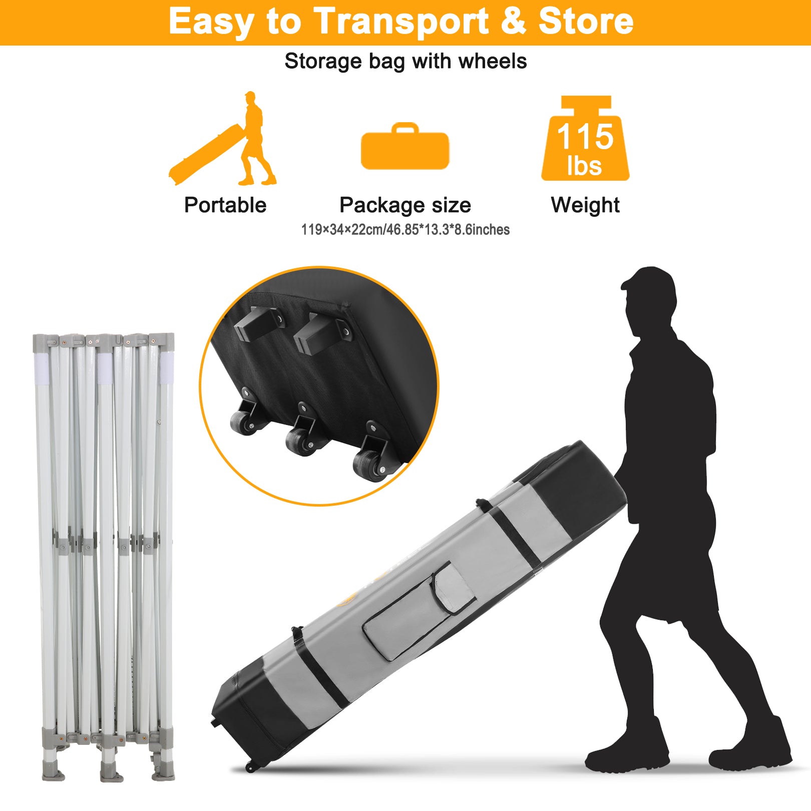 • ✅【Portable and Durable Roller Bag】 The 10 x 20 pop up canopy tent weighs up to 100lbs. As a result, we provide a roller bag with three large rollers made of 600D Oxford fabric that is stronger and more durable. The bag has an increased capacity to make it easier to store after use. The wheels have been upgraded, and the handles reinforced to allow for quick movement and transport. This makes the tent perfect for parties, weddings, events, barbecues, trade shows, or other outdoor occasions. Suitable for various settings such as commercial areas, playgrounds, patios, beaches, farms and more.