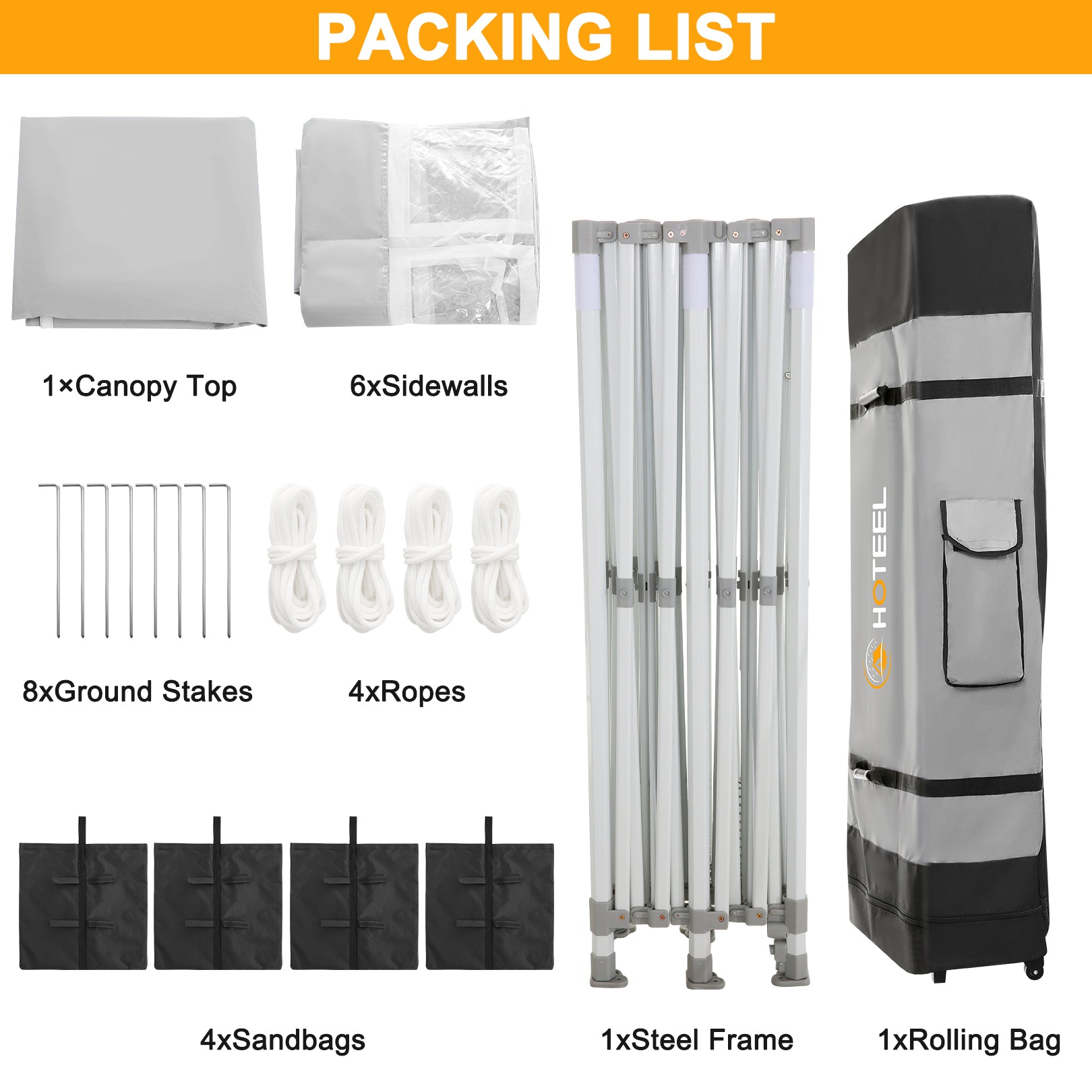 • ✅【INCLUDED ITEMS & WARRANTY】 The tent pack comes with 1 pop-up canopy frame, 1 10x20 canopy cover, 6 polyurethane-coated screens (4 that can be opened and closed, and 2 doors with zips), 4 sandbags, 8 ground spikes, 4 wind ropes, 1 wheeled bag, and 1 instruction manual. Please don't hesitate to contact us if you need assistance with the HOTEEL 10x20 pop-up tent. We will solve any query you may have right away.