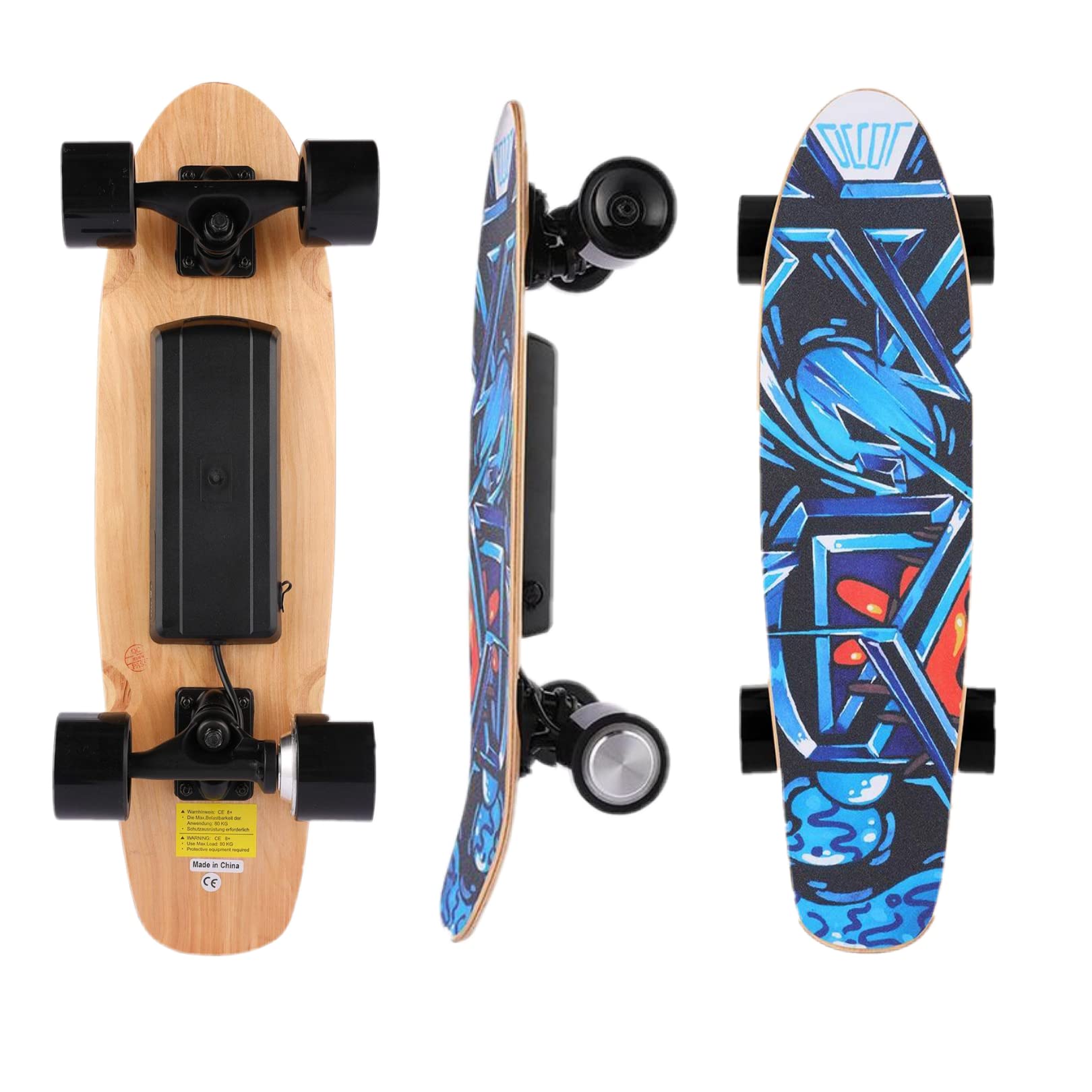 3 SPEED LEVELS - The skateboard with 350W motor has 3 speed modes for beginners or advanced skaters: Low(6.2mph), Medium(9.3mph) and High(12.4mph). It’s equipped with a 29.4V 2000mah Lithium Battery with a range to 6-8 miles, it can be fully charged within 2 hours. Safer than traditional skateboards, all speeds and brakes on the board can be easily controlled by remote control. Friendly to everyone! TIPS: No matter which speed, please pay attention to wearing a helmet. We always care about your safety.