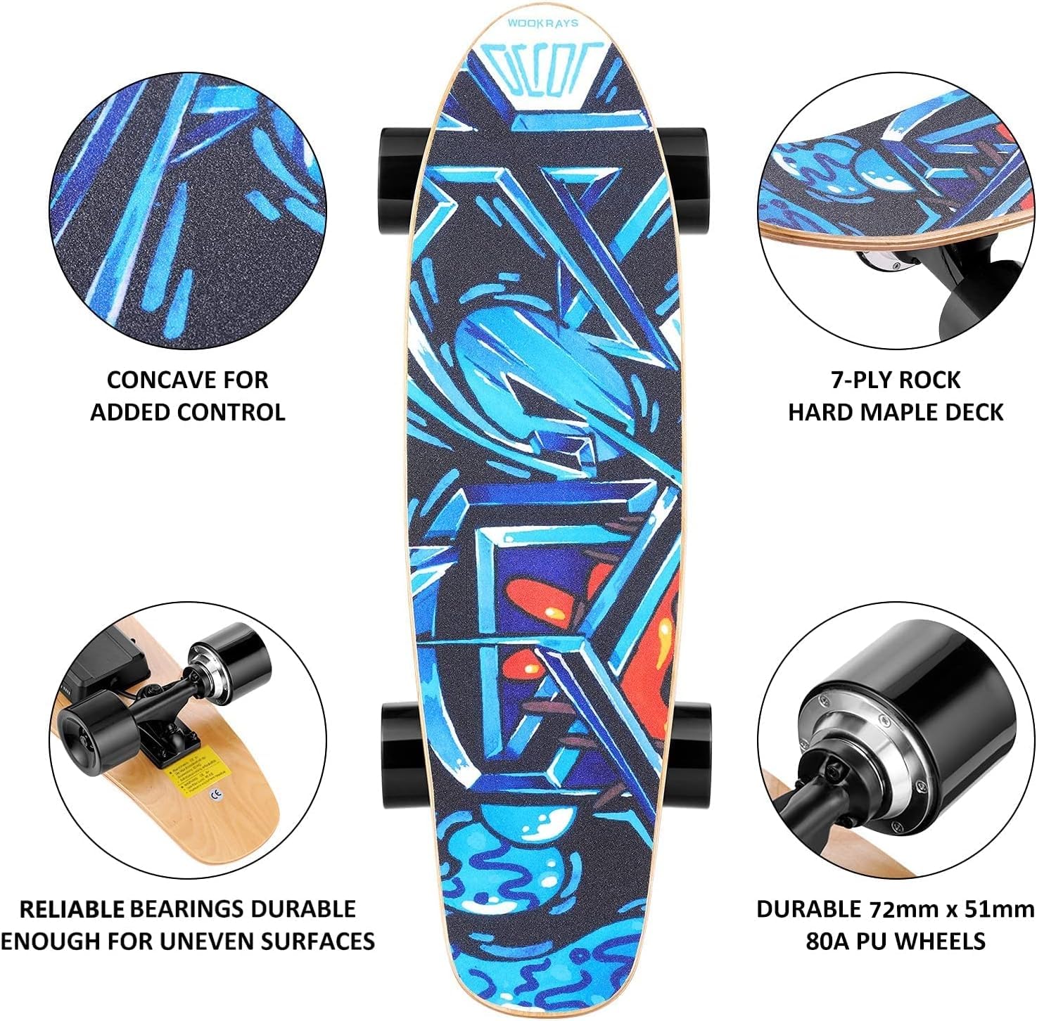 7-PLY MAPLE DECK - The skateboard is made of 7 layers rock hard maple deck that has better flex, more stable and durable. It can withstand all kinds of stamping collisions without deformation. Max Load is 80KG.