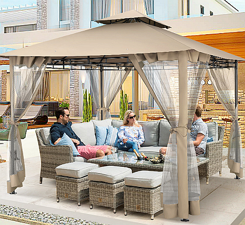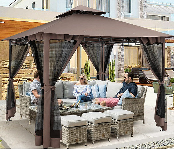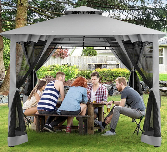 Outdoor gazebo adopts a double-top patio canopy tent design and peaked top design, which promotes wind ventilation. This outdoor patio gazebo provides more than 100 square feet of coverage. Comfortable enough for 6-8 people or more. Recommend to place 2 love-seat sofas + 2 single-seat sofas. Mesh fence, mosquito no entering the patio tent and ventilation. Zipper mesh, easy to open and close. Outdoor Tent is made of 180g polyester fabric and PA coating, which is waterproof, sunscreen, and tear-resistant. The top cloth of the outdoor canopy tent has drainage holes, which are good for drainage, avoiding fabric tearing by the rain.