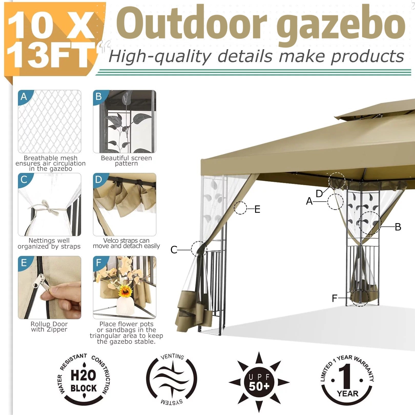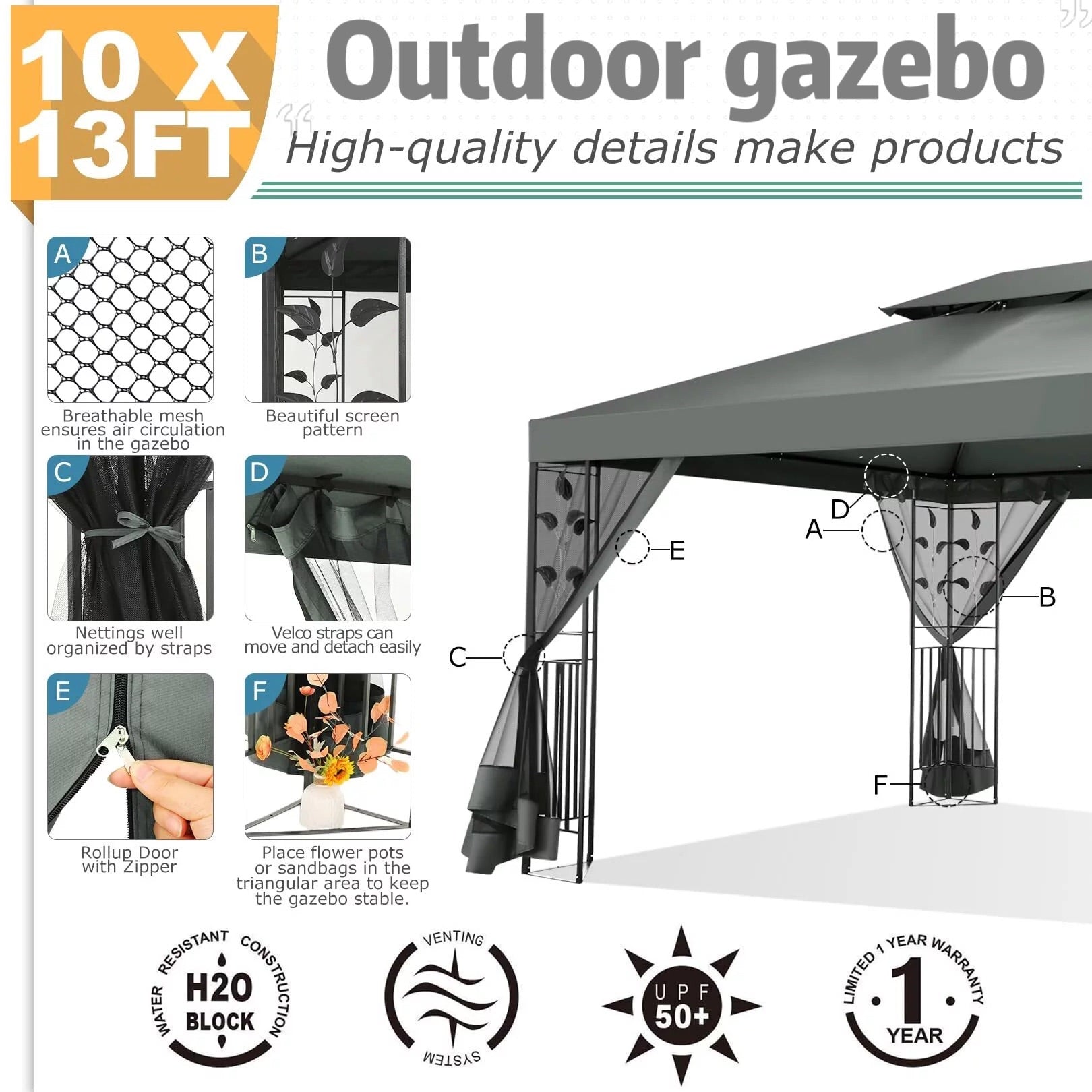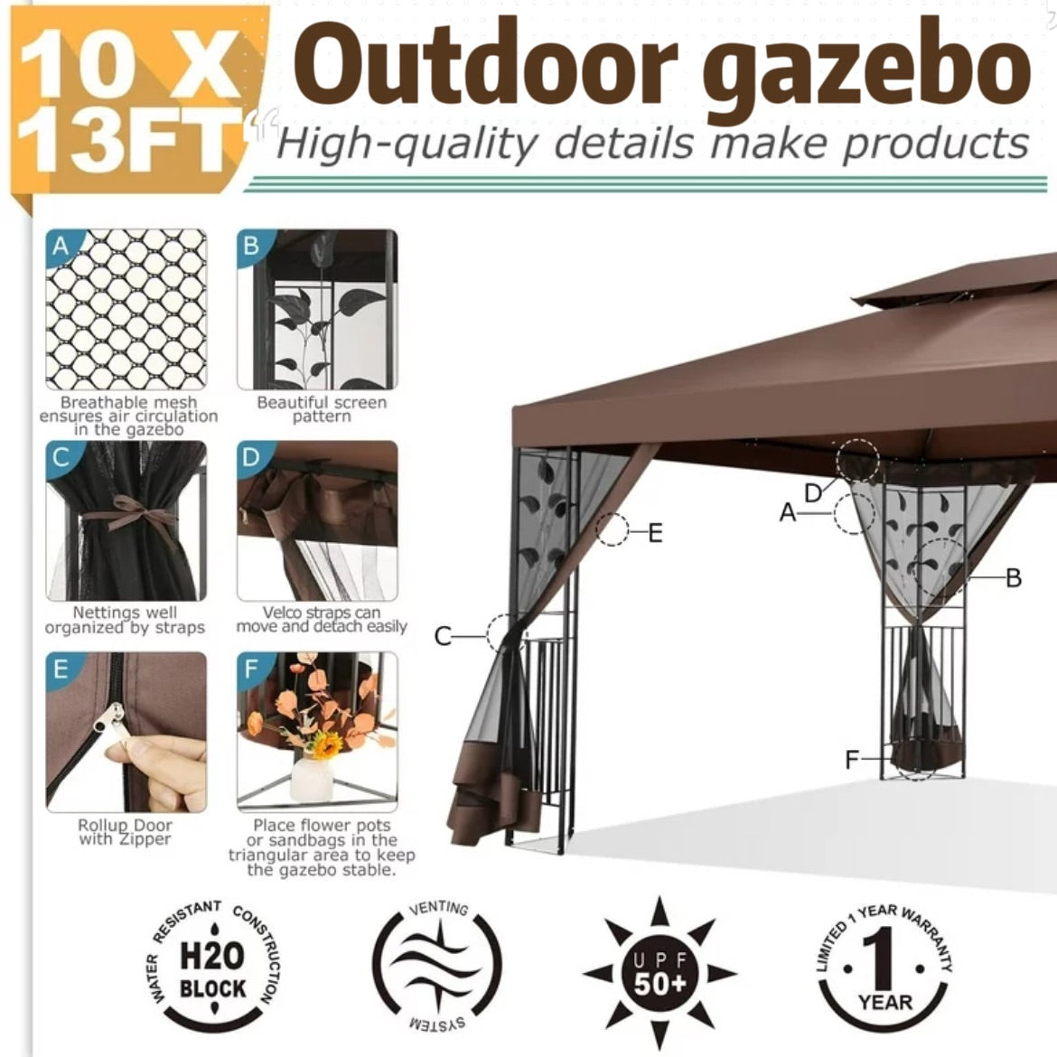 👍【Wide application】This 10x13 gazebo tent for parties is spacious and ideal for family gatherings, birthday parties, receptions, barbecues, daily leisure, etc.