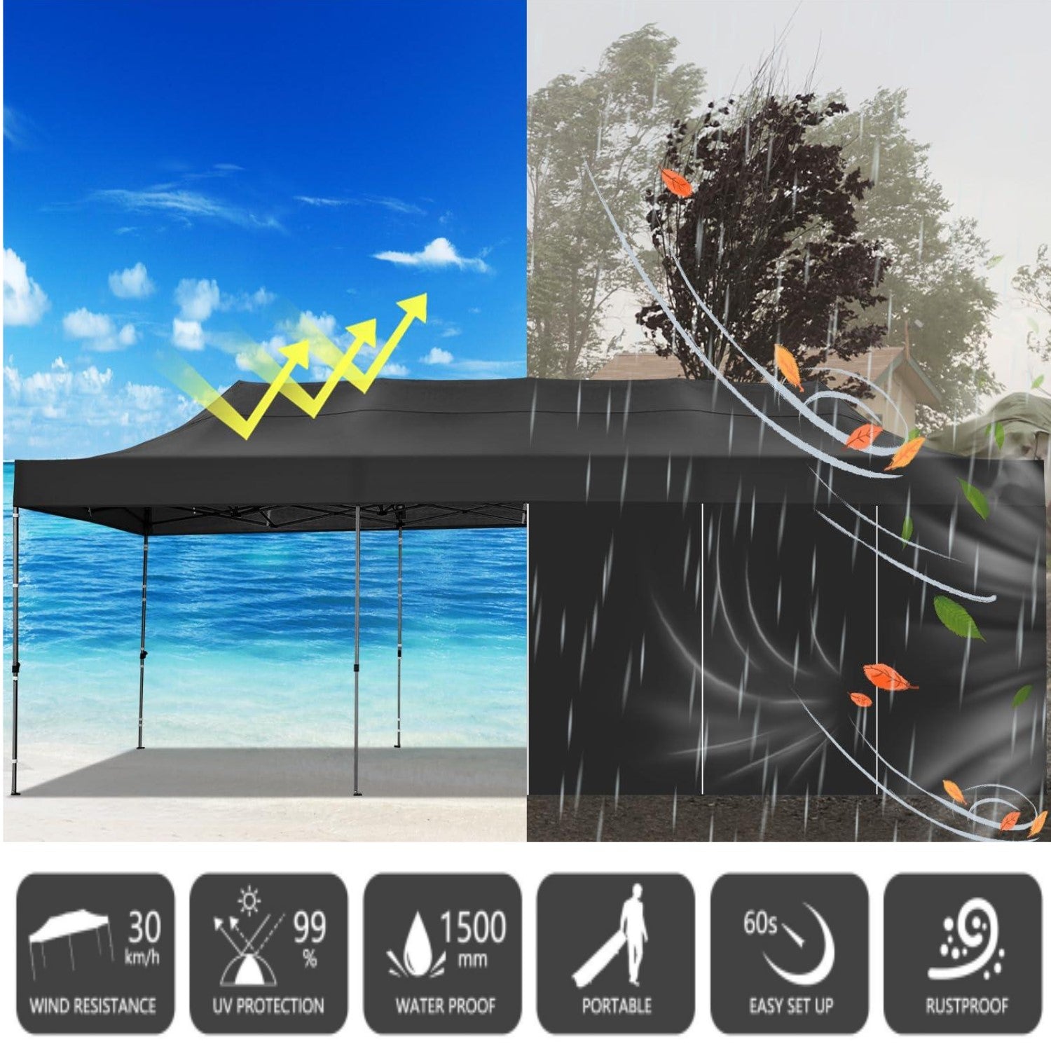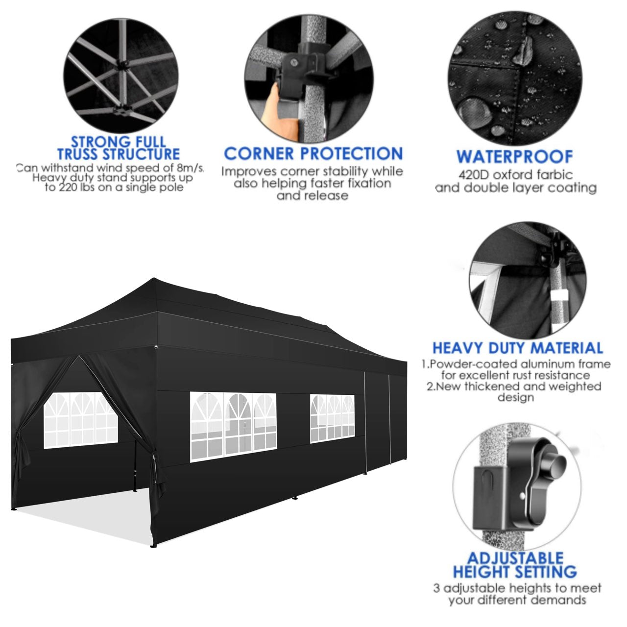 Made of 420D Oxford cloth with two layers of PU coating, UPF 50+, blocks 99% of UV rays. Heat-sealed seam technology is used, 100% waterproof, 1500mm waterproof pressure. 8 PU coated sidewalls connected by a whole strip of velcro and zipper to attach to the frame top and legs for securing, you can install by your need.