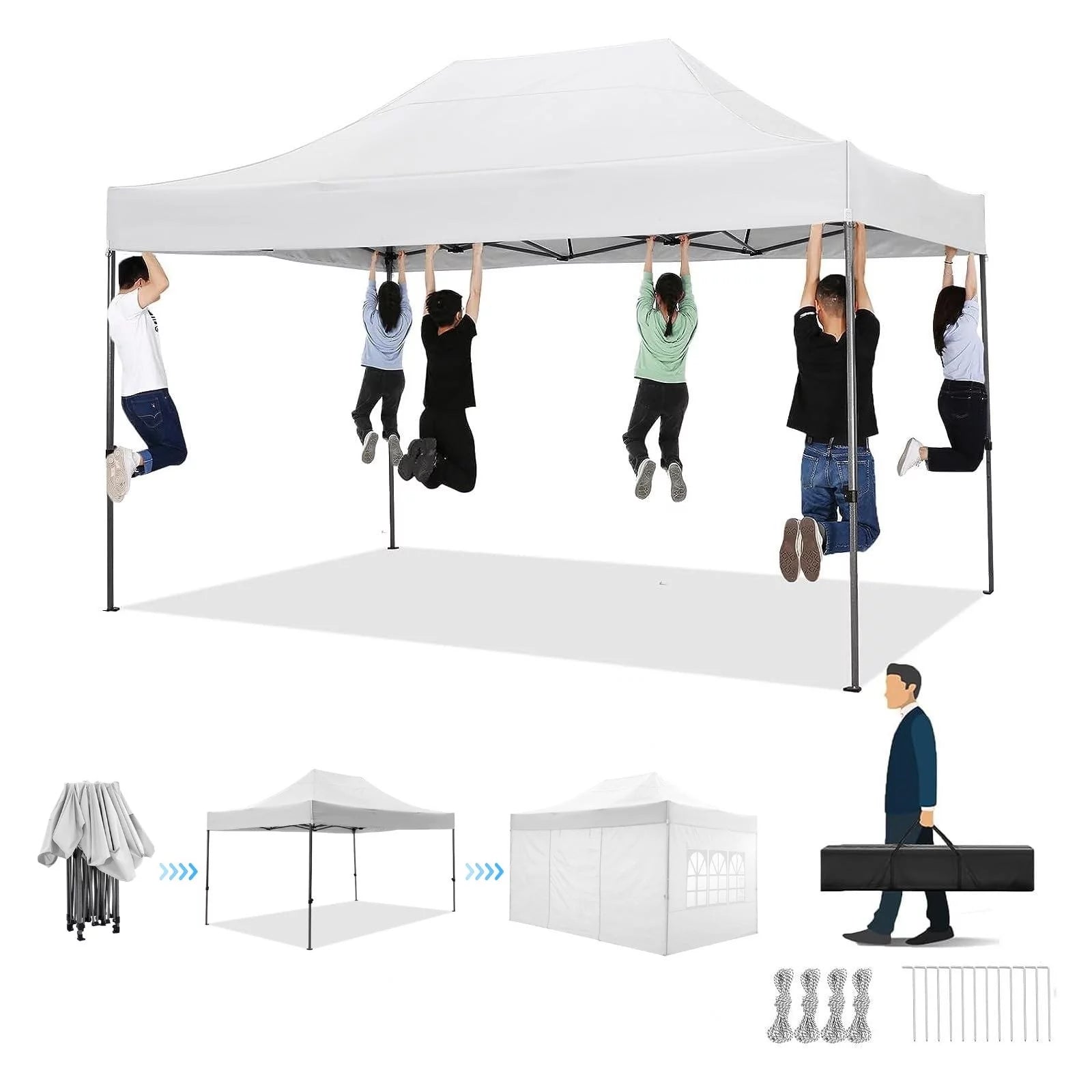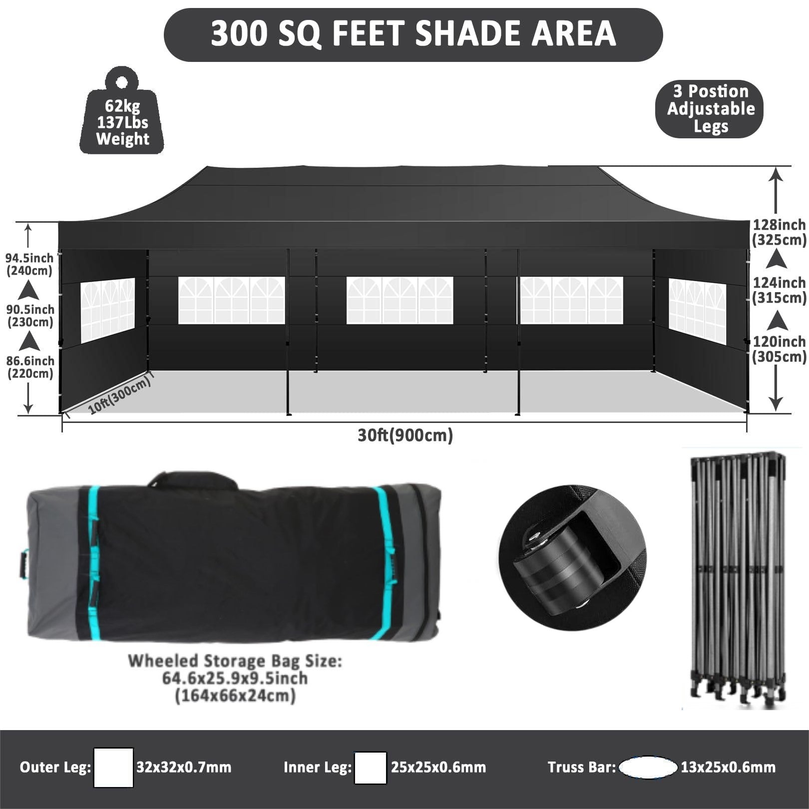 The frame of this tent is commercial grade full truss construction made of durable powder coated stainless steel. 32mm/1.26 inch widened pipe diameter, 0.7mm/0.03 inch thickened wall thickness.The middle support pole structure can hold up to 220 lbs on a single pole and can withstand up to level 4 wind (18mph), using the included sandbags, ropes and nails for increased carport stability.