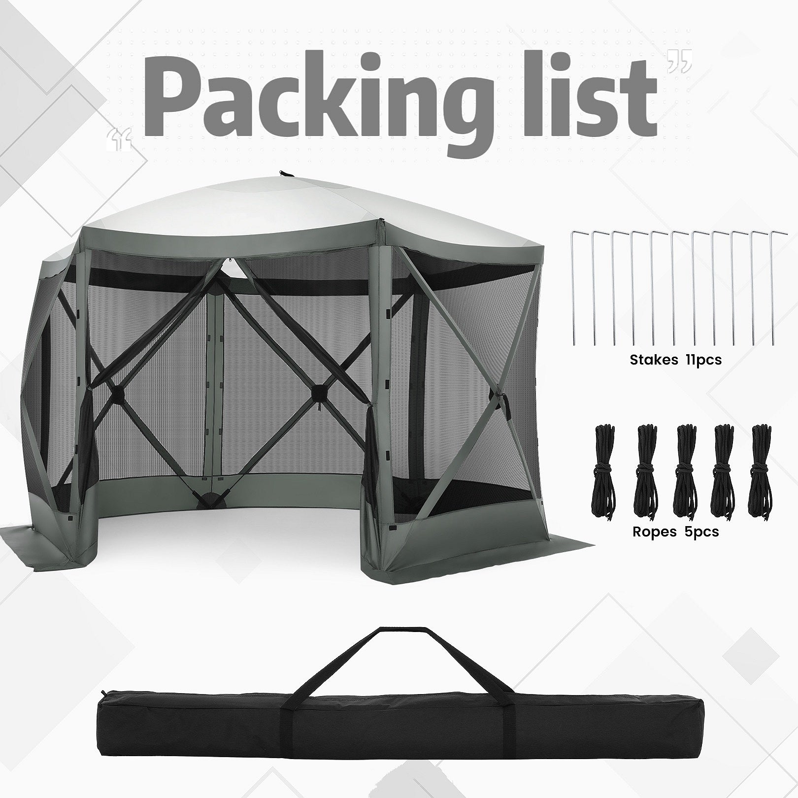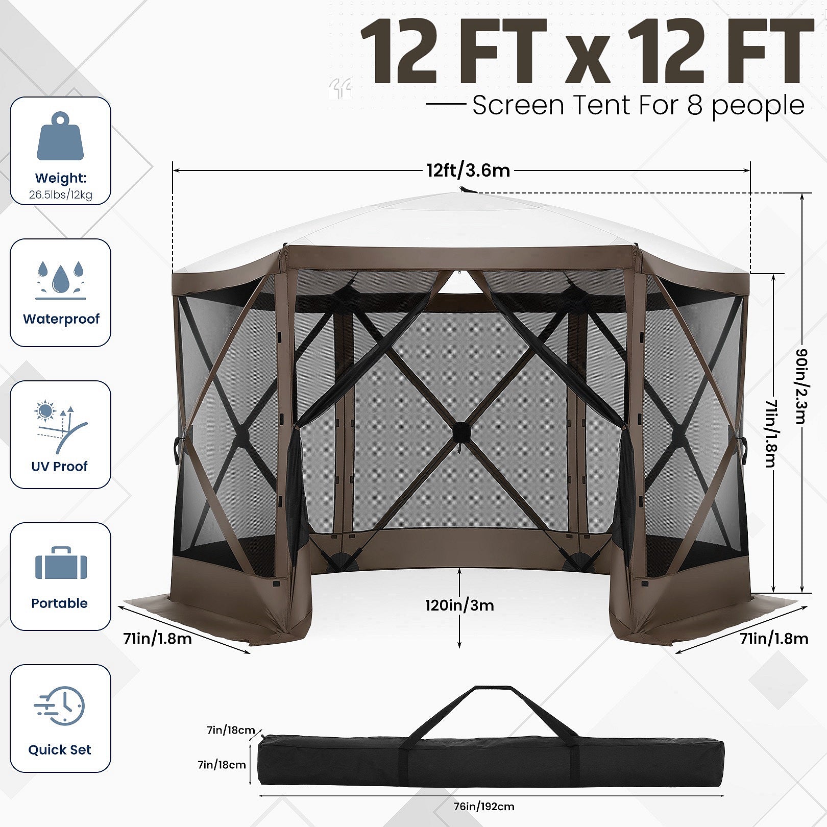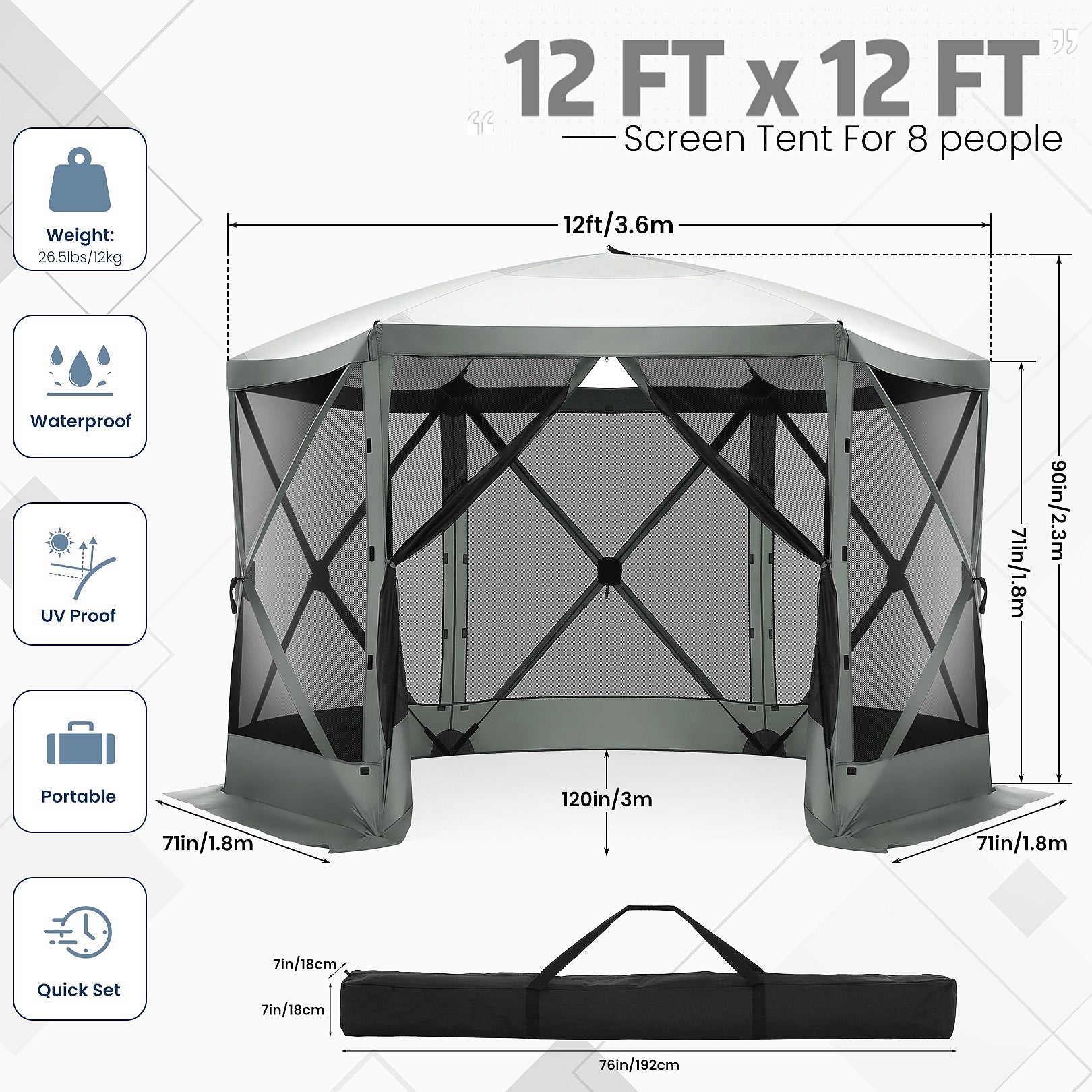 YUEBO 12'x12' Portable Screen House Room, Easy Pop-up Gazebo Outdoor Camping Tent with Carry Bag, Waterproof, UV Resistant, Attached Wind Panels, 8-Person & Table, Gray