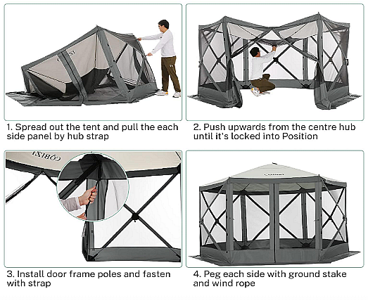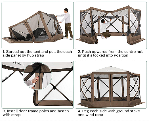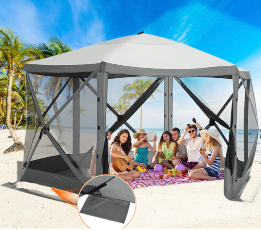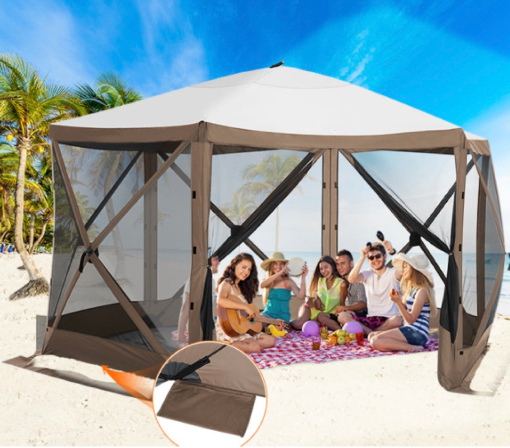 Great Choice for Outdoor LifeSet up this screen house tent in the backyards, have a great time with your friends or families. Take it when you go camping, compact carry bag make it easy to put in the back of your car, easy set up when you need a rest, have a cup of coffee and enjoy the beautiful scene. NOTICE; please make sure you set up the tent completely, pull the guylines, use the stakes & sandbags etc. Please take down this screen tent in extreme bad weather.