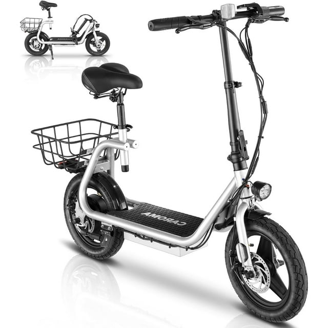 This peppy electric scooter with seat comes equipped with a generous 500-watt motor, 48-volt lithium ion battery, steel rigid front fork, rear disc brake, and 14″ tires on the front and back.The LED digital display provides clear and easy-to-read information about your speed and battery life.The built-in basket provides convenient storage for small items or groceries, making it easy to take everything you need with you.These offer smooth and efficient ride.