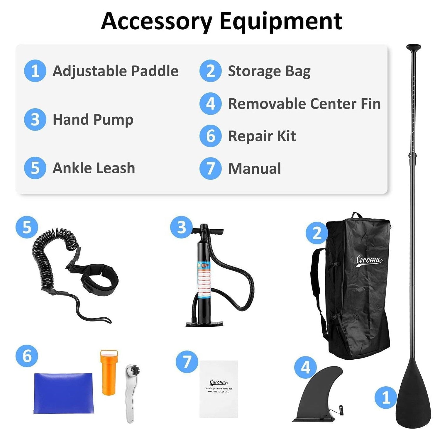 【COMPLETE PREMIUM ACCESSORIES】:1 adjustable paddle, 1 hand pump, 1 storage bag, 1 ankle leash, 1 removable center fin, 1 repair kit, 1 waterproof phone case.
