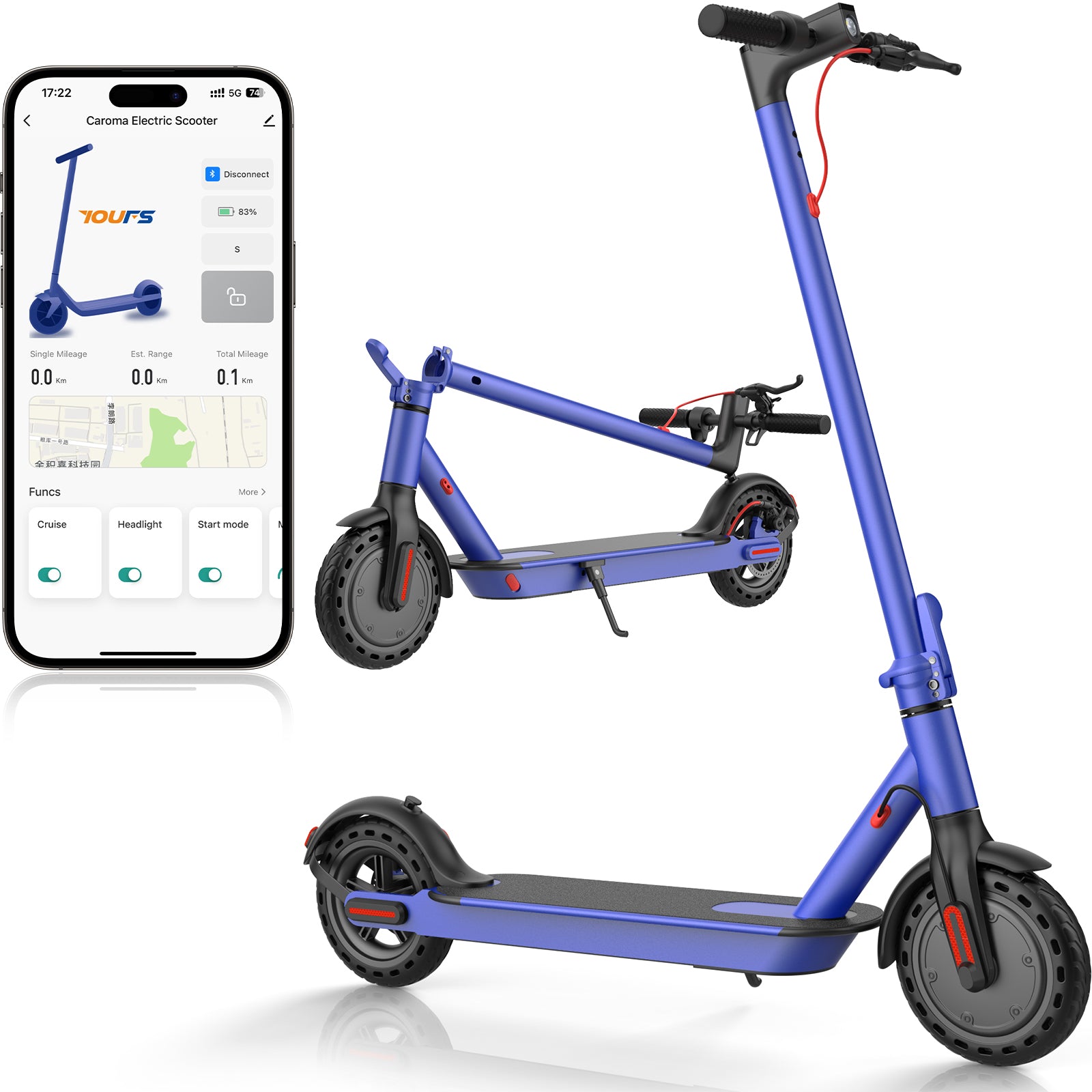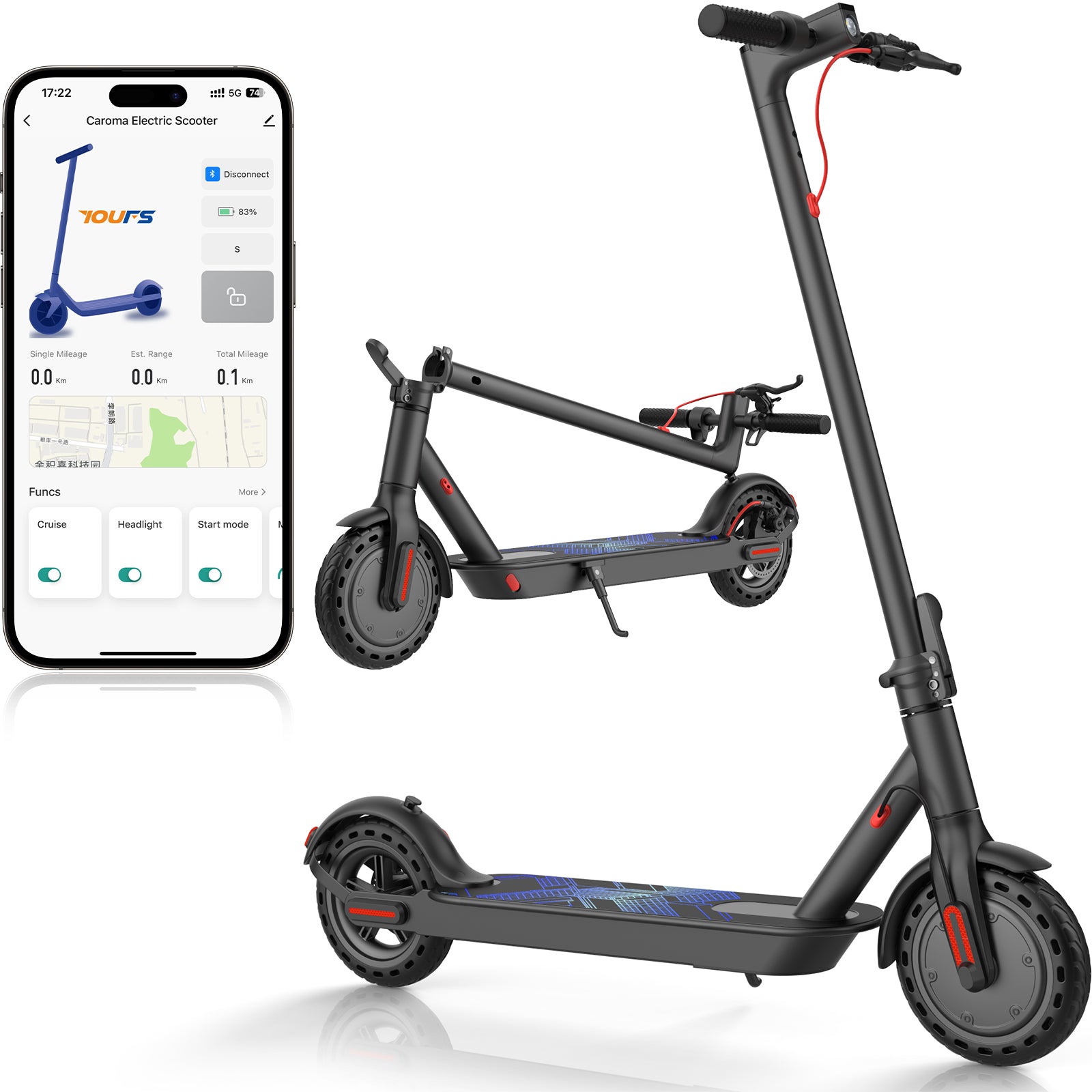 - đăGuarantee SafetyăCaroma electric scooter takes your safety as a priority, equipped with automatic nighttime illuminated headlights. When braking, the safety warning tail light flashes automatically to ensure safe riding. Dual braking system ensures 0.1 seconds quick response, providing you with excellent safety. In addition, 8.5-inch solid rear tires and pneumatic front tires with excellent shock absorption make riding smoother and more comfortable.