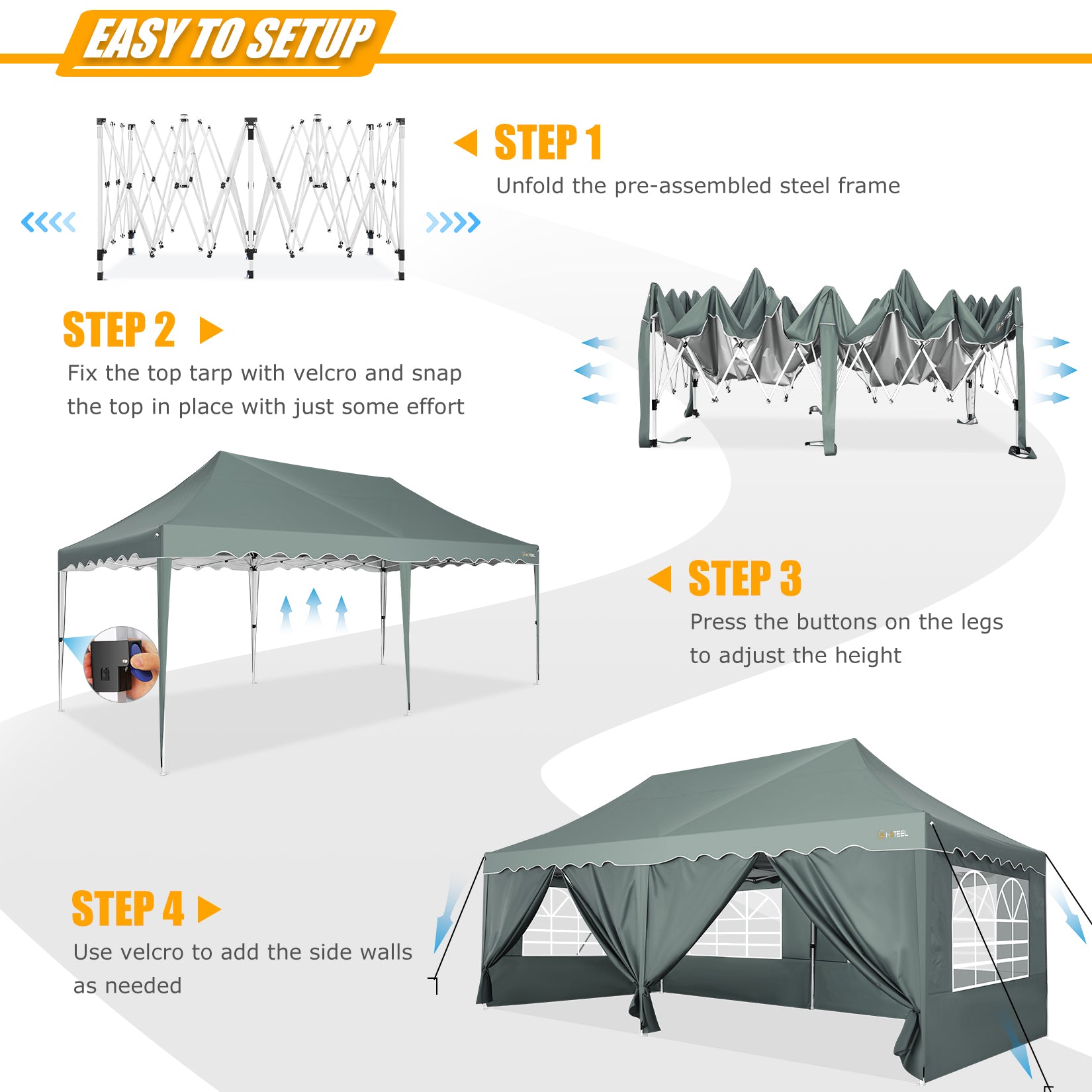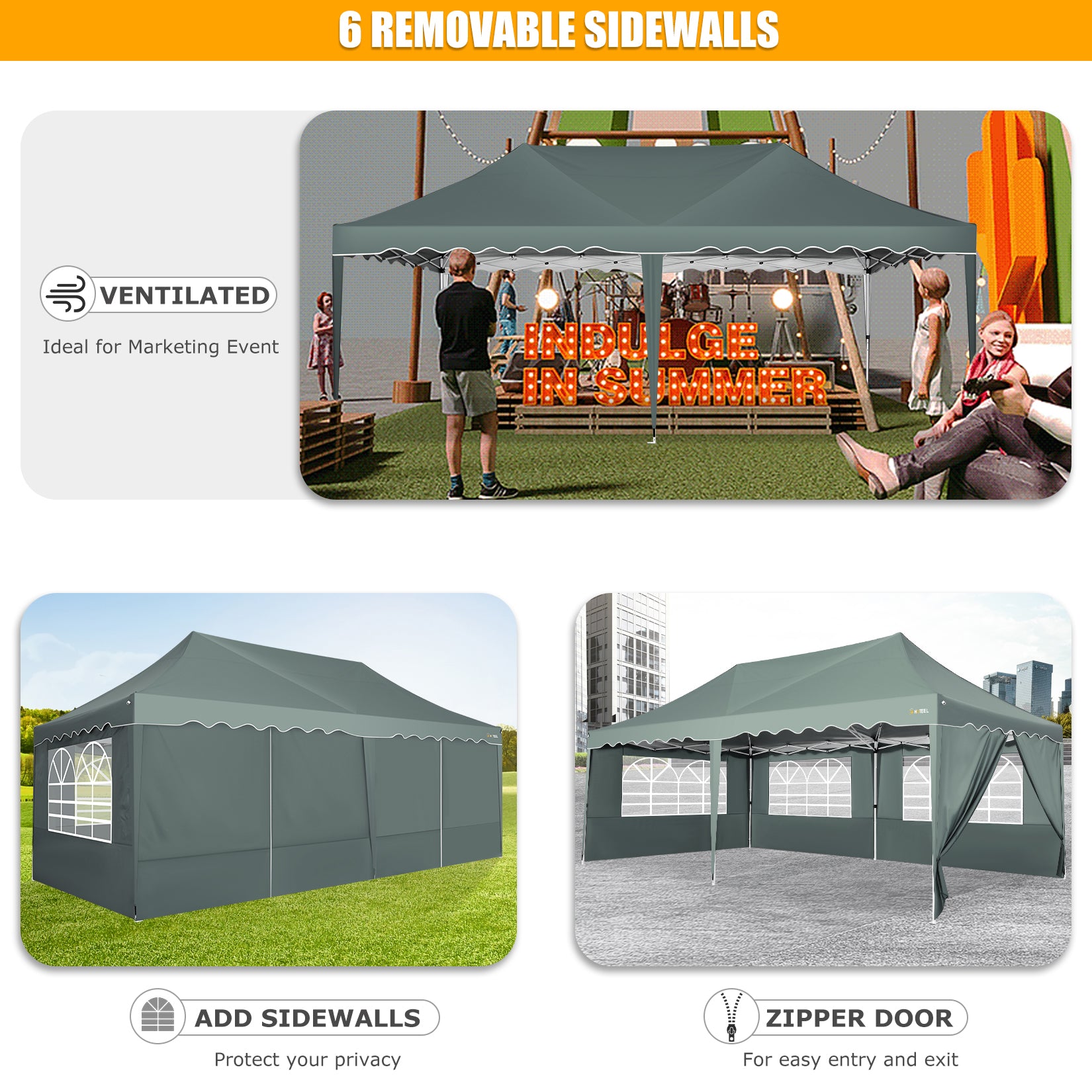 HOTEEL Canopy Tent 10X20 Pop-up Canopy with 6 Removable Sidewalls and Wheeled Bag& Curled Edge ,Outdoor Event Instant and Portable Tents,for Parties, Weddings, Camping and Beaches,Grey Green