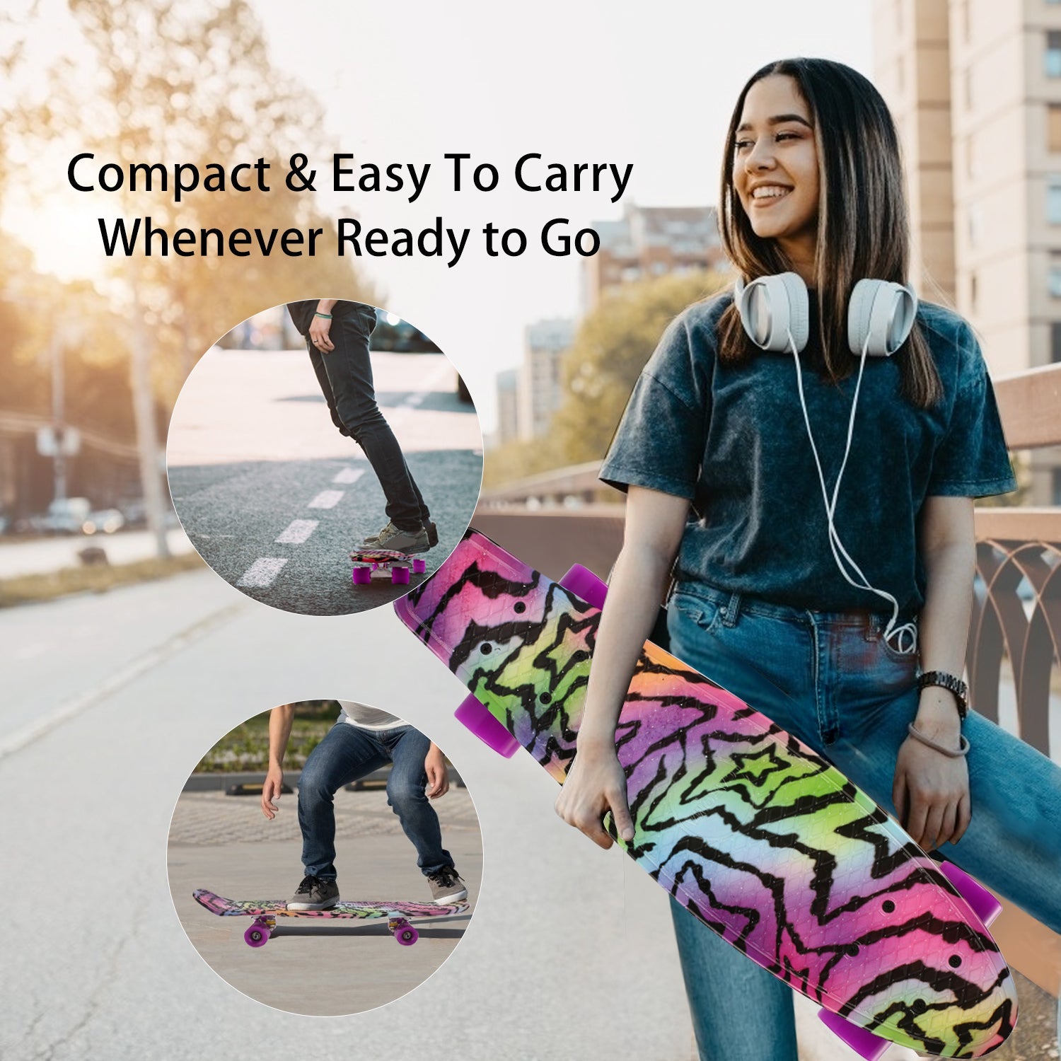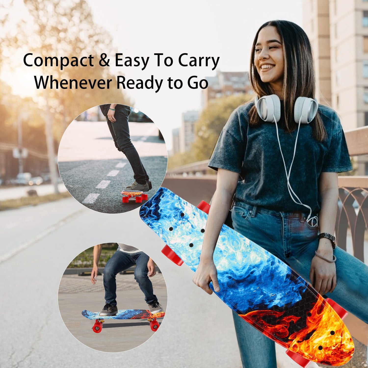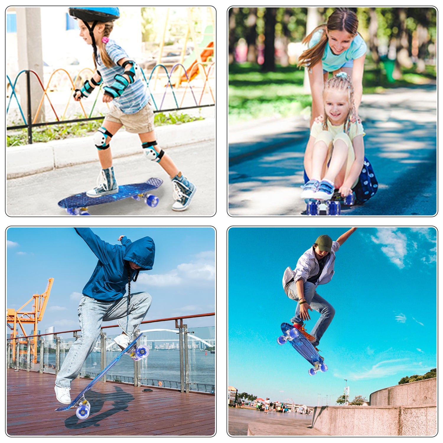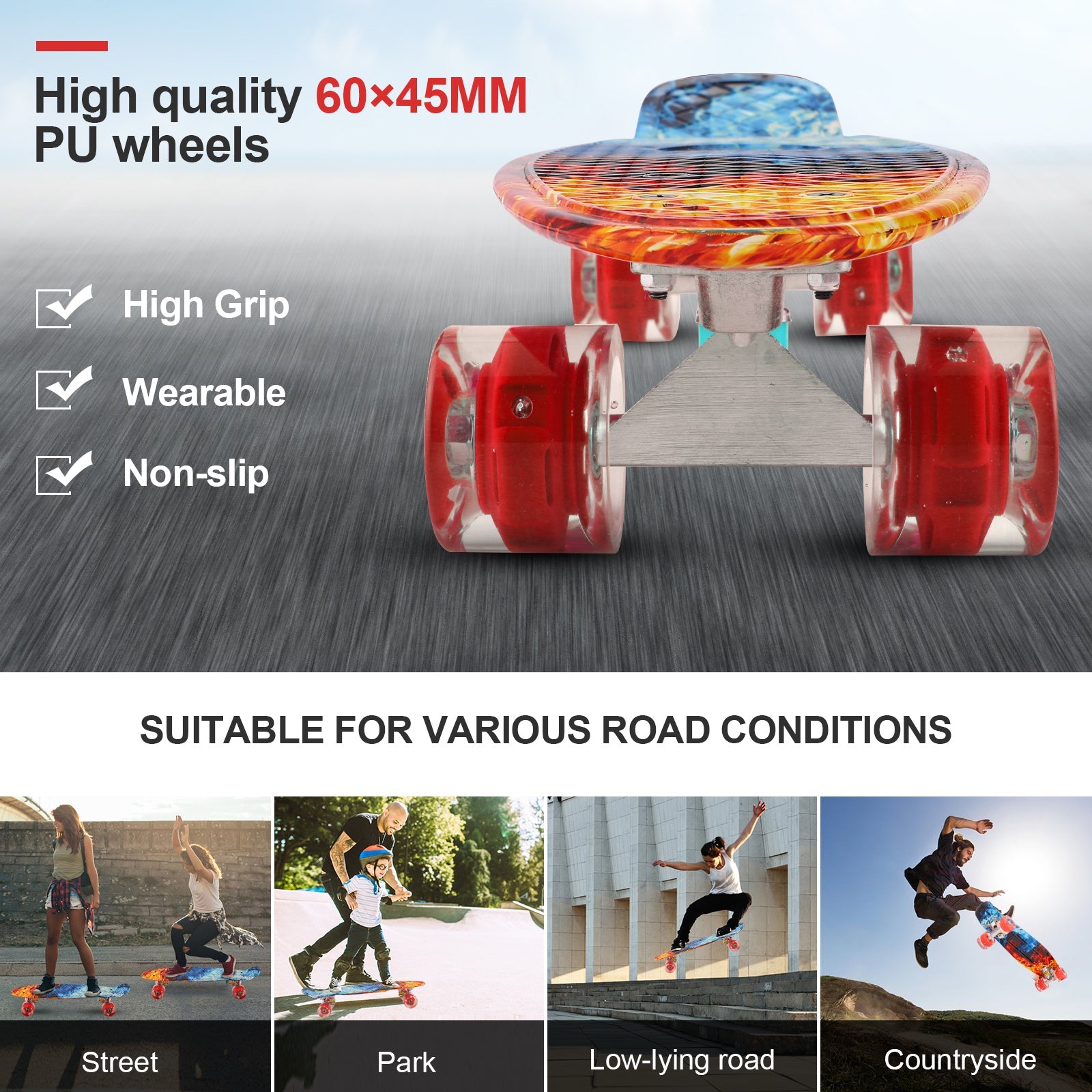 - A complete skateboard is only suitable for urban and flat roads, not for off-road, downhill or extreme sports. Avoid driving on sand, gravel, mud, rough terrain. Do not drive on slippery surfaces such as snow, ice or wet surfaces.