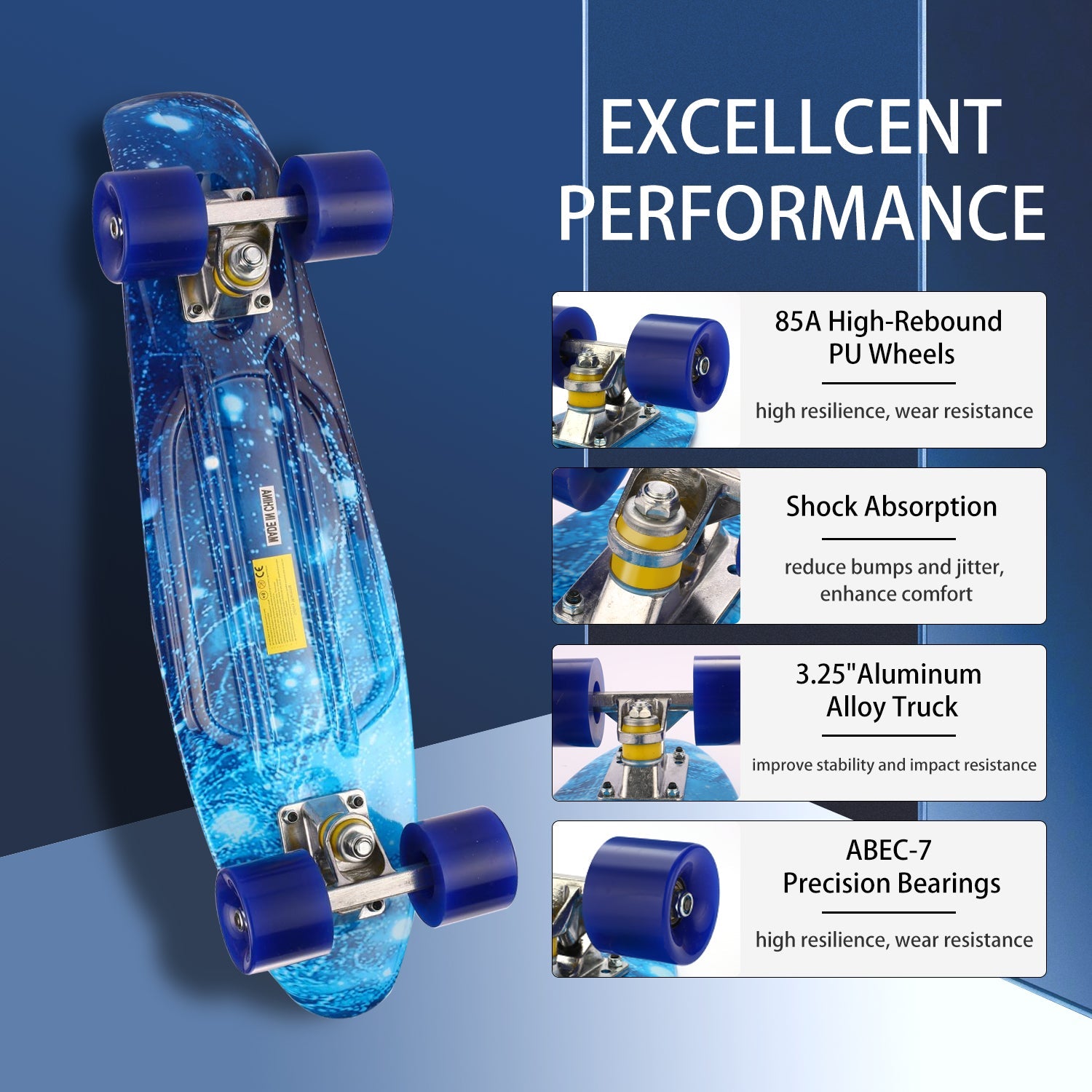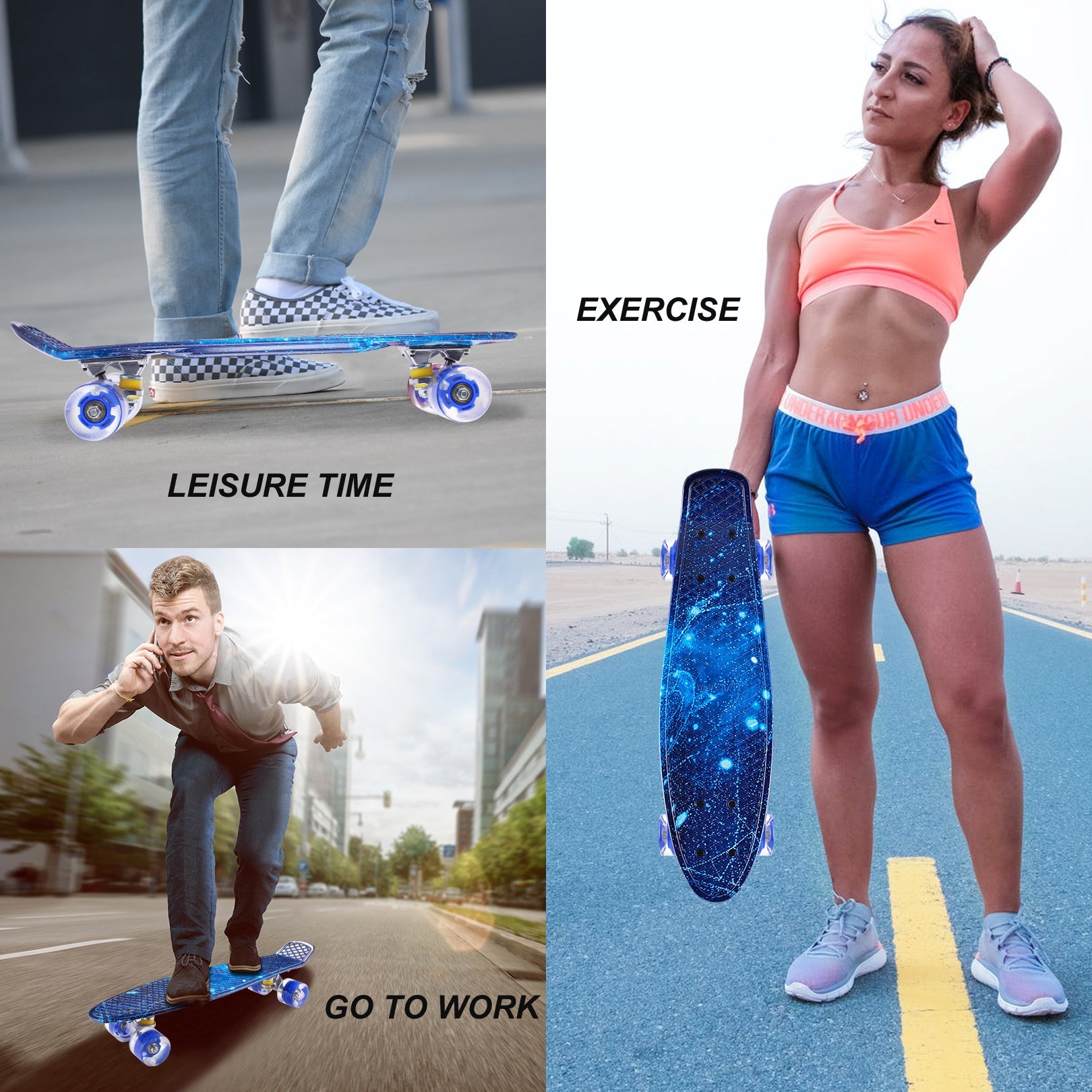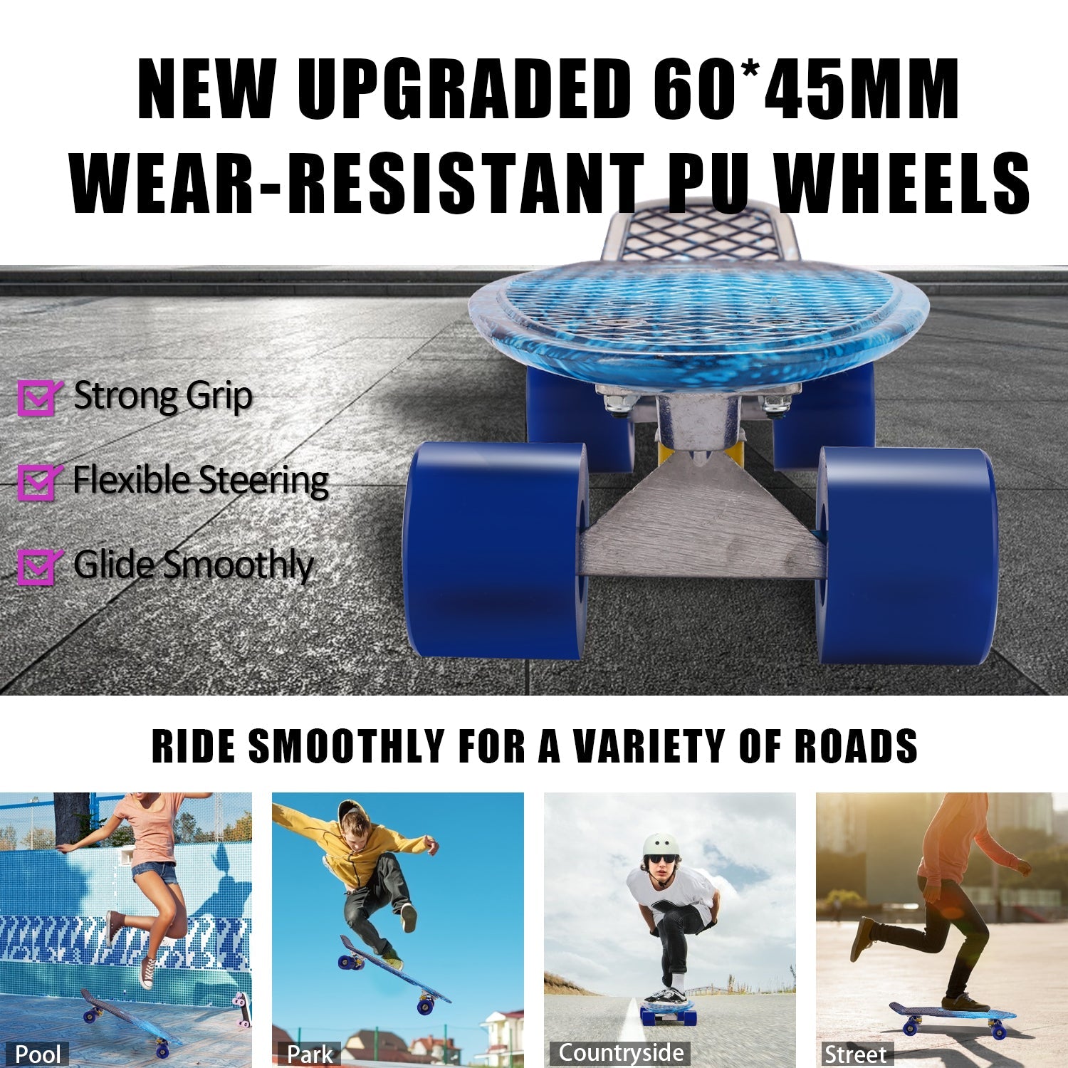 - 4 wheels are made of resistant PU for a long-term use, support your skateboarding on different street surface.