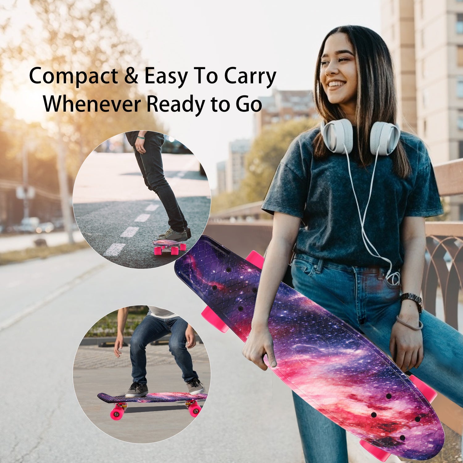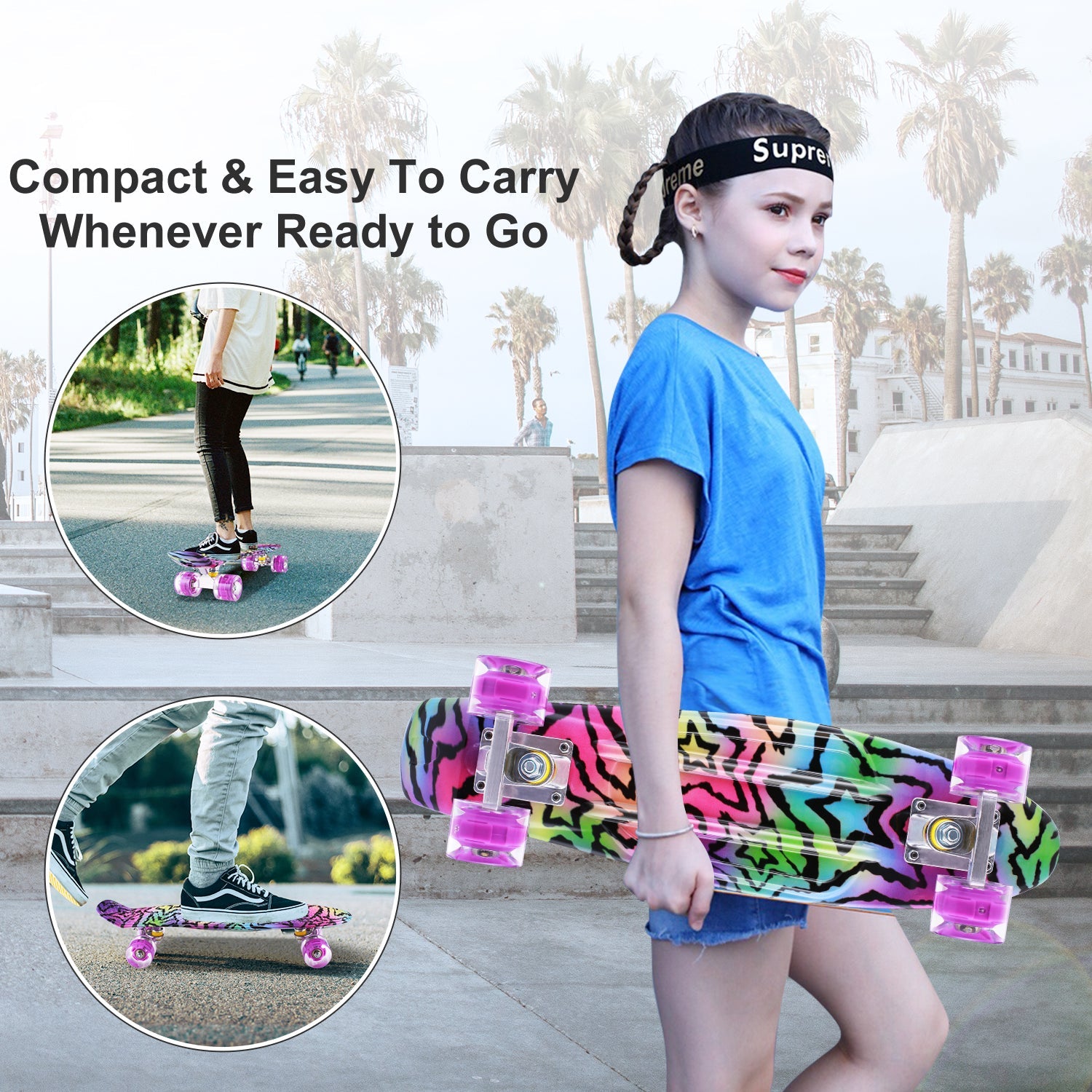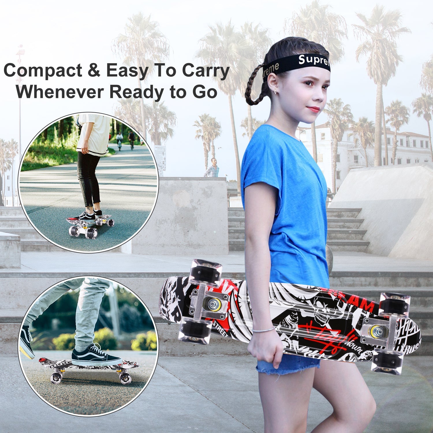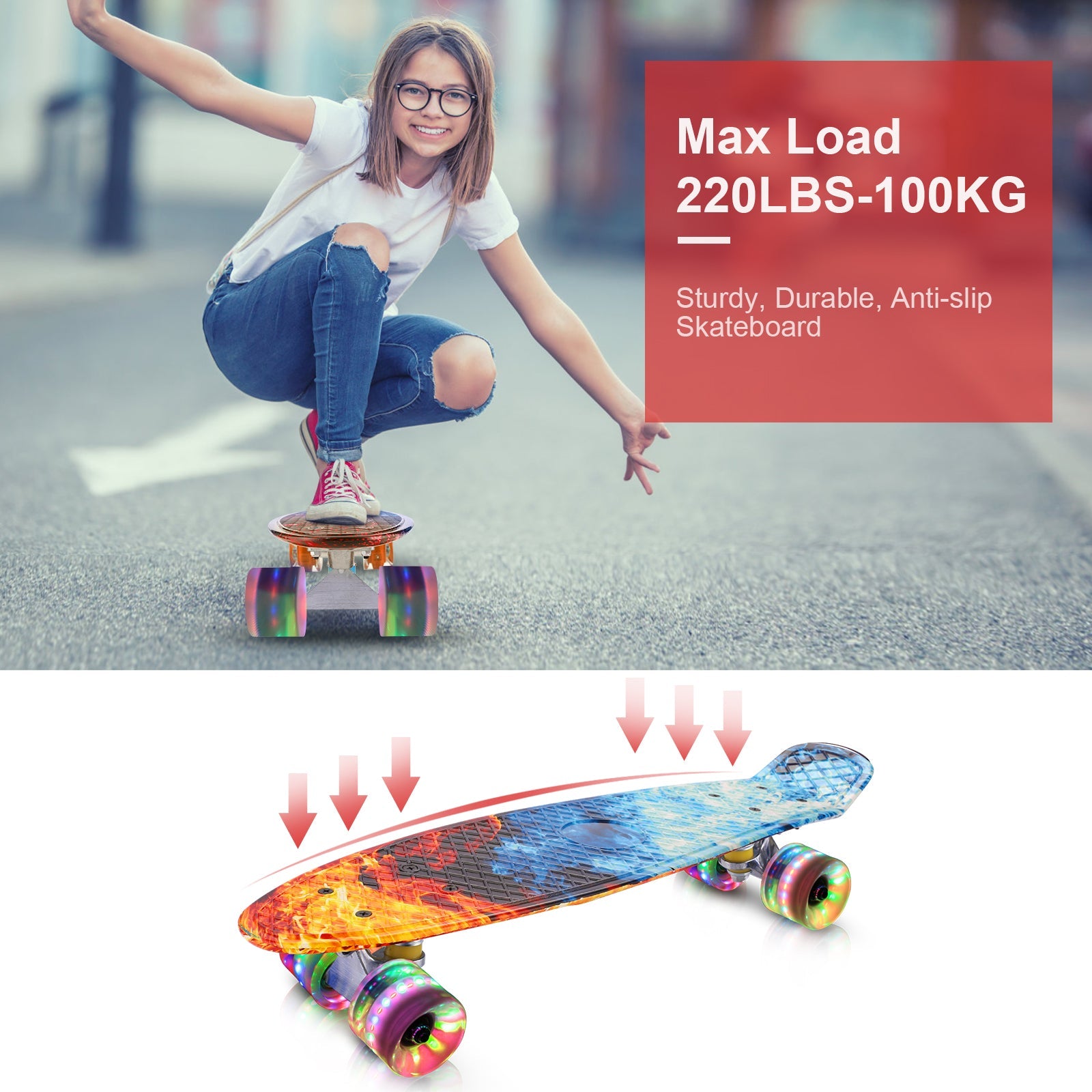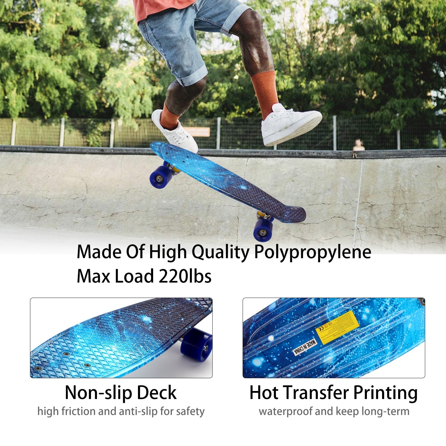 - Enhanced Shock Resistant 22x5.7" Wide Bendable Non-Slip Polypropylene Deck. Supports riders up to 220 lbs and is suitable for kids, teens and adults.