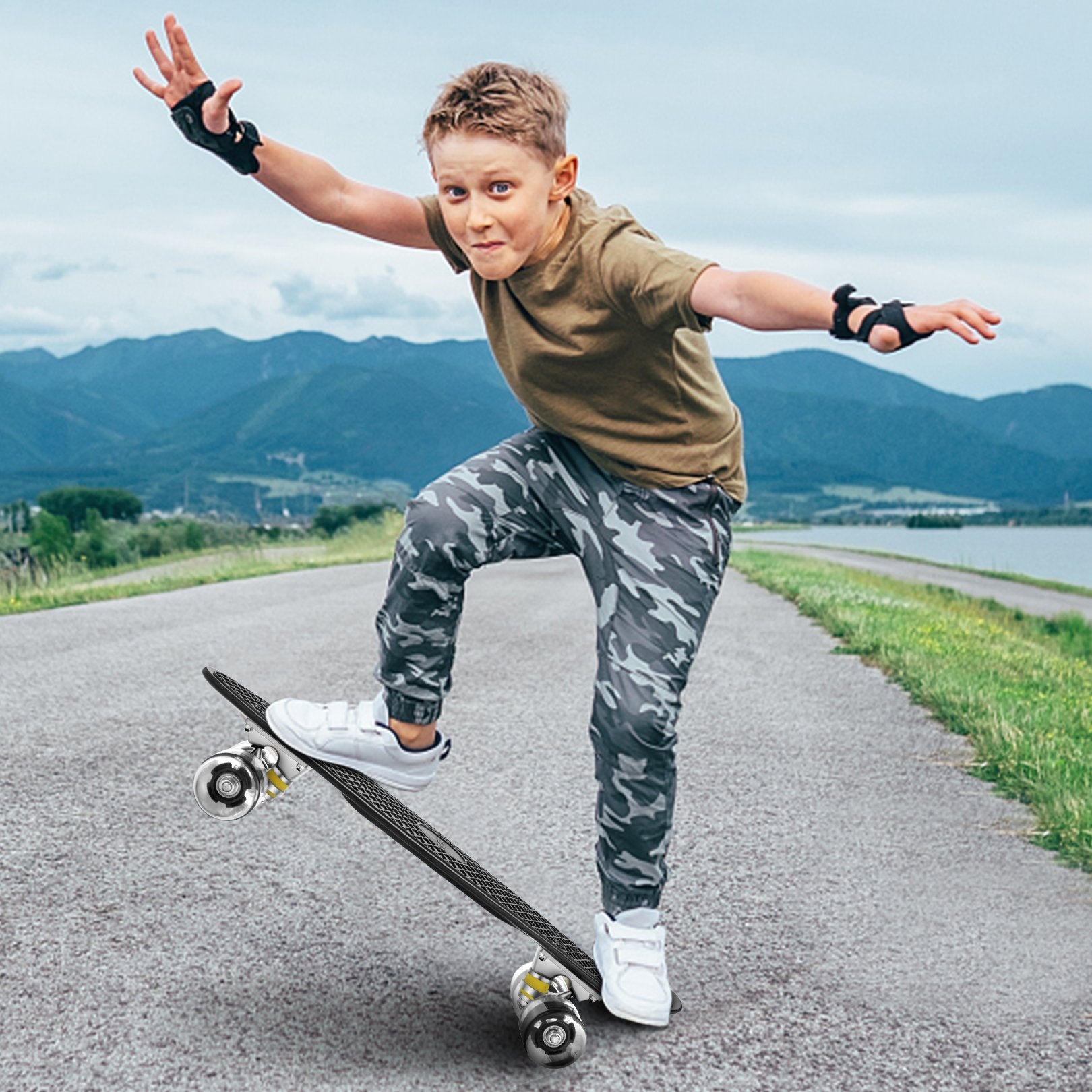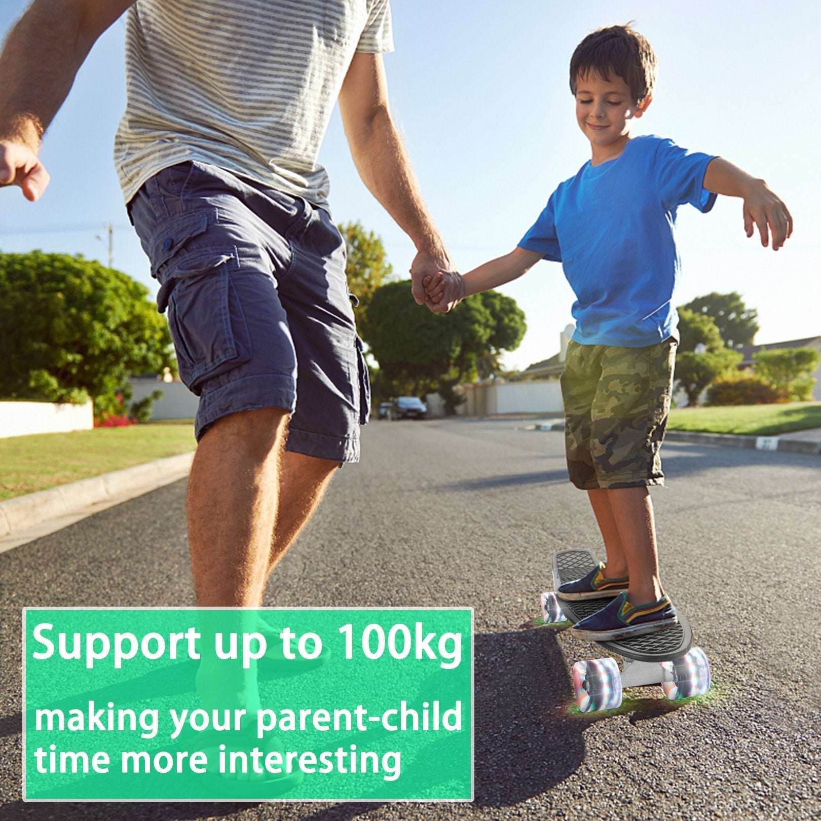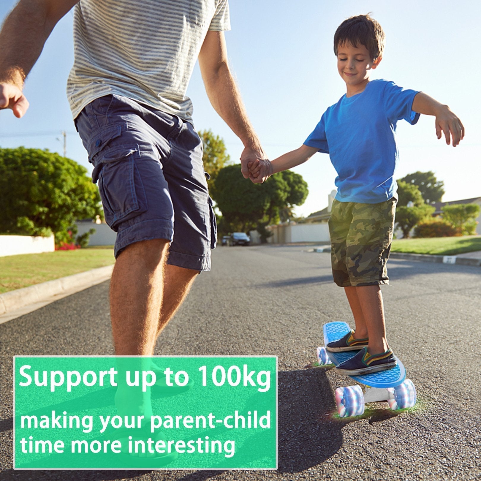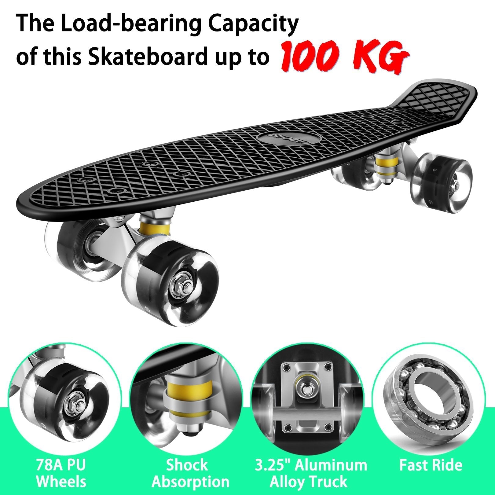 - Shock resistance enhanced 22x5.7inch wide bendable non-slip polypropylene deck.Supports riders up to 100kg, suit for kids, teens and adults.