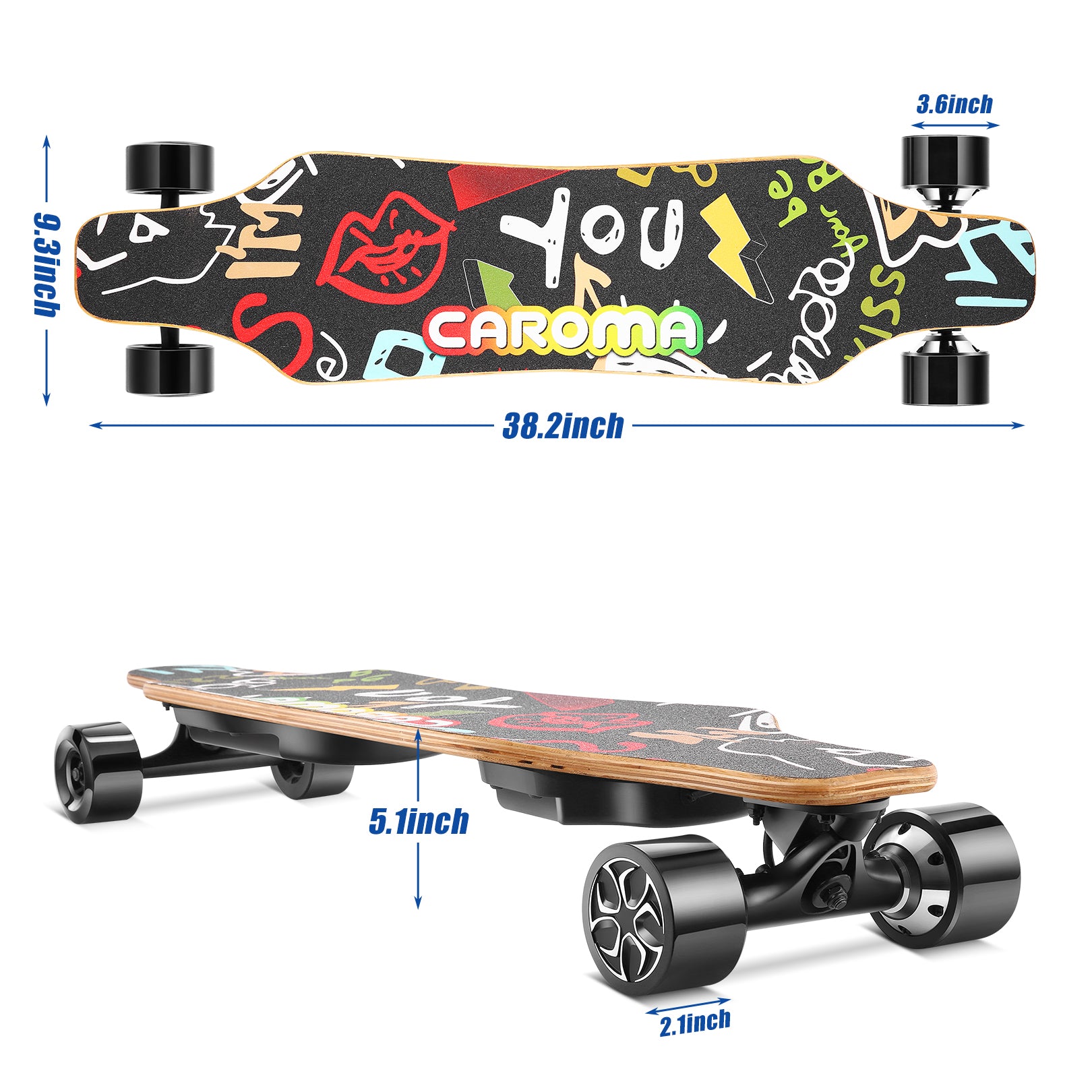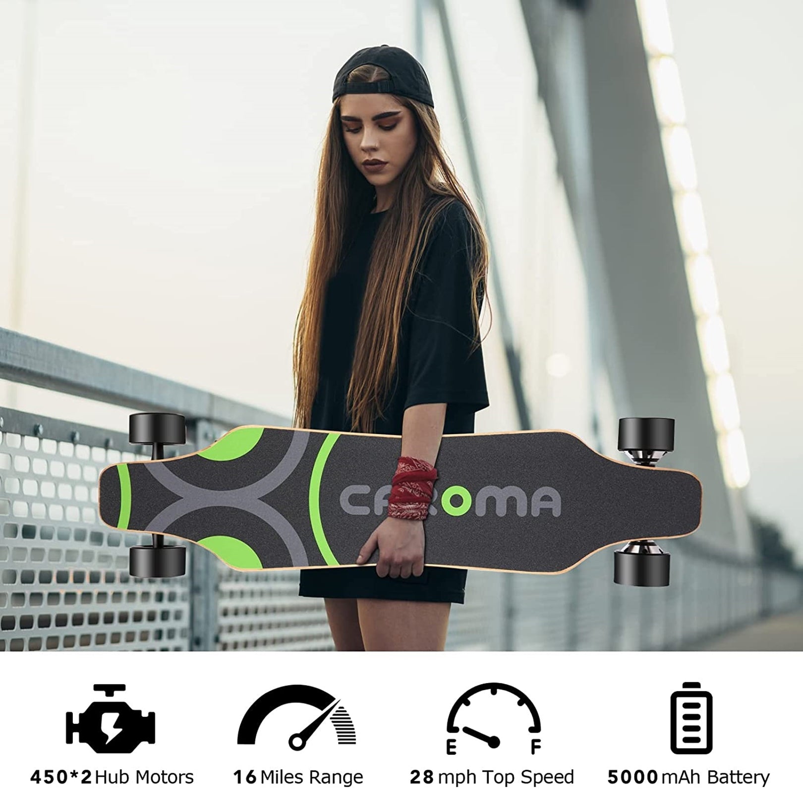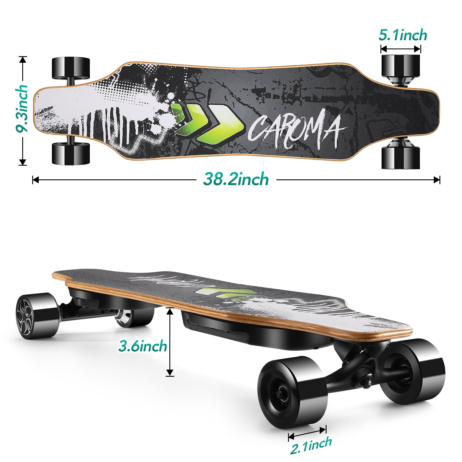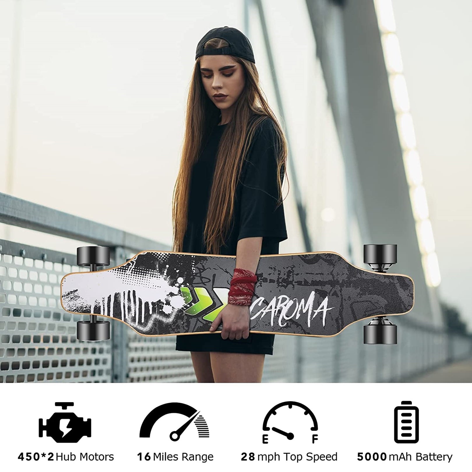 - [900W Powerful Dual Hub Motor] : Caroma 38" Electric Skateboard comes with 450W*2 powerful hub motors, that can adapt to diverse settings such as climbing hills, grass or riding inside the city with a top speed of 25 mph and range of 16 miles. With dual motors, it’s strong enough to climb a 25% steep hill.