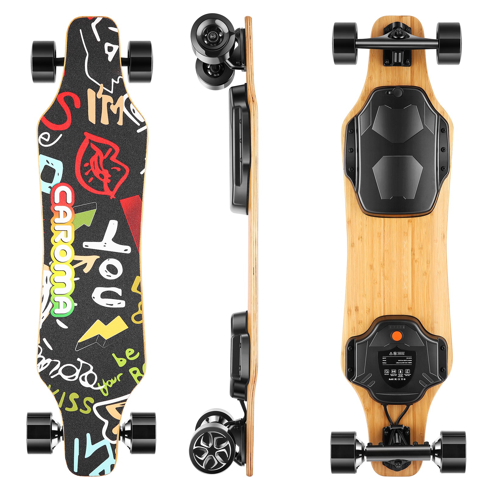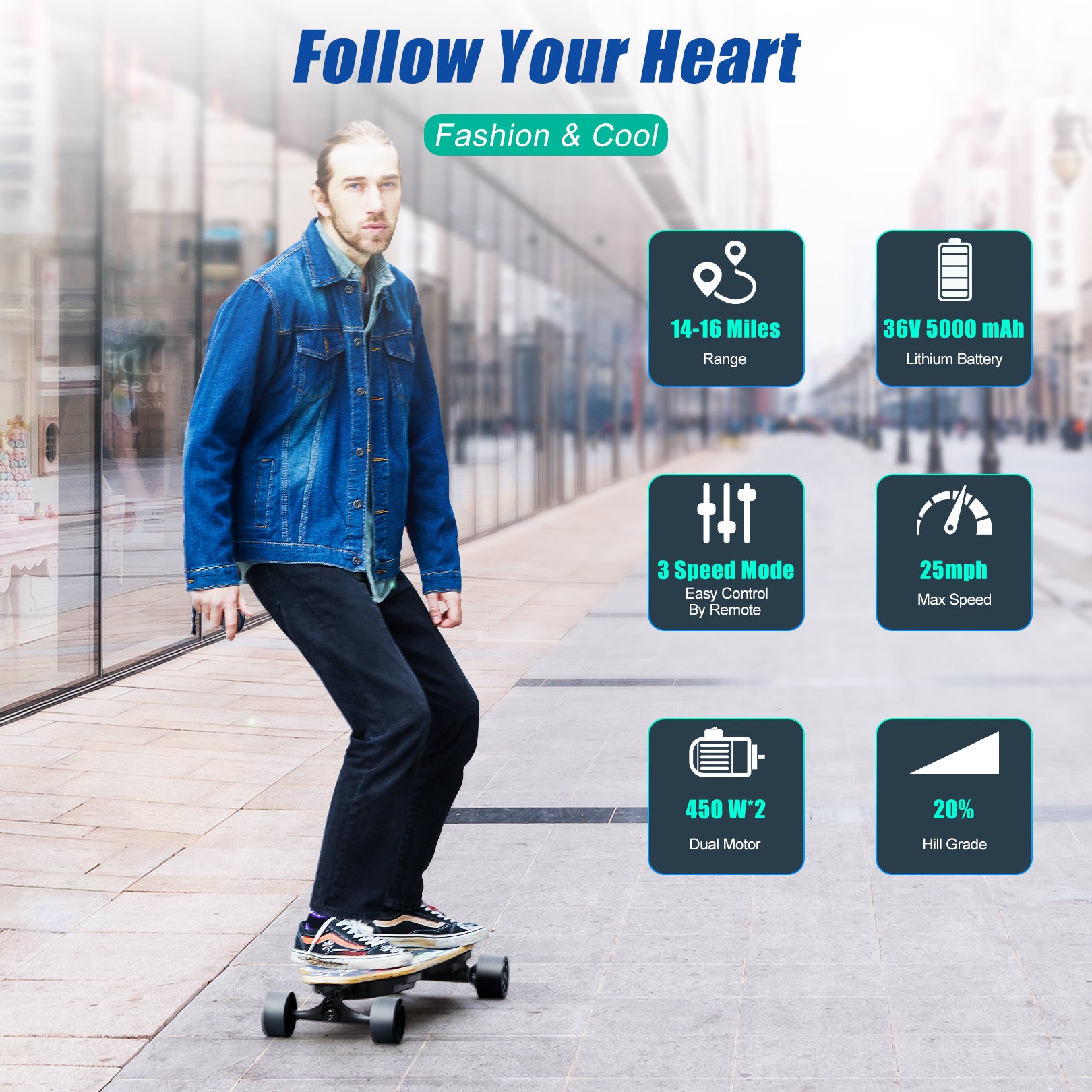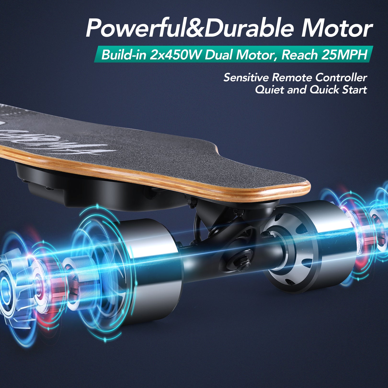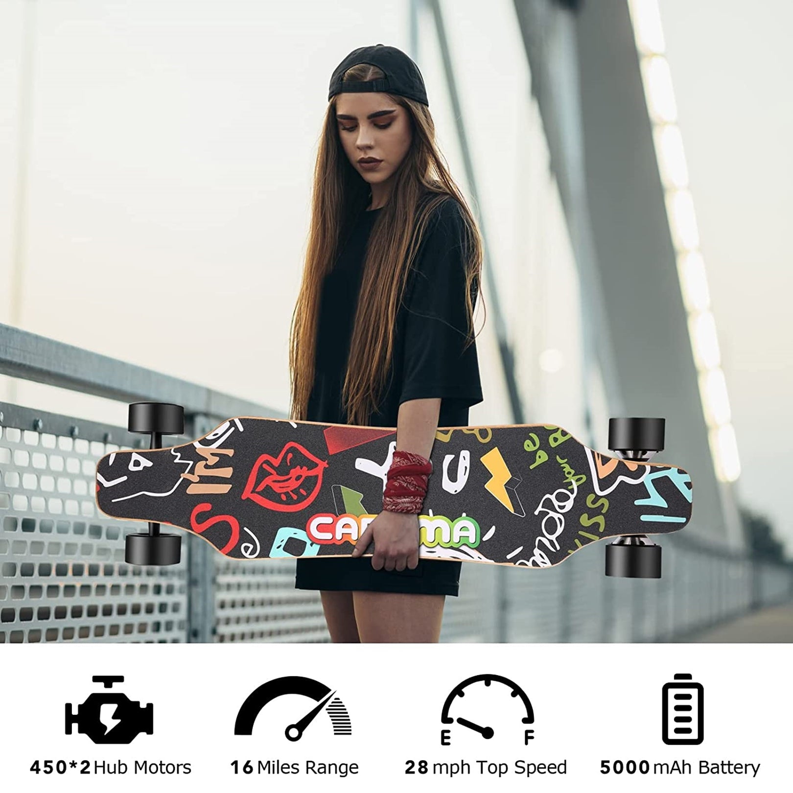 - [900W Powerful Dual Hub Motor] : Caroma 38" Electric Skateboard comes with 450W*2 powerful hub motors, that can adapt to diverse settings such as climbing hills, grass or riding inside the city with a top speed of 25 mph and range of 16 miles. With dual motors, it’s strong enough to climb a 25% steep hill.